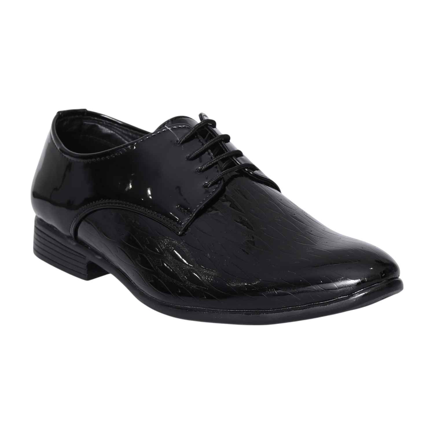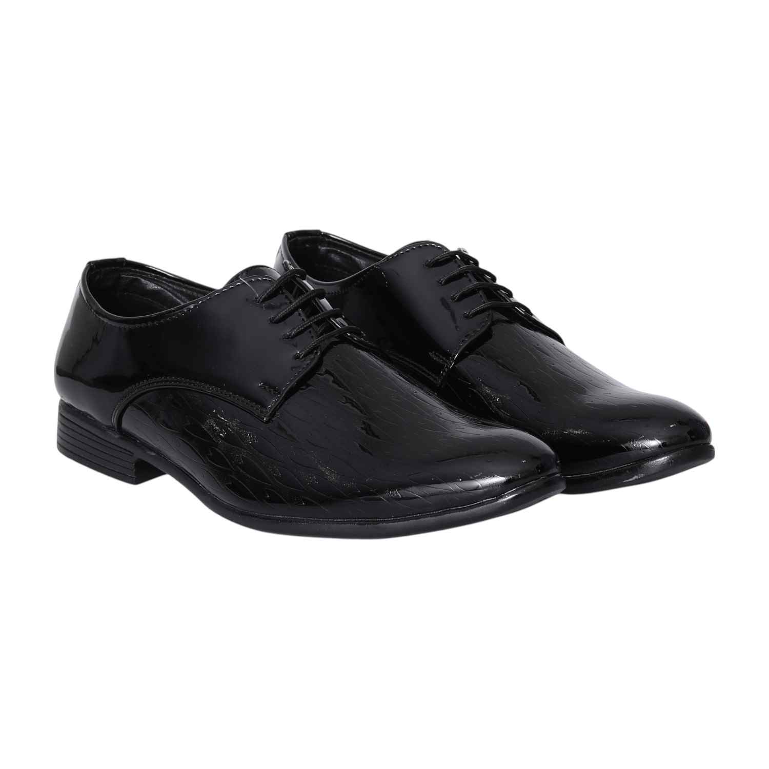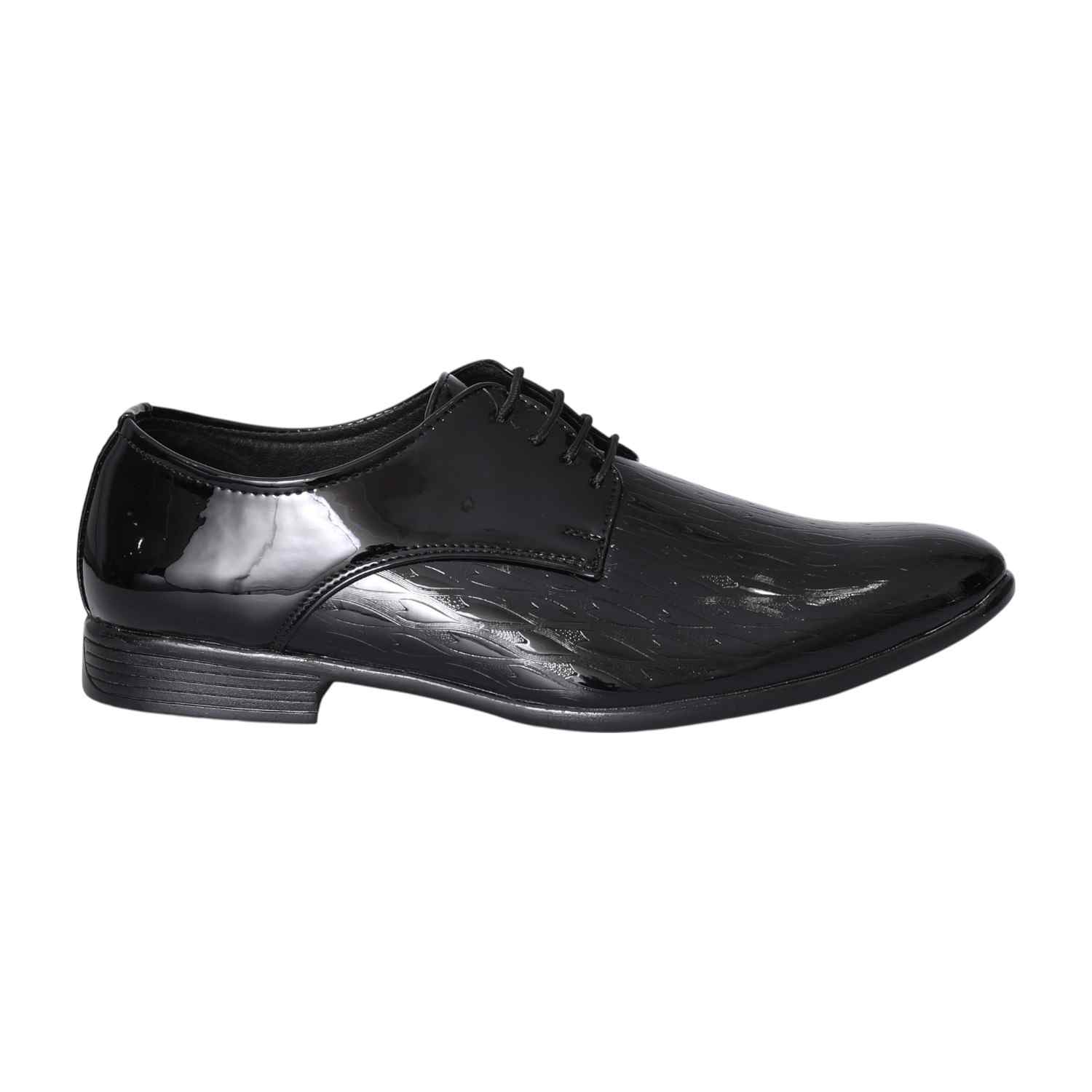 Command attention with our Black Sleek Formal Derbies, designed for the modern gentleman's wardrobe. The high-gloss patent finish of these lace-up shoes offers a striking visual appeal, perfect for making a sophisticated statement. Featuring a clean, plain-toe design and a subtle textured pattern, they combine classic elegance with contemporary flair. Ideal for pairing with suits, tuxedos, or any ensemble requiring a touch of refined brilliance.