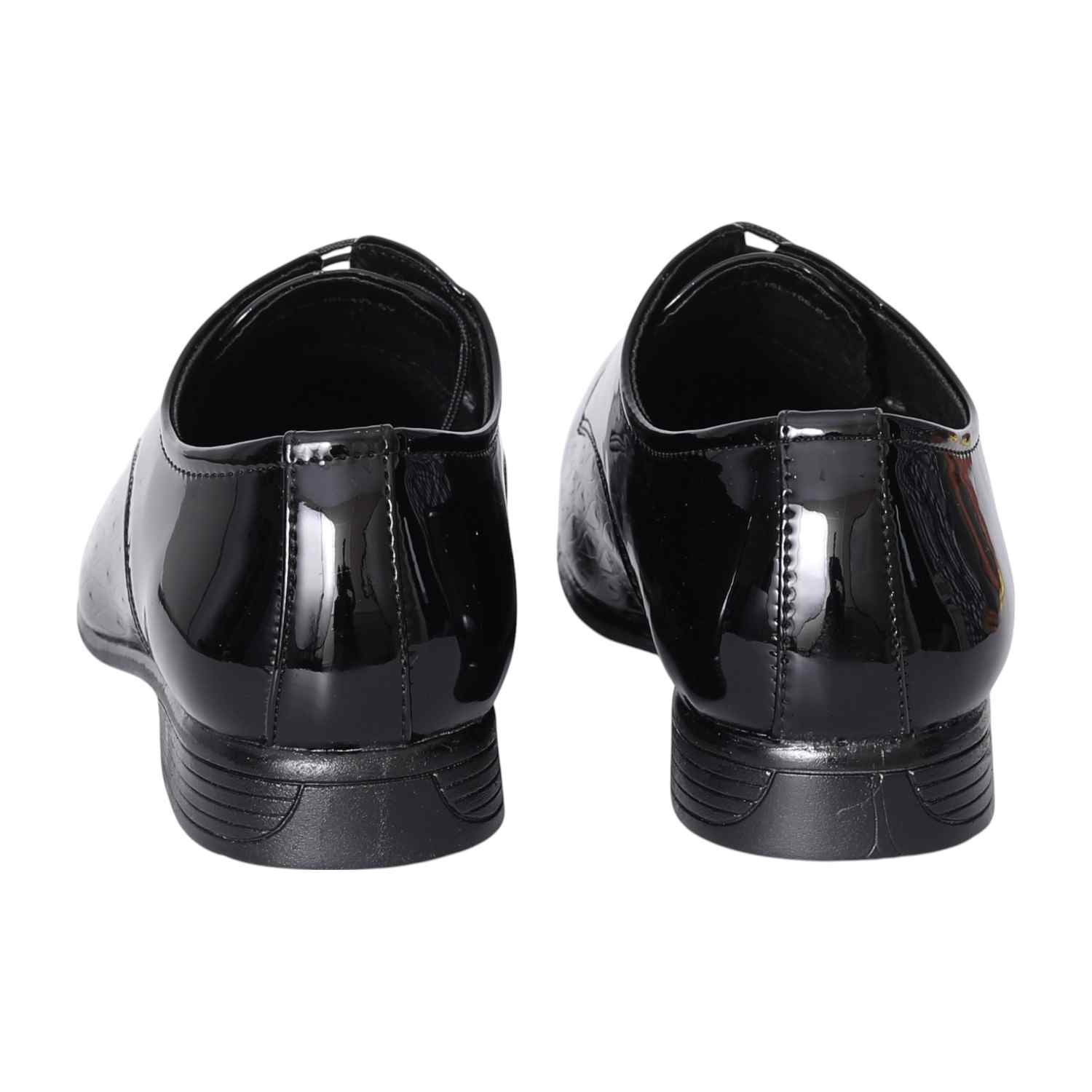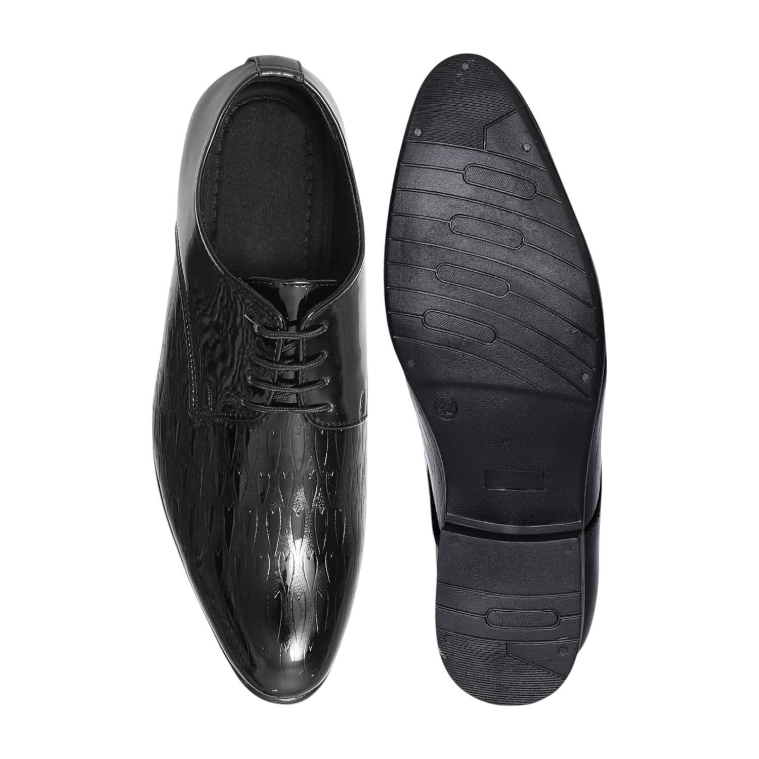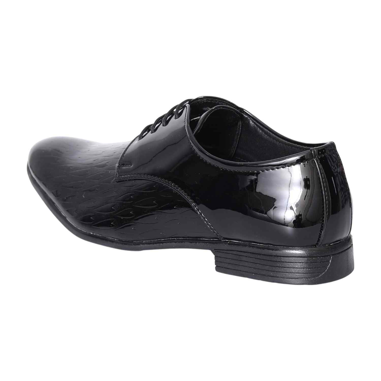 Command attention with our Black Sleek Formal Derbies, designed for the modern gentleman's wardrobe. The high-gloss patent finish of these lace-up shoes offers a striking visual appeal, perfect for making a sophisticated statement. Featuring a clean, plain-toe design and a subtle textured pattern, they combine classic elegance with contemporary flair. Ideal for pairing with suits, tuxedos, or any ensemble requiring a touch of refined brilliance.