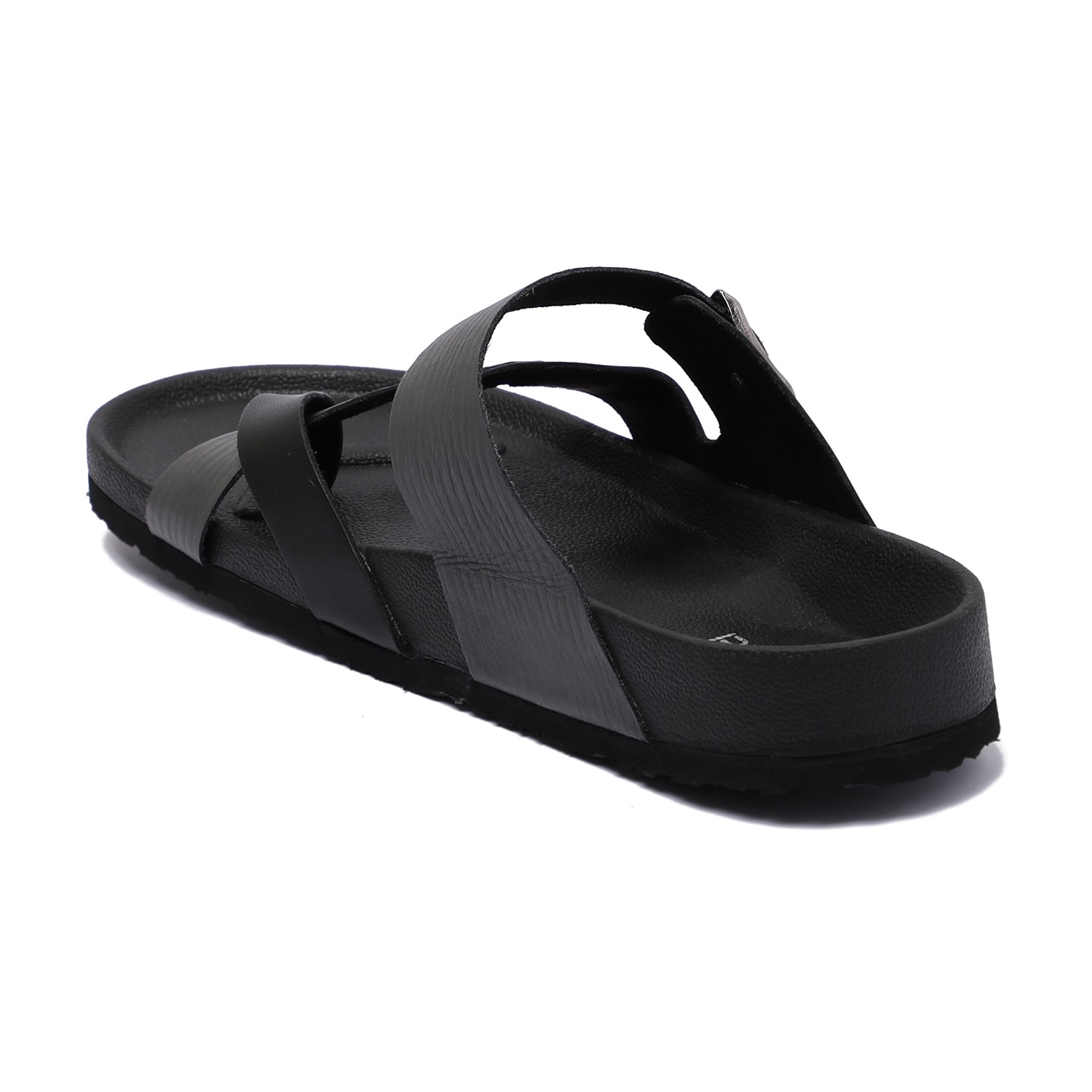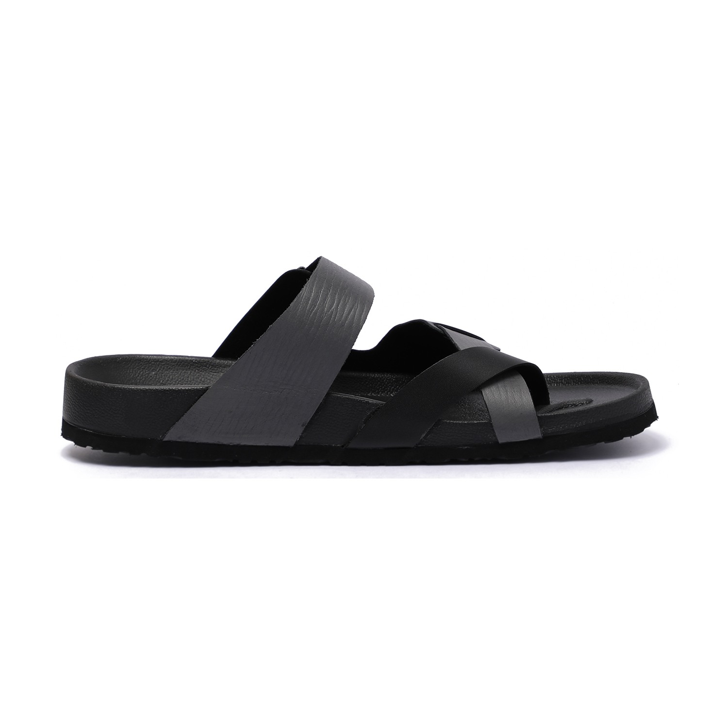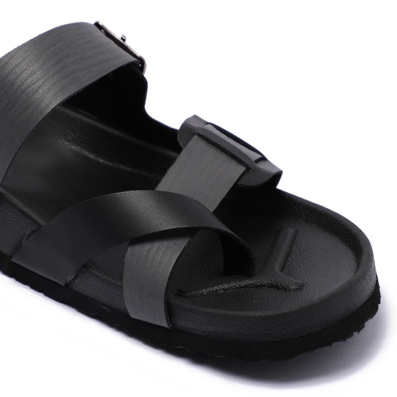 Step into effortless style with these sleek black slip-on chappal for men. Featuring a modern cross-strap design with a functional buckle for a custom fit, these chappal offer both fashion and function. The contoured footbed ensures optimal comfort, while the durable sole provides excellent grip for everyday use.