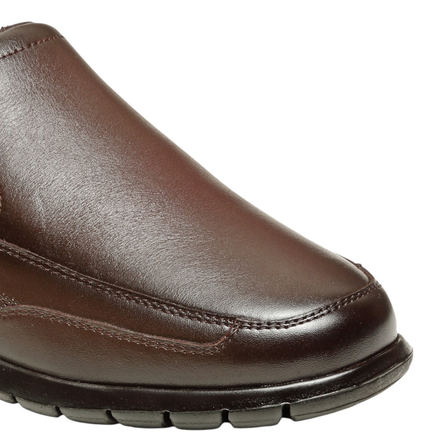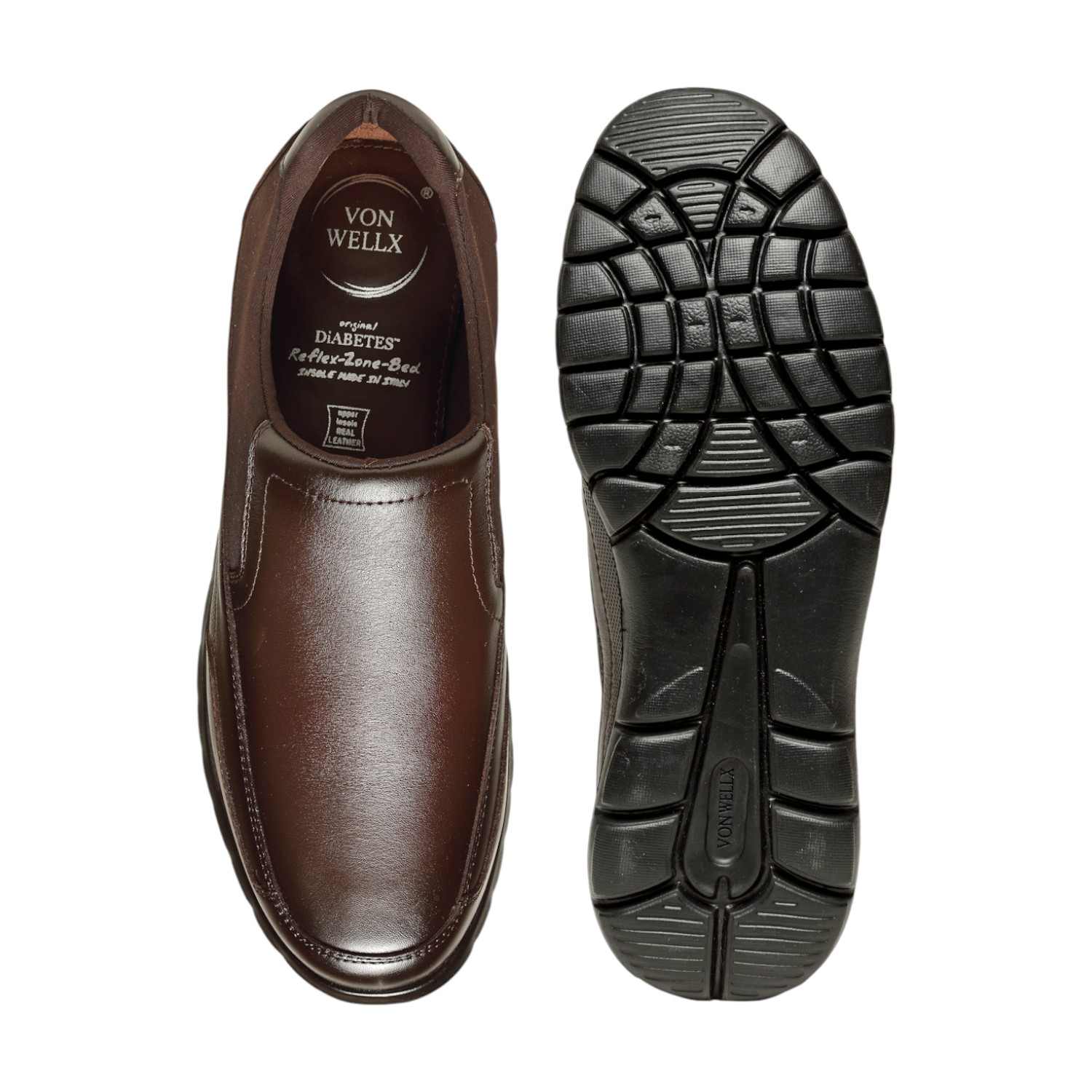 Prioritize foot health and comfort with these men's brown leather slip-on shoes from Von Wellx Germany. Specifically designed with the "Original Diabetes Reflex-Zone-Bed" – an internationally patented insole made in Italy – these shoes provide specialized therapeutic support. Crafted from soft, genuine leather, they offer a comfortable fit for sensitive feet. The flexible, shock-absorbing outsole ensures stability and ease of movement, making them an ideal choice for daily wear, especially for those seeking enhanced foot care.