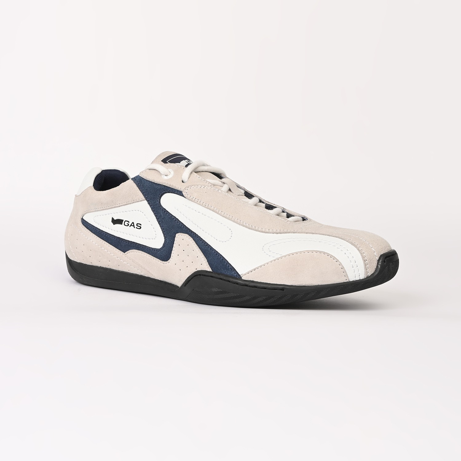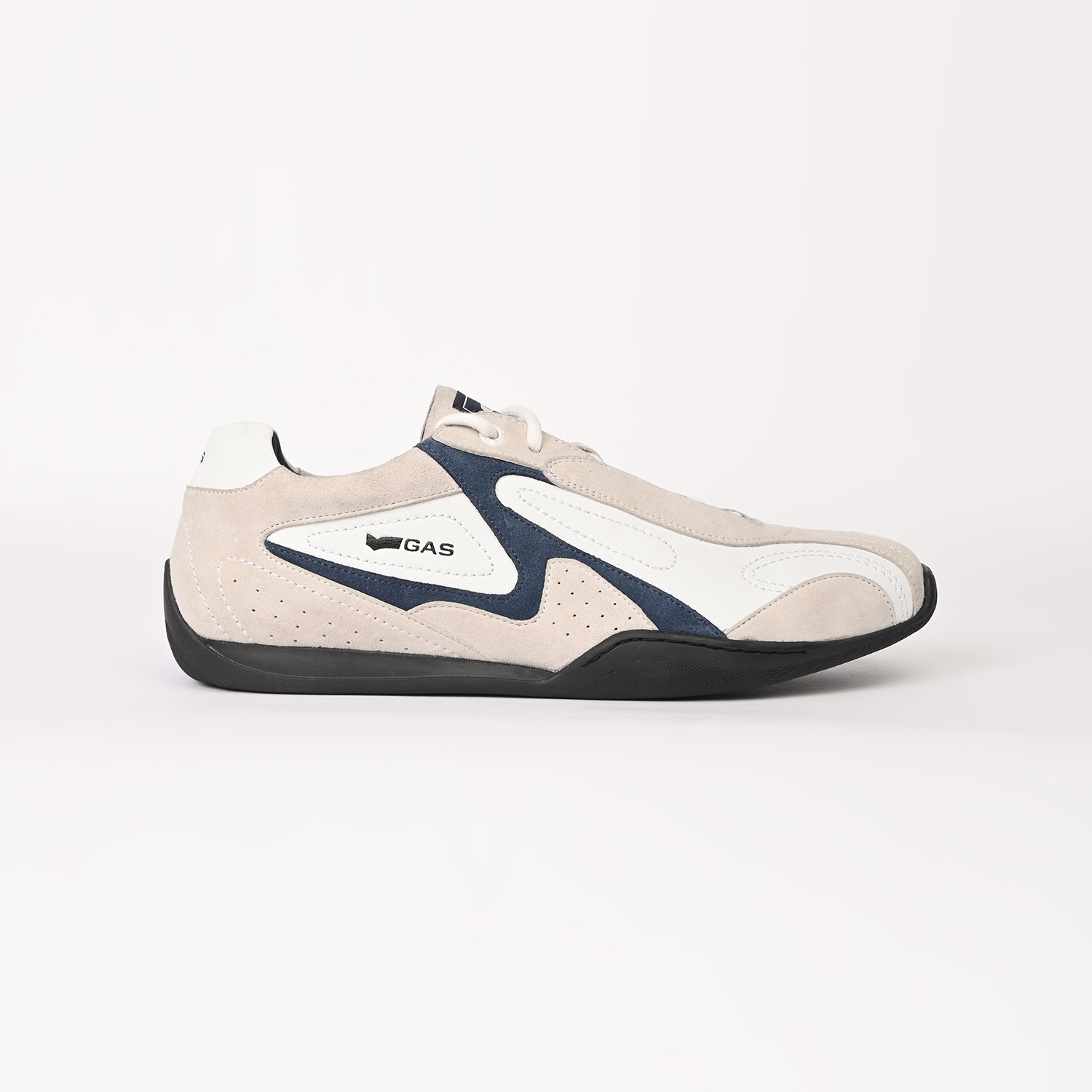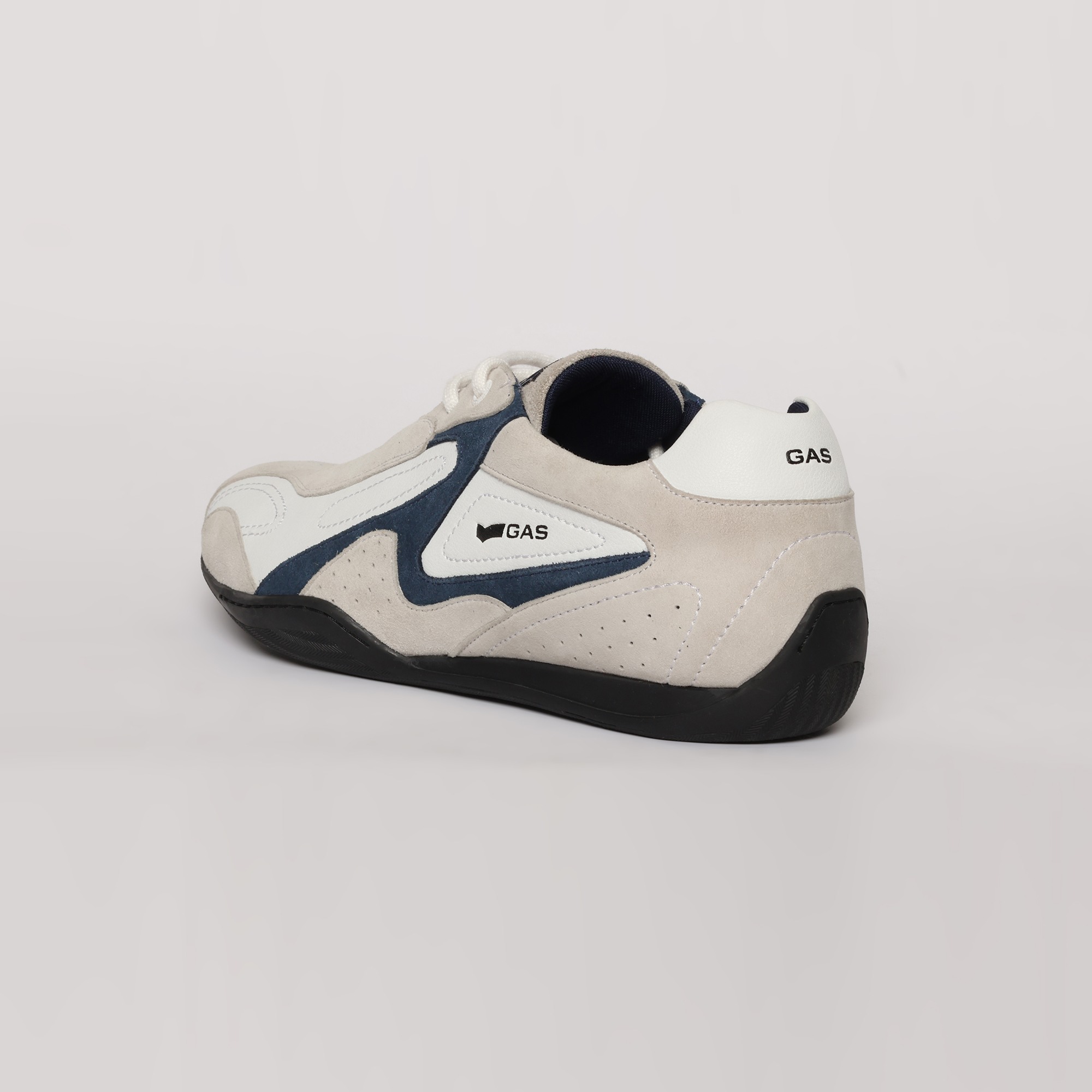 Drift-X is a sleek casual lace-up sneaker crafted in white and navy leather with subtle suede accents, defined by a clean, low-profile silhouette and refined panel detailing for a modern, dynamic finish.