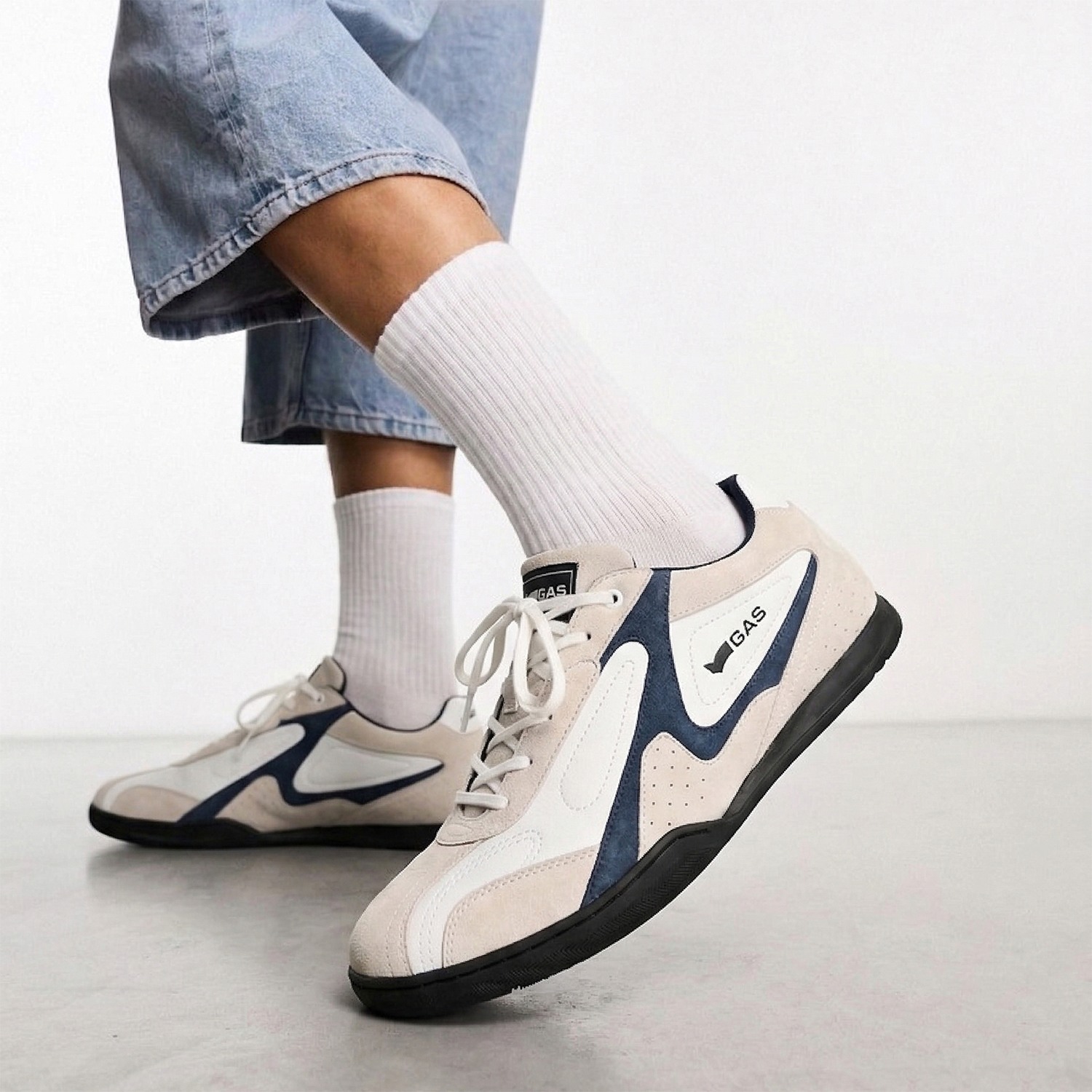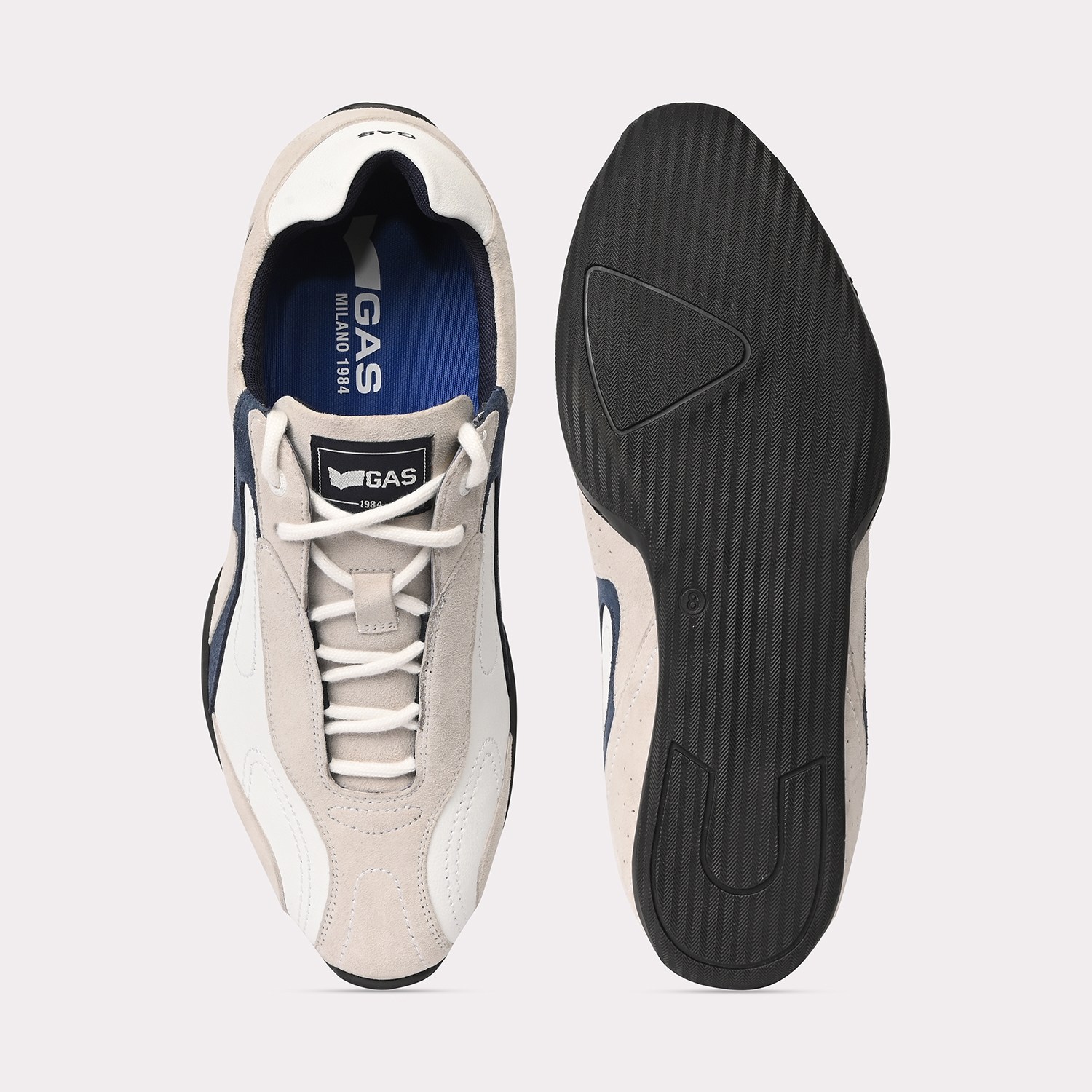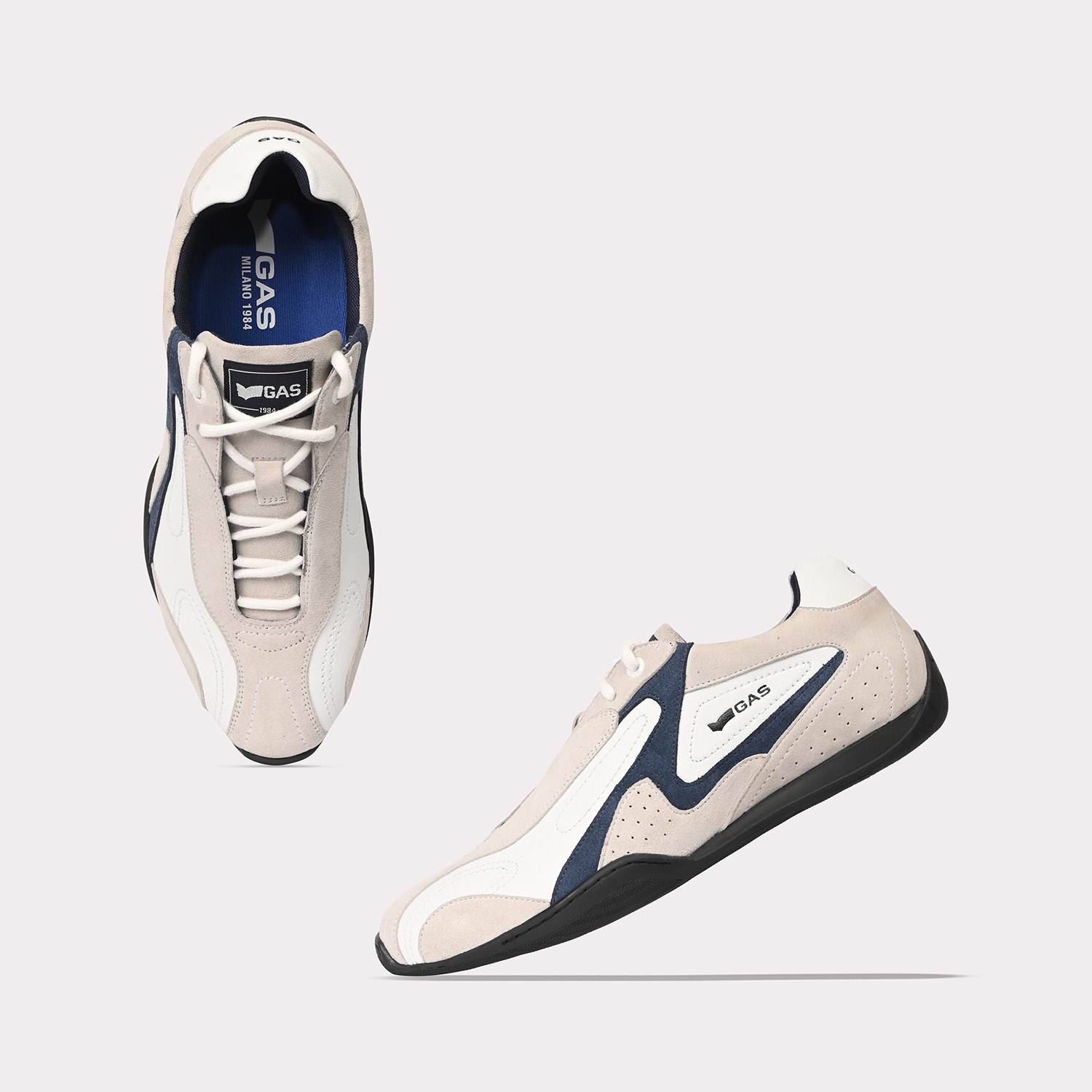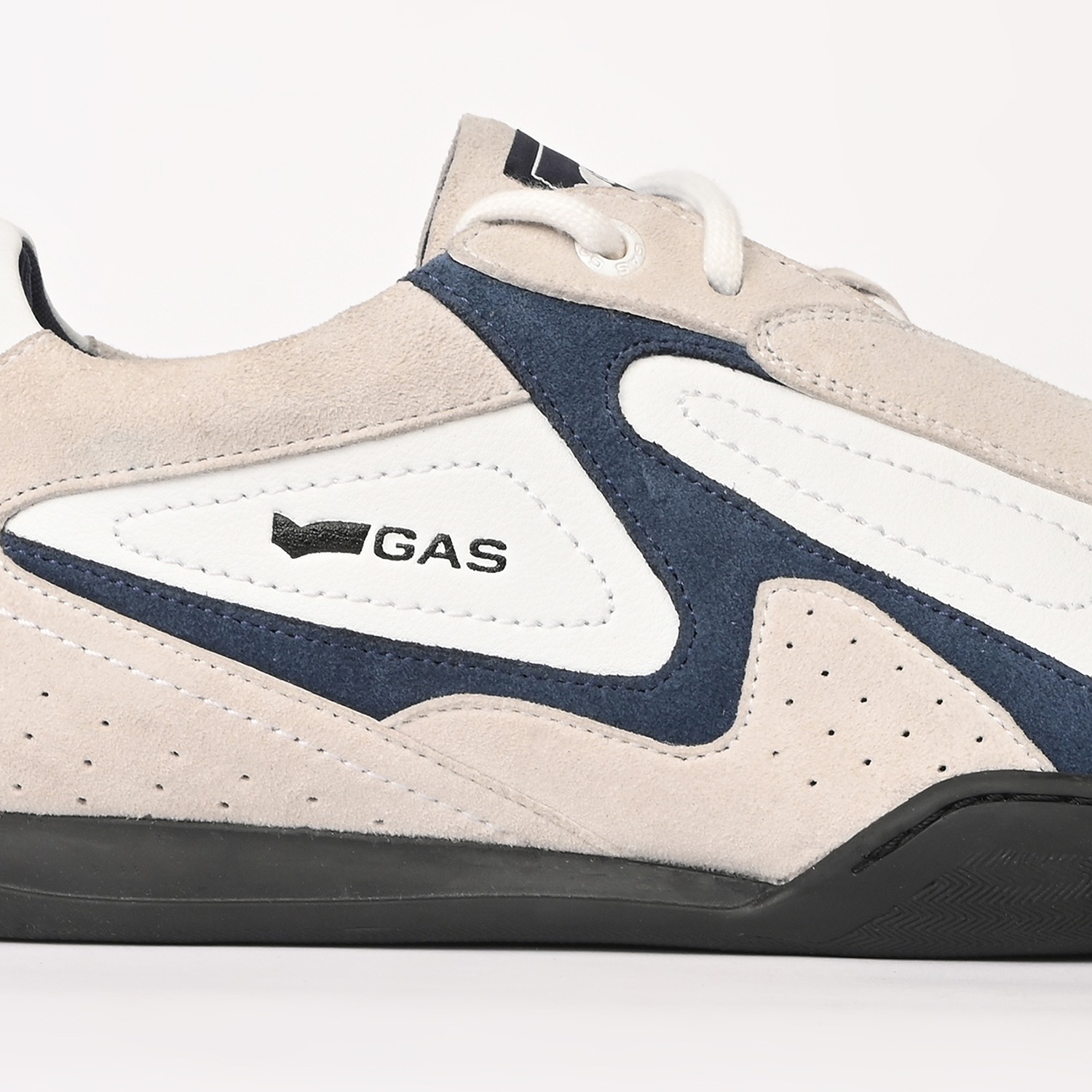 Drift-X is a sleek casual lace-up sneaker crafted in white and navy leather with subtle suede accents, defined by a clean, low-profile silhouette and refined panel detailing for a modern, dynamic finish.