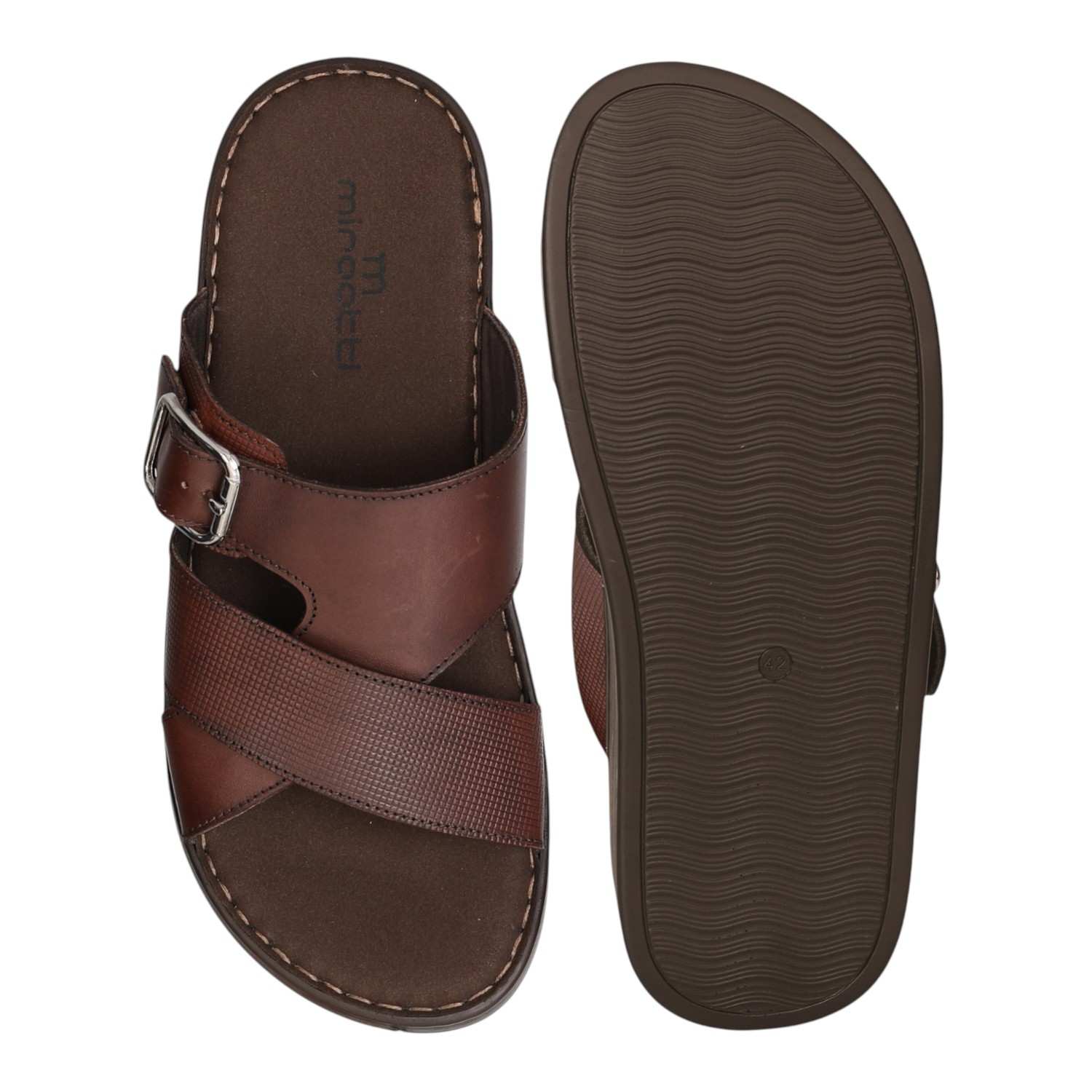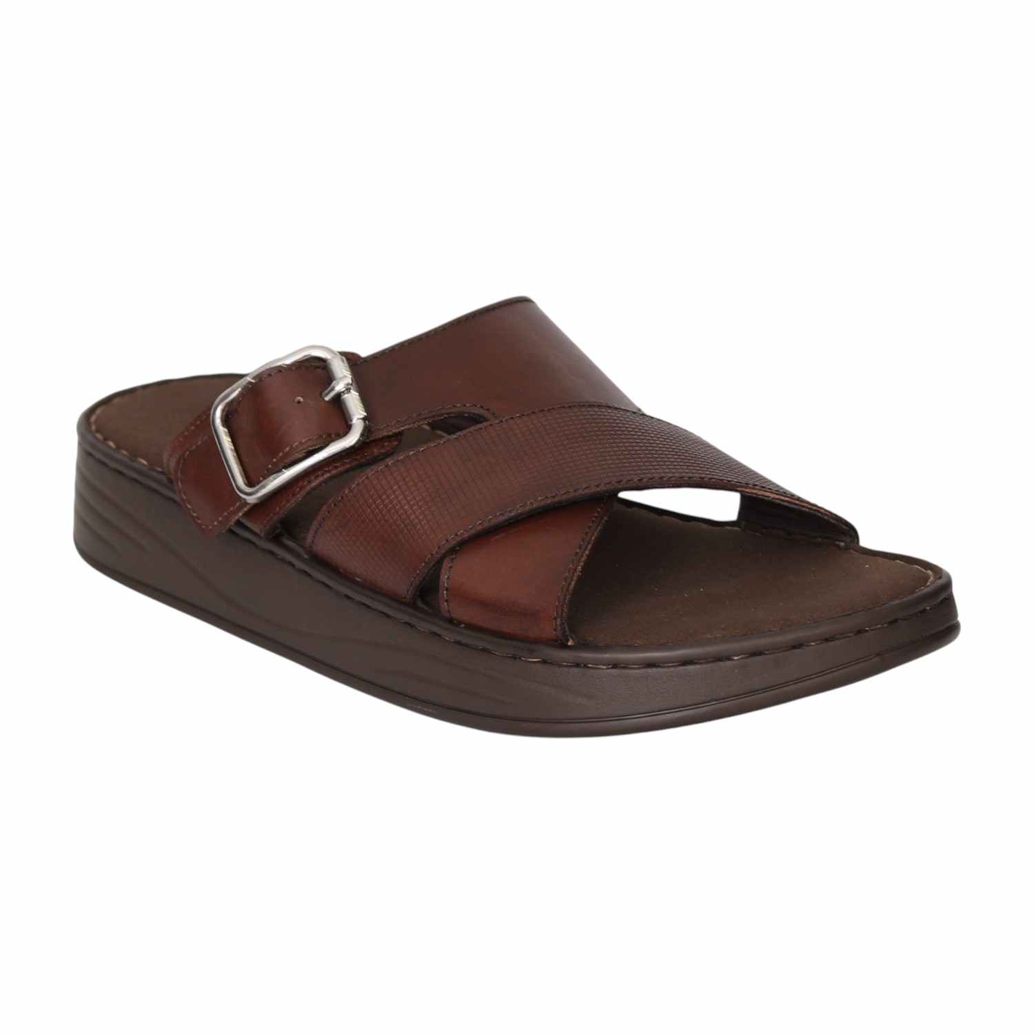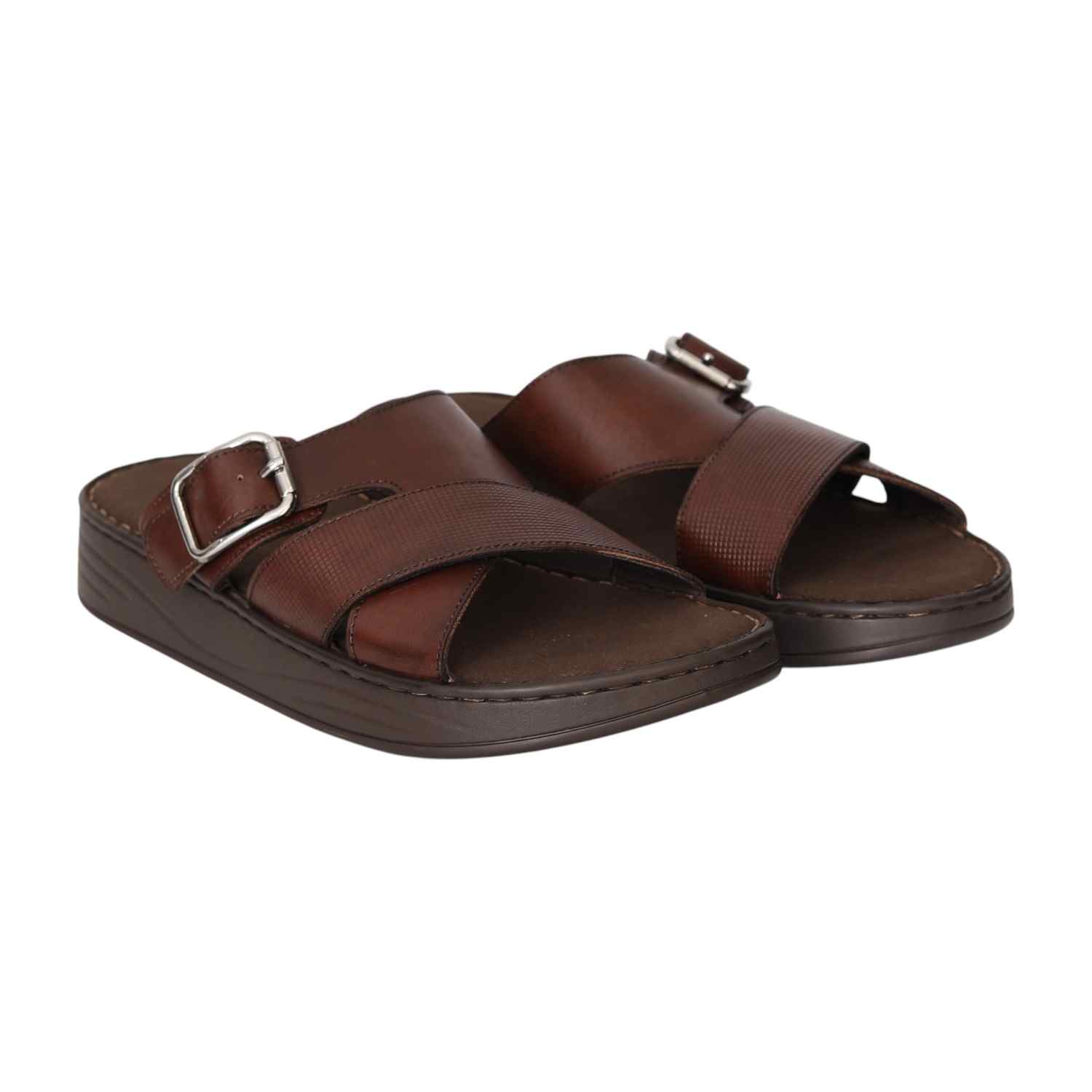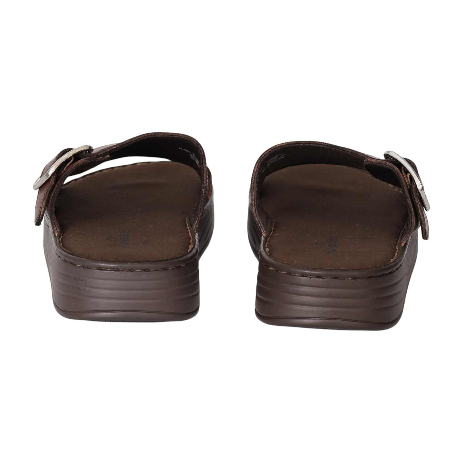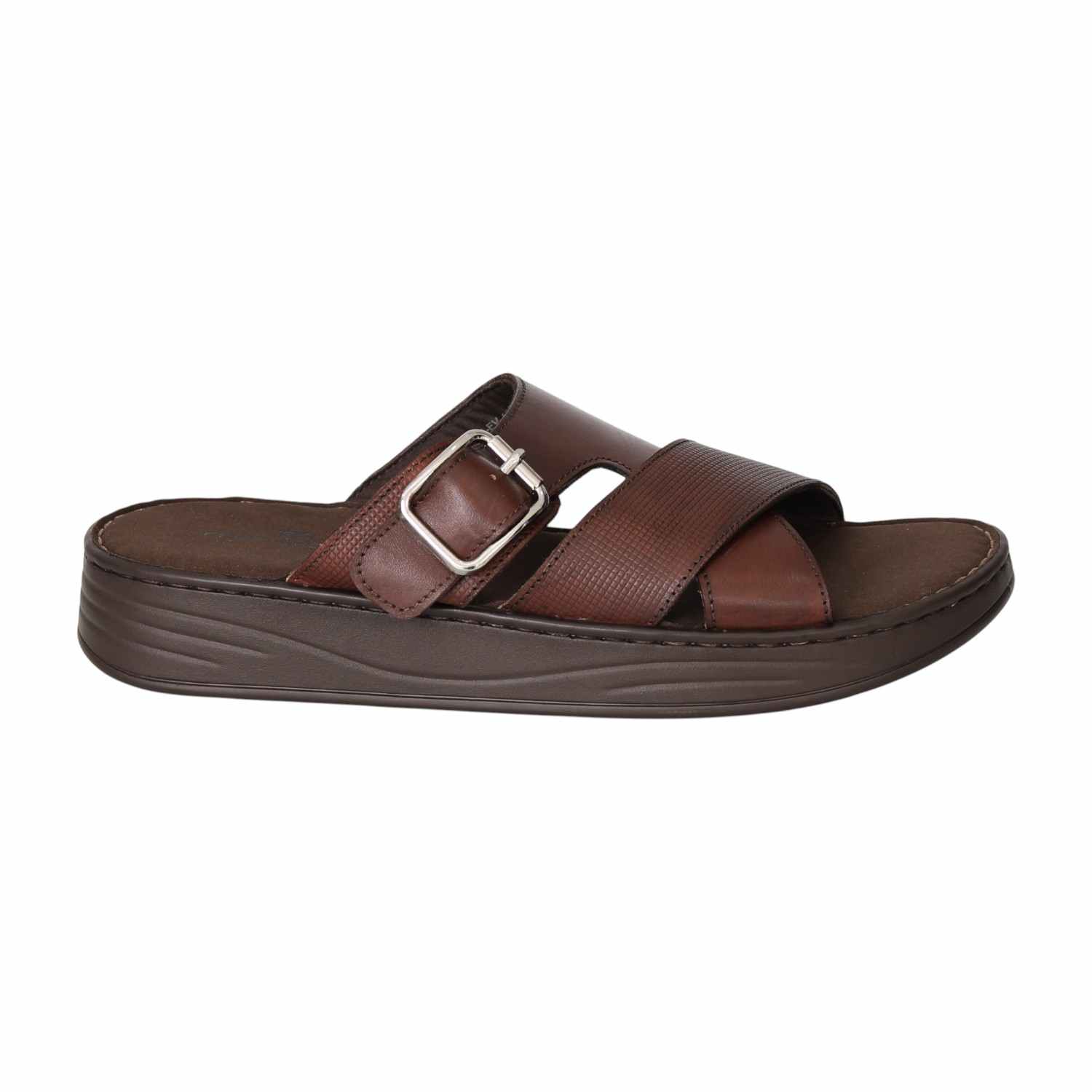A stylish sandal with a rustic pine tone, featuring a bold buckle accent for a refined yet casual look. The wide straps and cushioned sole provide excellent support, making it ideal for everyday wear.