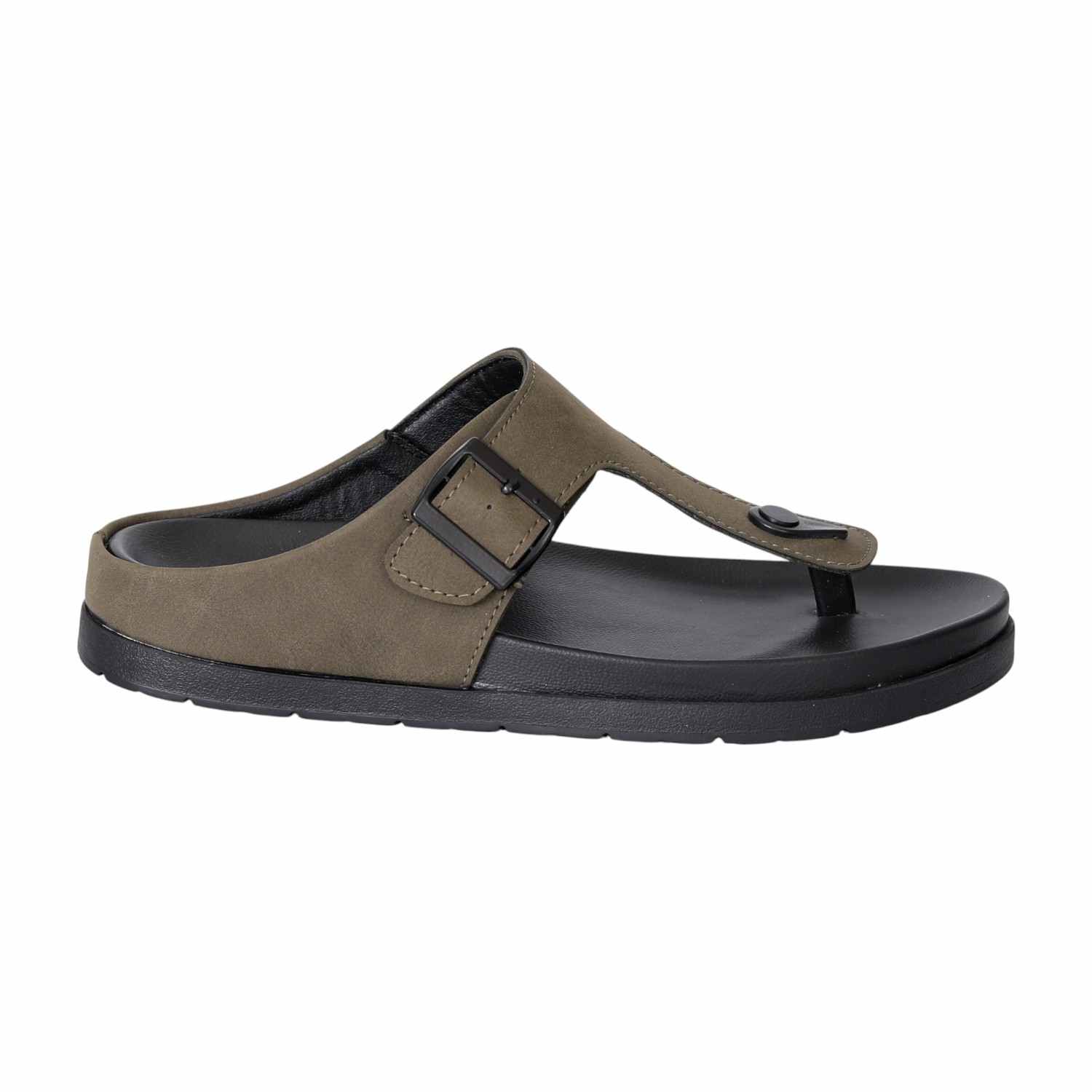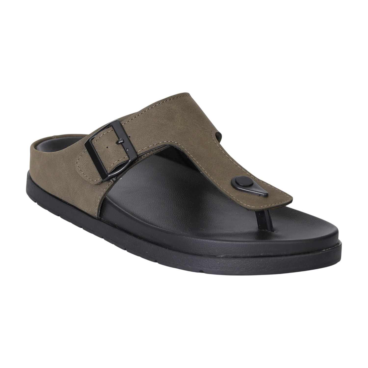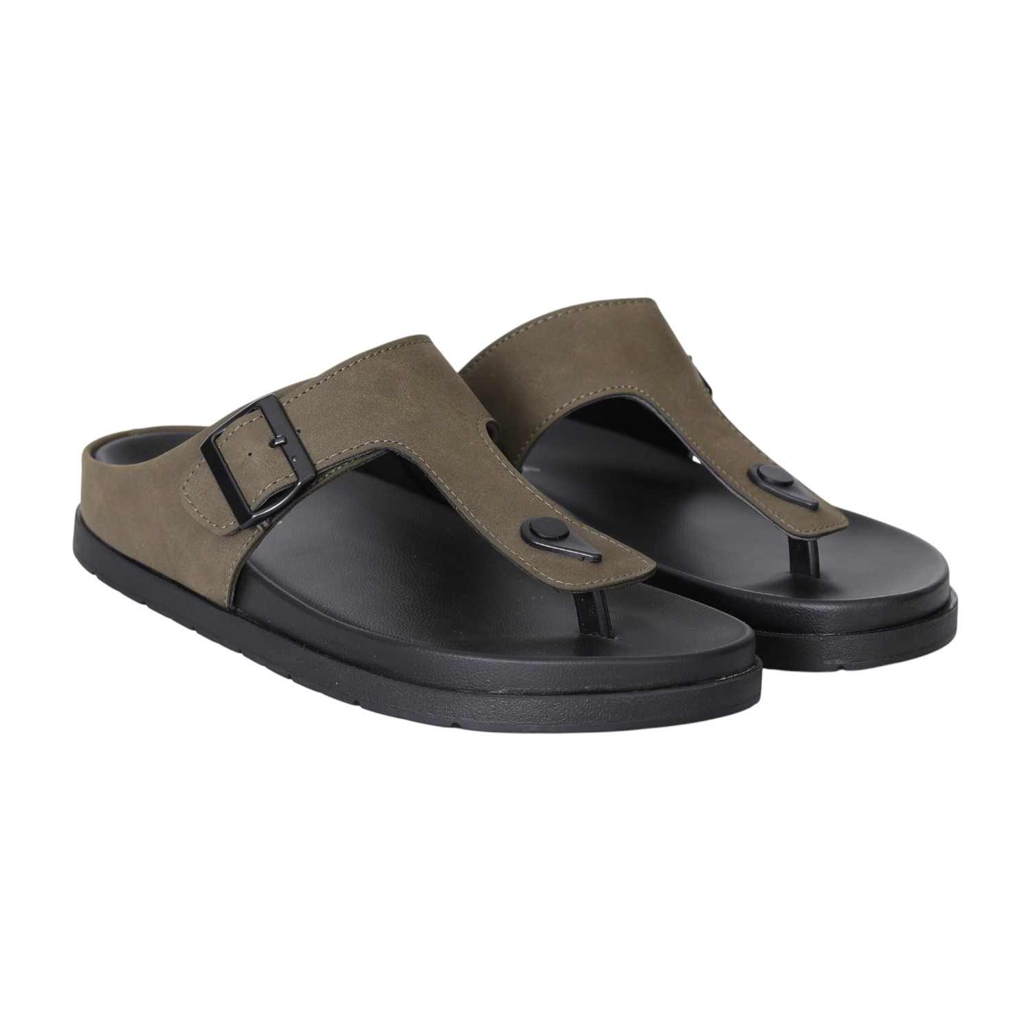 These sandals showcase a refined toe-post silhouette with a soft olive green upper and a bold black buckle for an elevated casual look. The contoured black footbed ensures cushioned comfort, while the durable outsole provides everyday grip and support. A versatile piece with earthy tones and modern structure, ideal for daily wear.