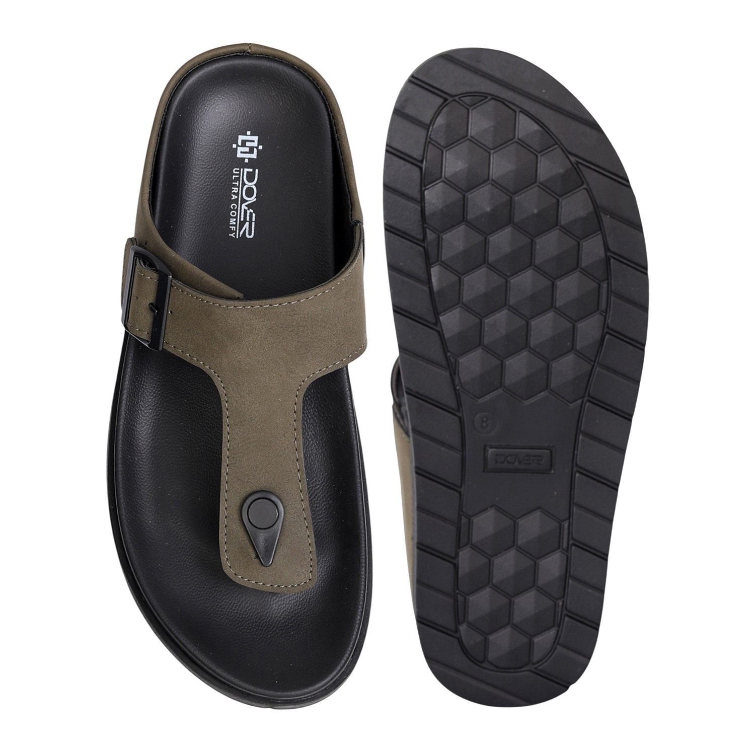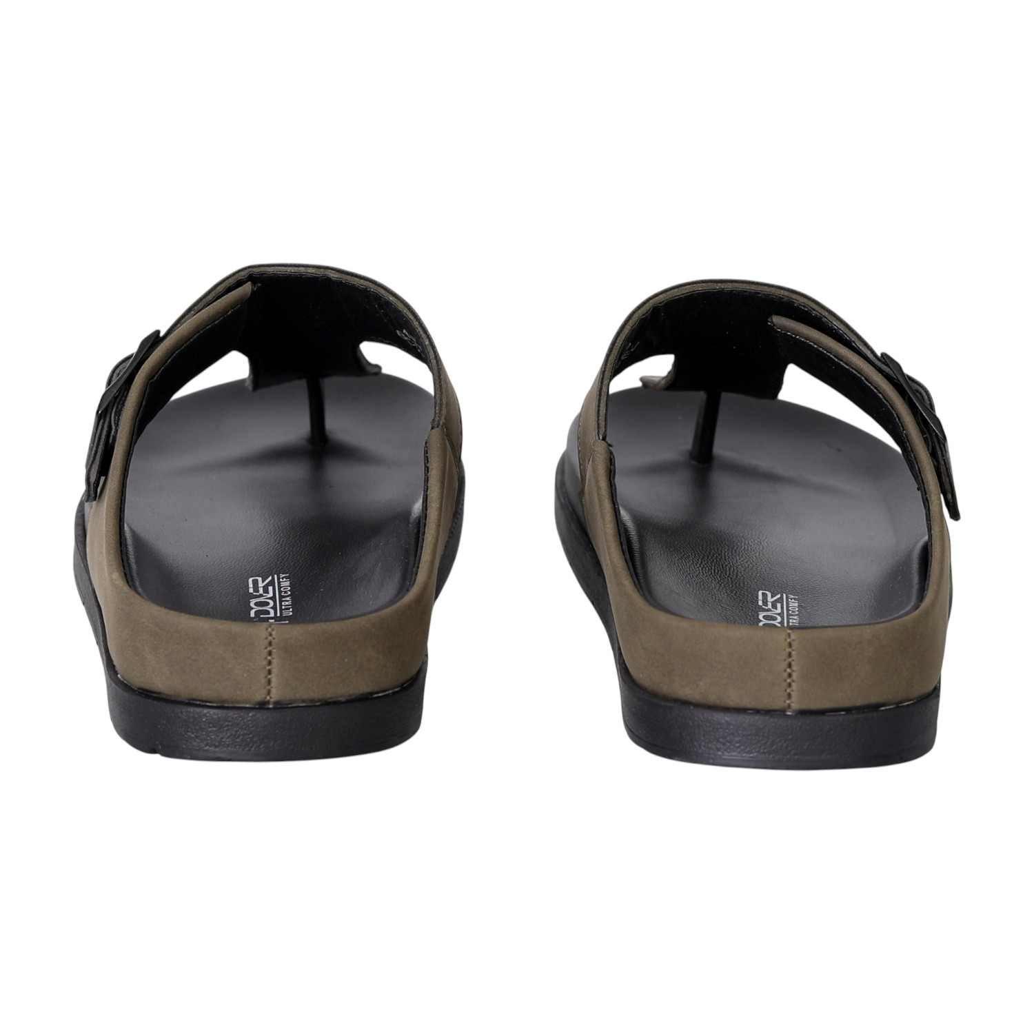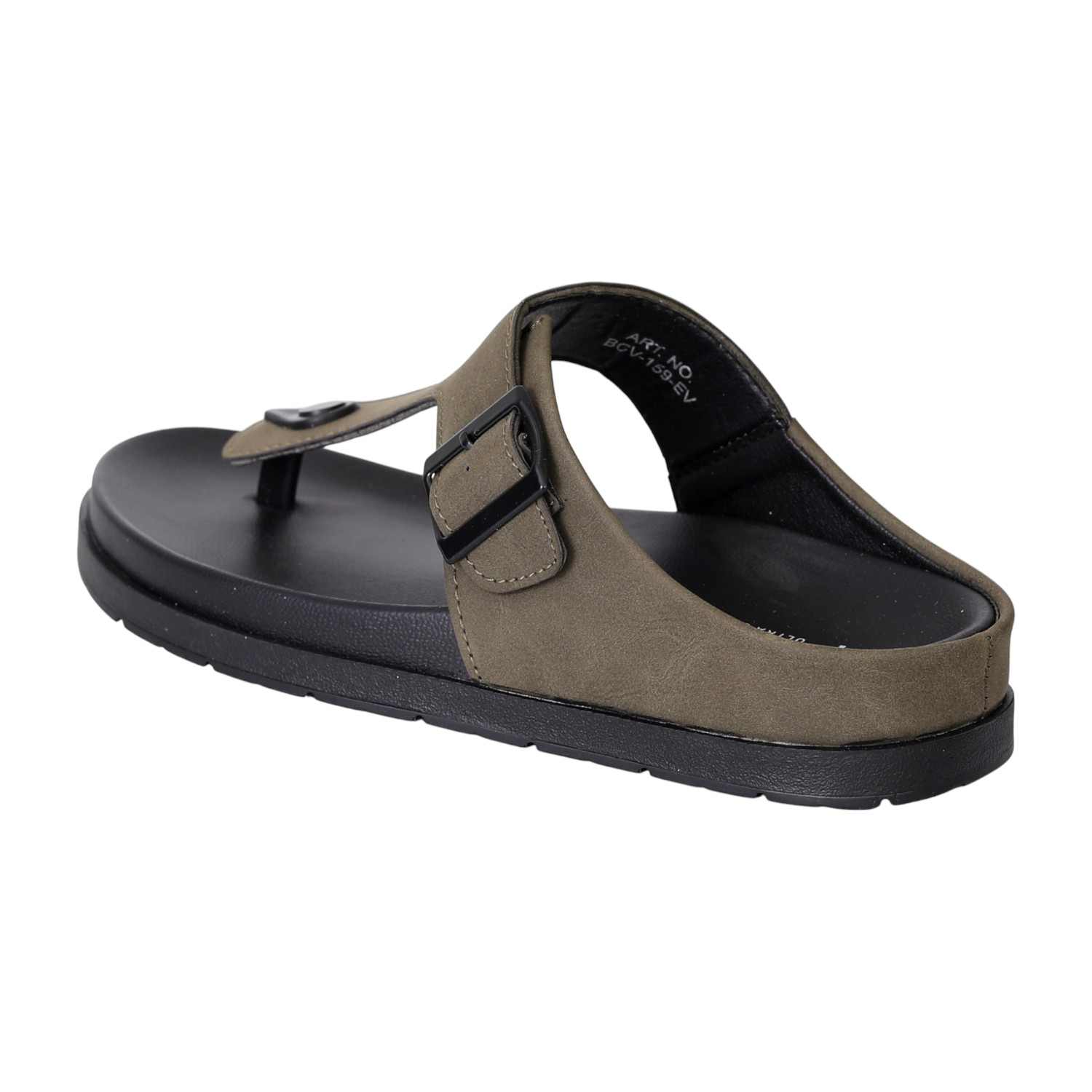 These sandals showcase a refined toe-post silhouette with a soft olive green upper and a bold black buckle for an elevated casual look. The contoured black footbed ensures cushioned comfort, while the durable outsole provides everyday grip and support. A versatile piece with earthy tones and modern structure, ideal for daily wear.