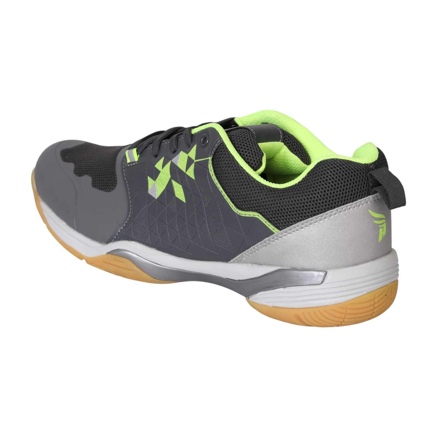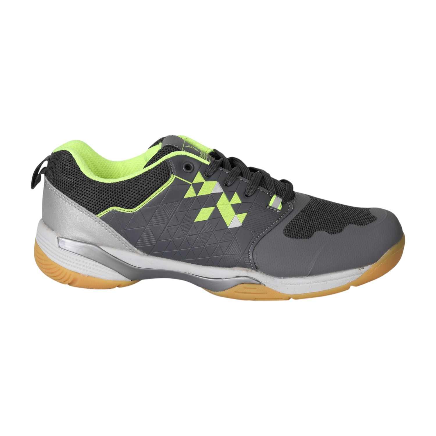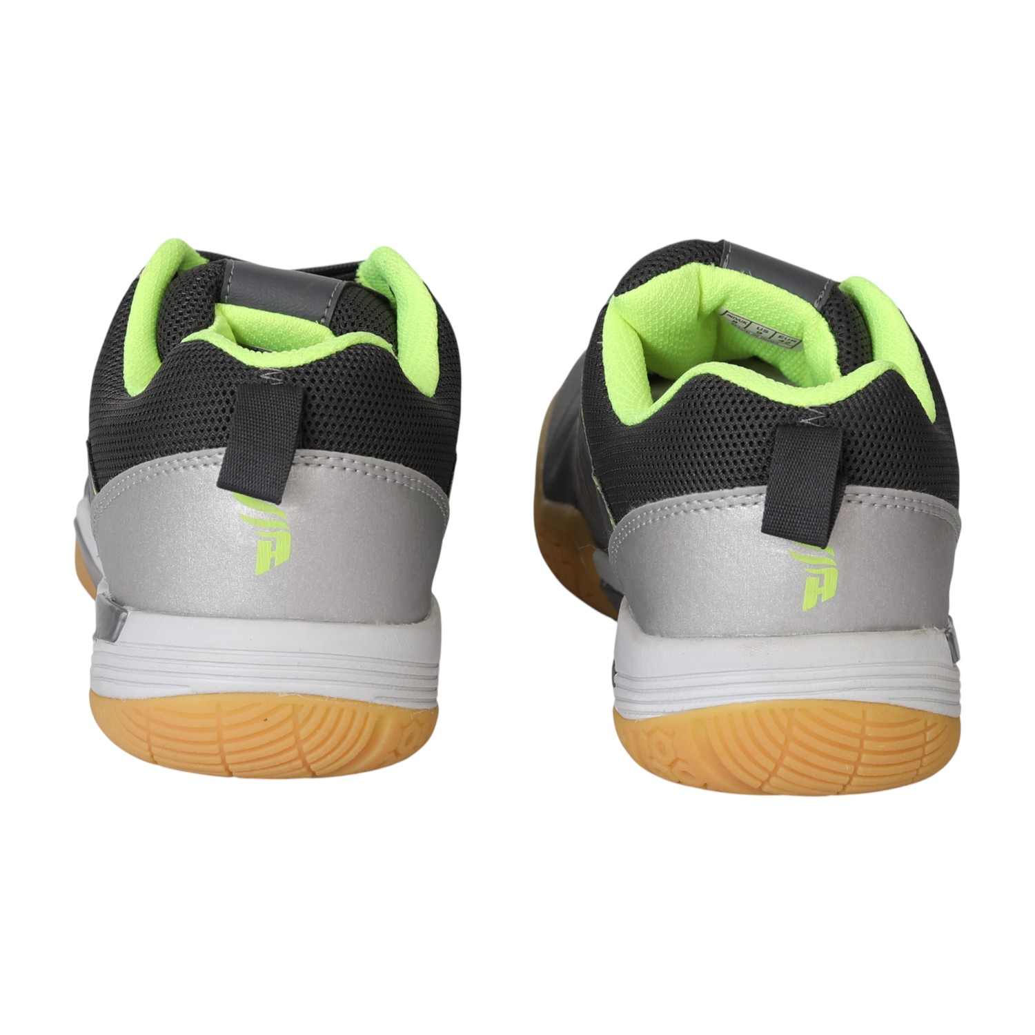 Designed for agility and control, these court sneakers feature a sleek grey upper with bold neon green accents and a geometric side pattern. The breathable mesh and flexible materials offer comfort and airflow, while the gum sole ensures excellent traction—perfect for fast-paced indoor sports or energetic streetwear looks.