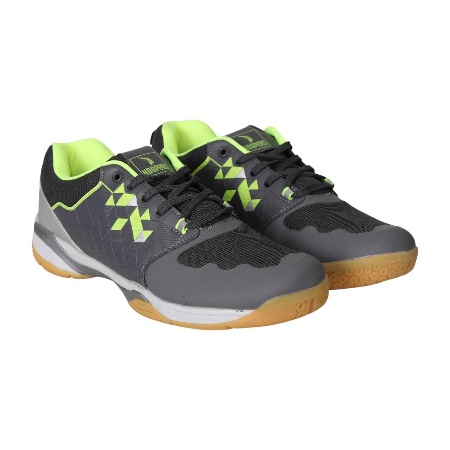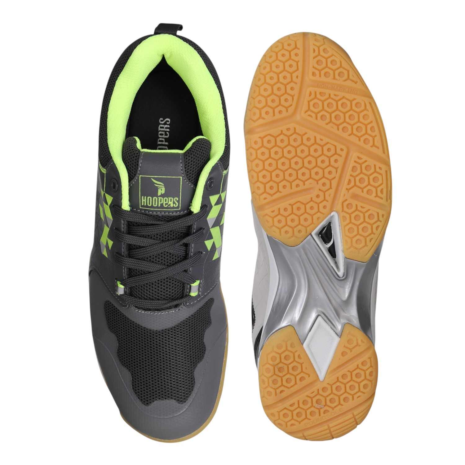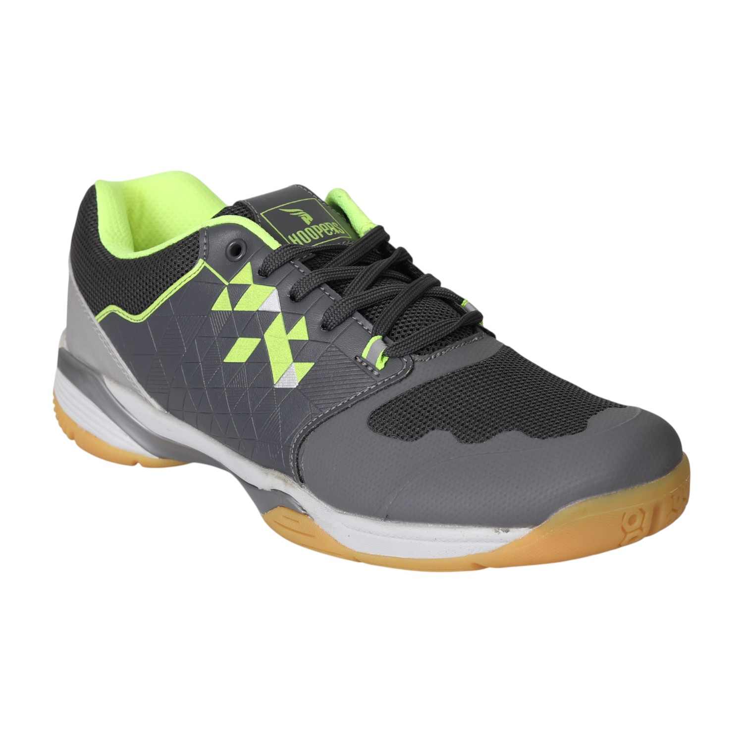 Designed for agility and control, these court sneakers feature a sleek grey upper with bold neon green accents and a geometric side pattern. The breathable mesh and flexible materials offer comfort and airflow, while the gum sole ensures excellent traction—perfect for fast-paced indoor sports or energetic streetwear looks.
