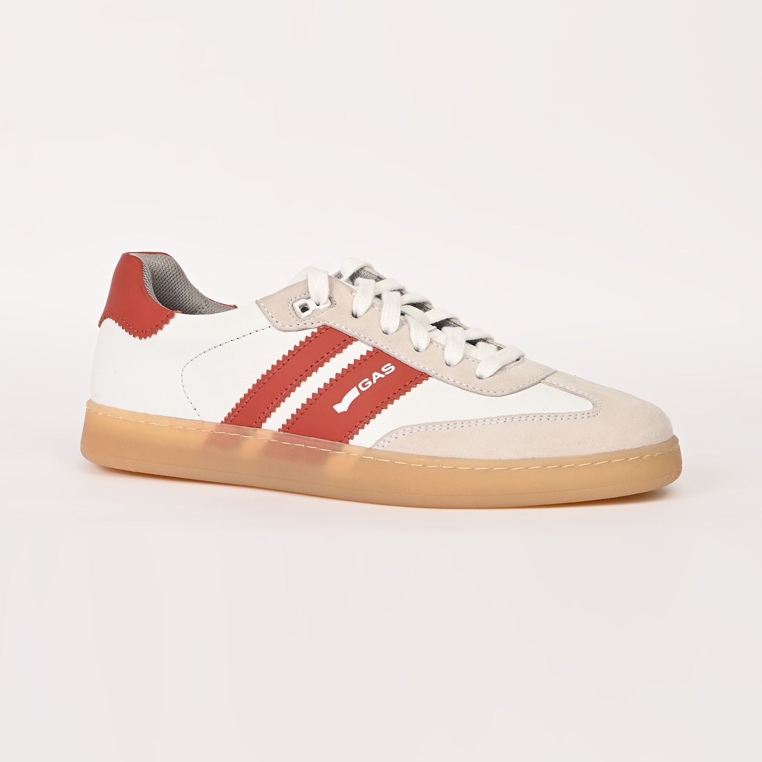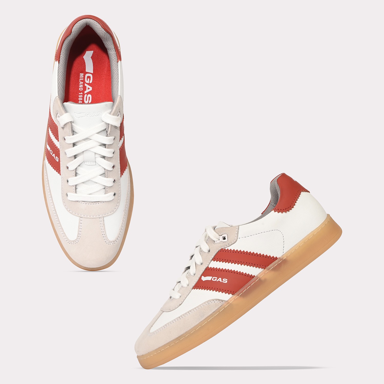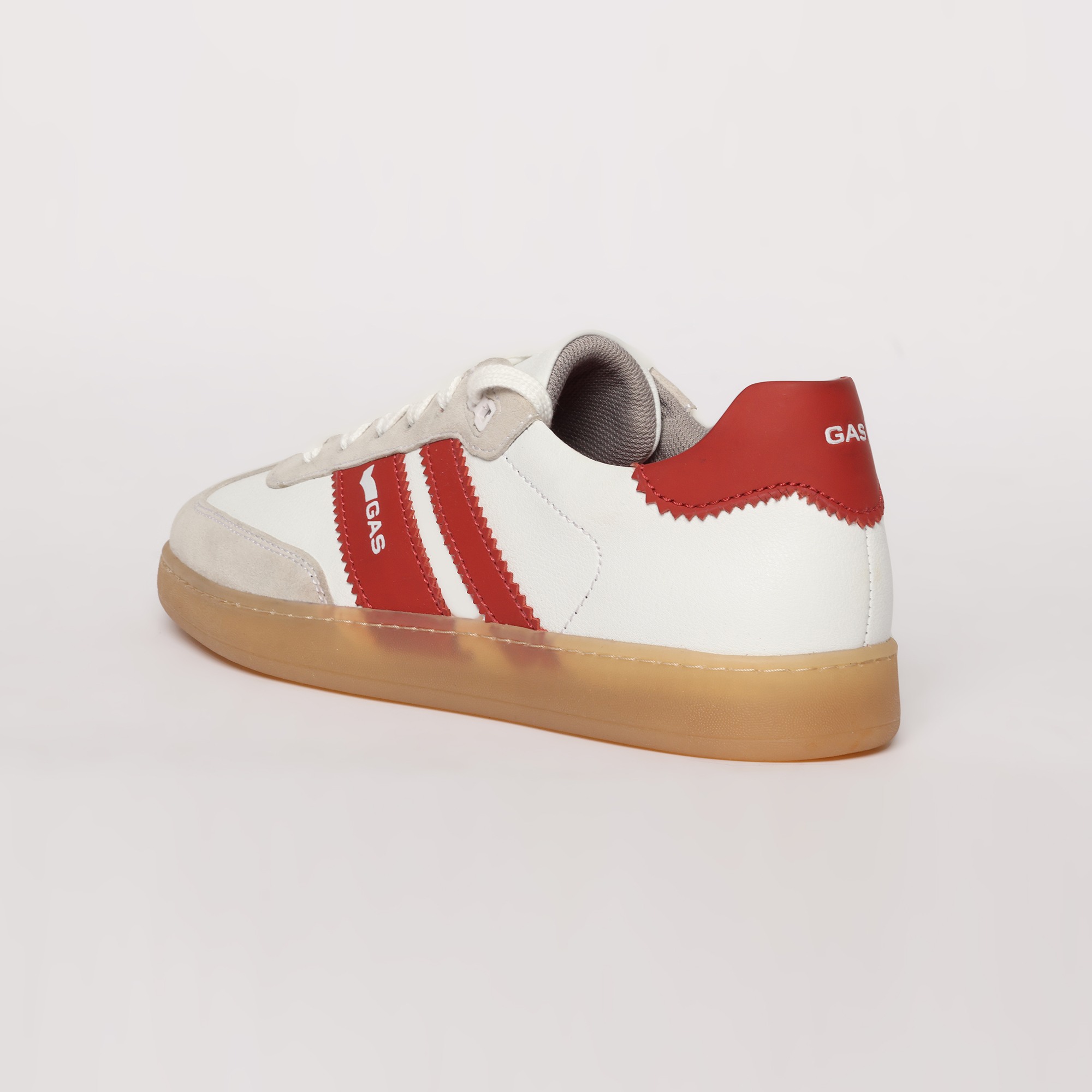 Sienna Stride is a sleek casual lace-up sneaker crafted in crisp white and red leather, defined by a clean, streamlined silhouette with striking colour-block detailing for a contemporary edge.