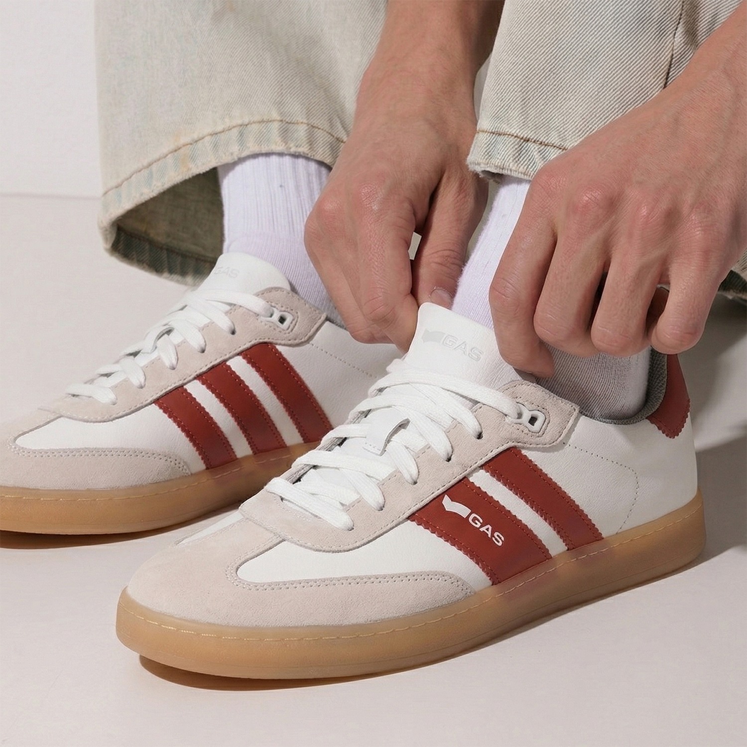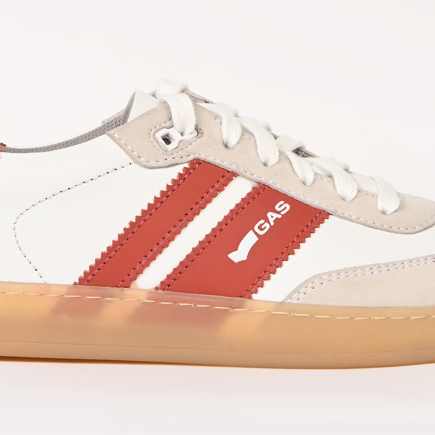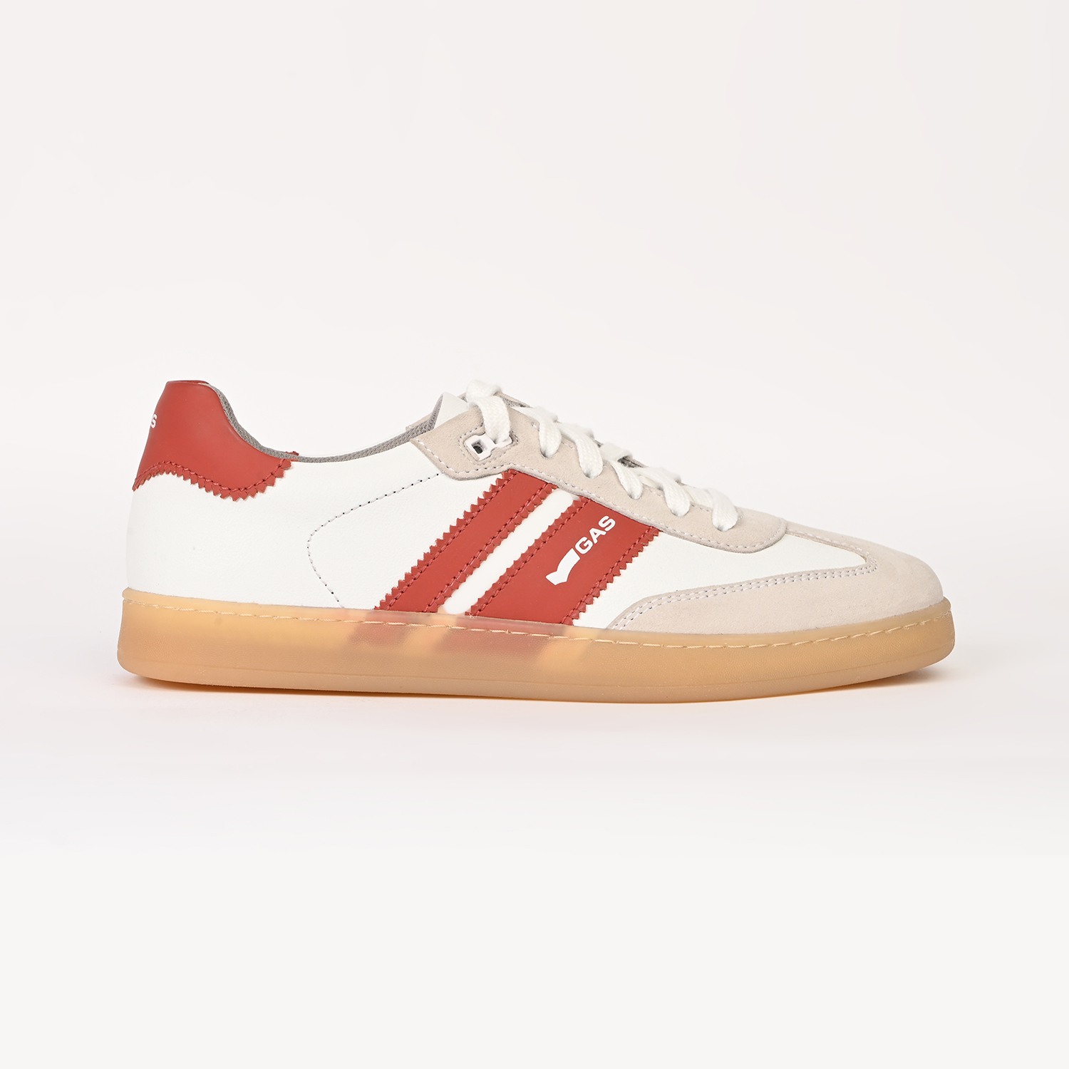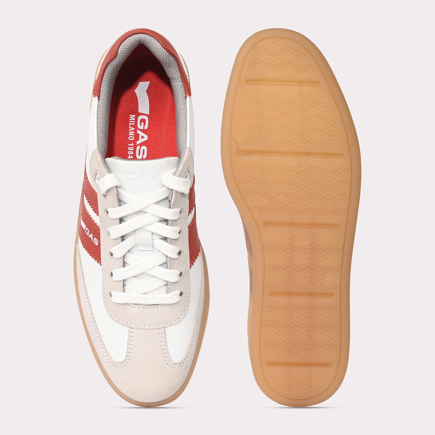 Sienna Stride is a sleek casual lace-up sneaker crafted in crisp white and red leather, defined by a clean, streamlined silhouette with striking colour-block detailing for a contemporary edge.