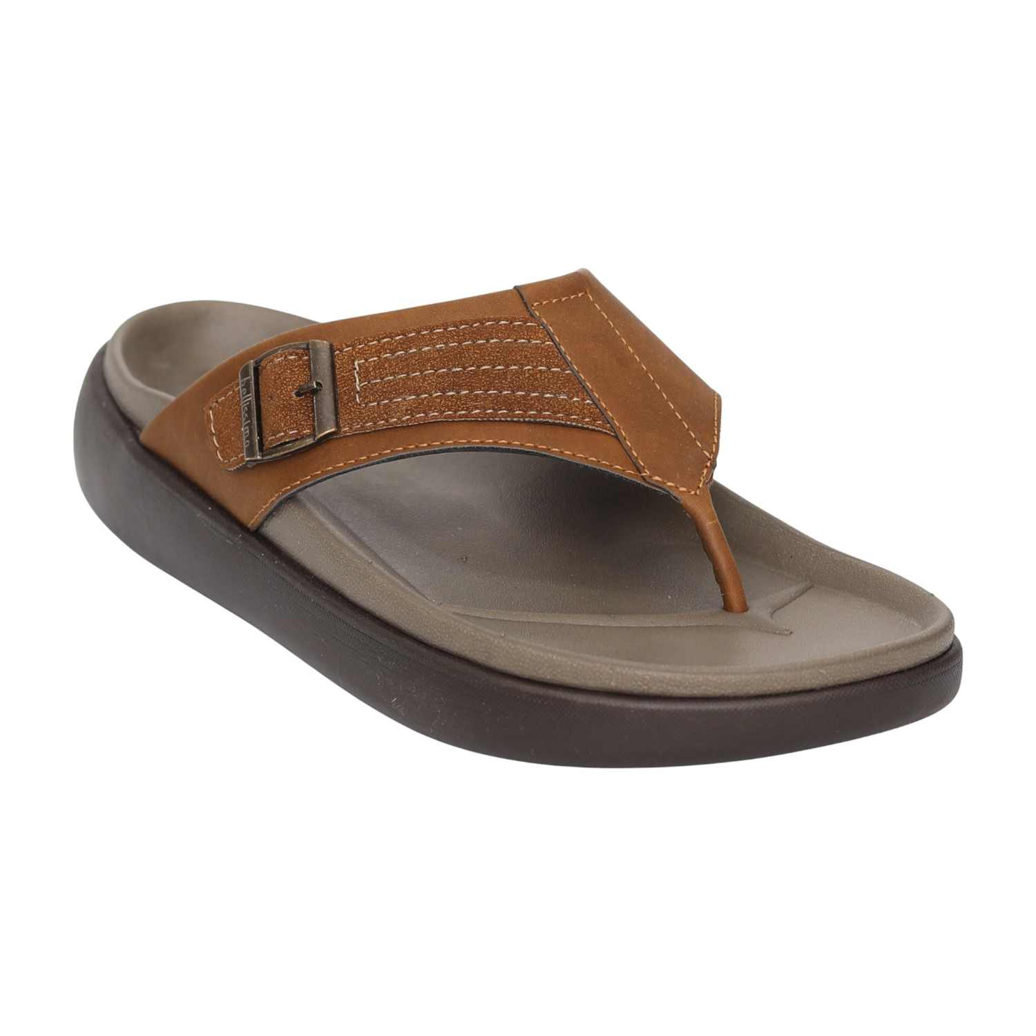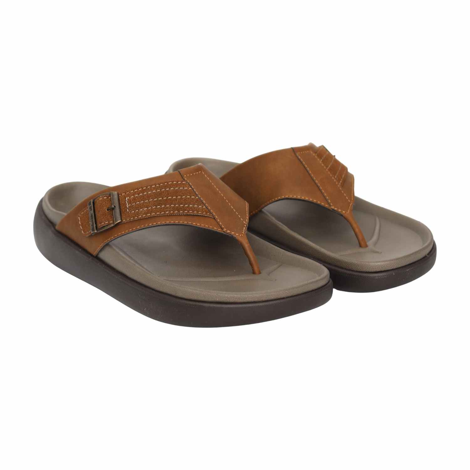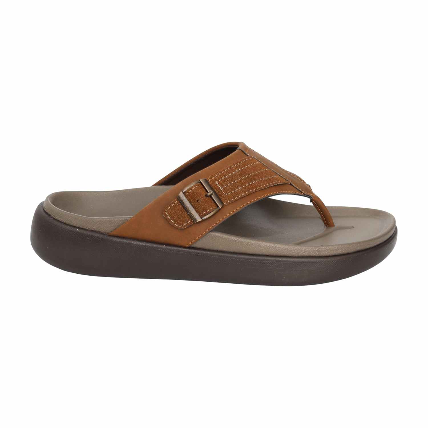 Designed for understated everyday wear, this sandal features a streamlined profile accented with a functional buckle. The thong-style construction ensures a steady fit, while the cushioned footbed helps reduce foot fatigue. The tan finish adds a warm, versatile touch to casual looks.