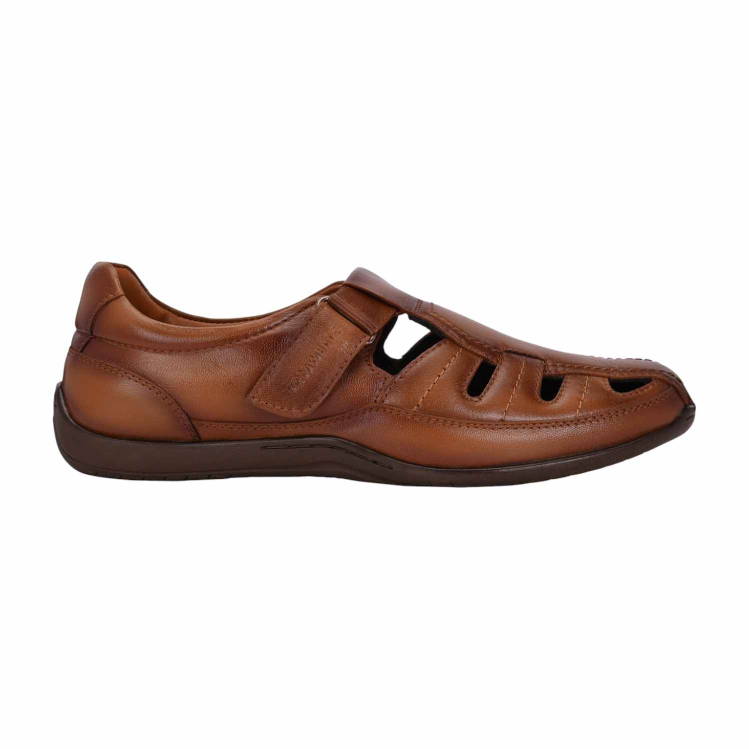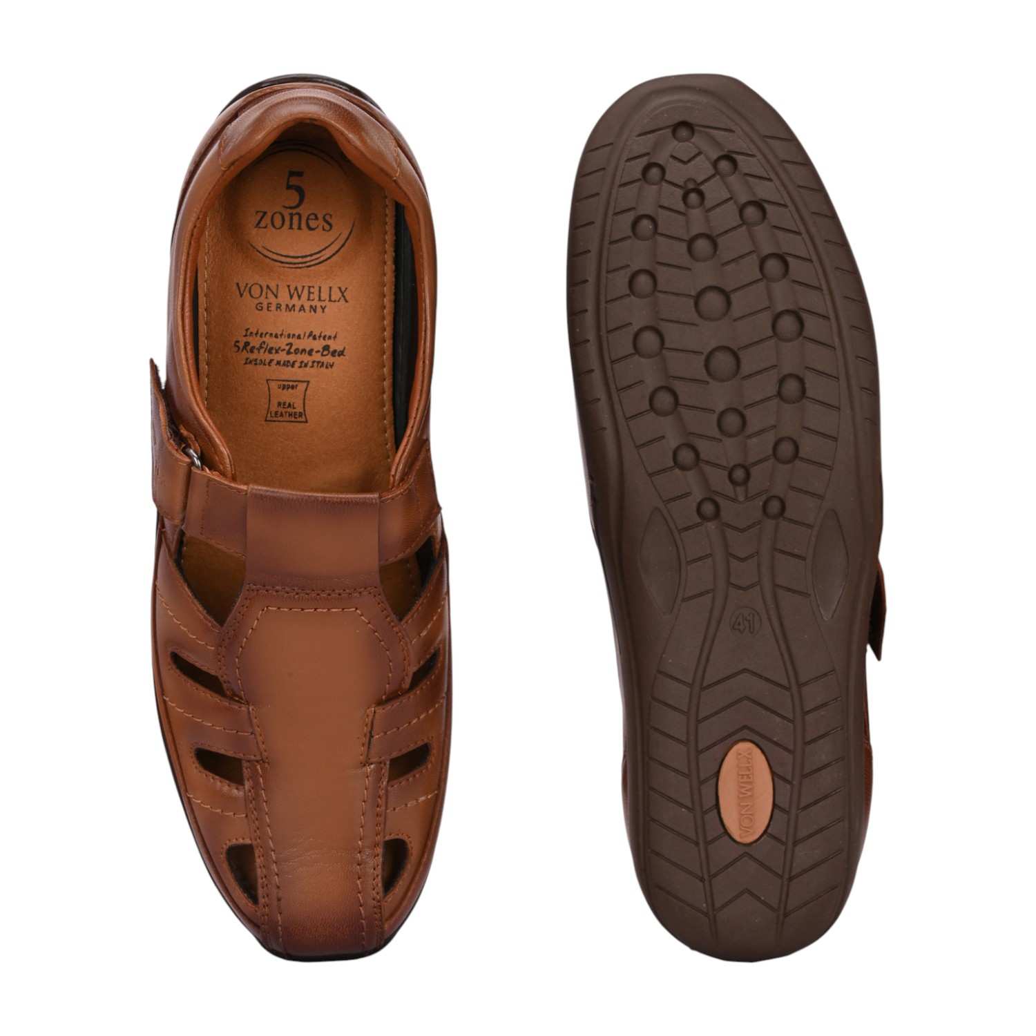 Introducing a comfortable and practical option for warm weather: Men's Tan Leather Fisherman Sandals. These shoes offer the breathability of a sandal with the coverage and support of a closed shoe, making them perfect for casual summer outings and travel.