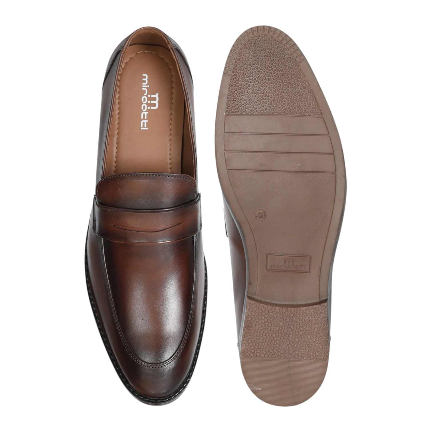 The Miraatti Tan Polished Slip-On Dress Shoes combine style with ease. Their slip-on construction allows for quick wear, while the cushioned insole ensures comfort throughout your busy day. A polished upper completes the look, making them ideal for both work and formal occasions.