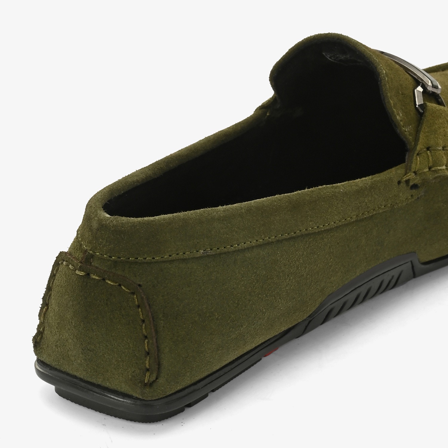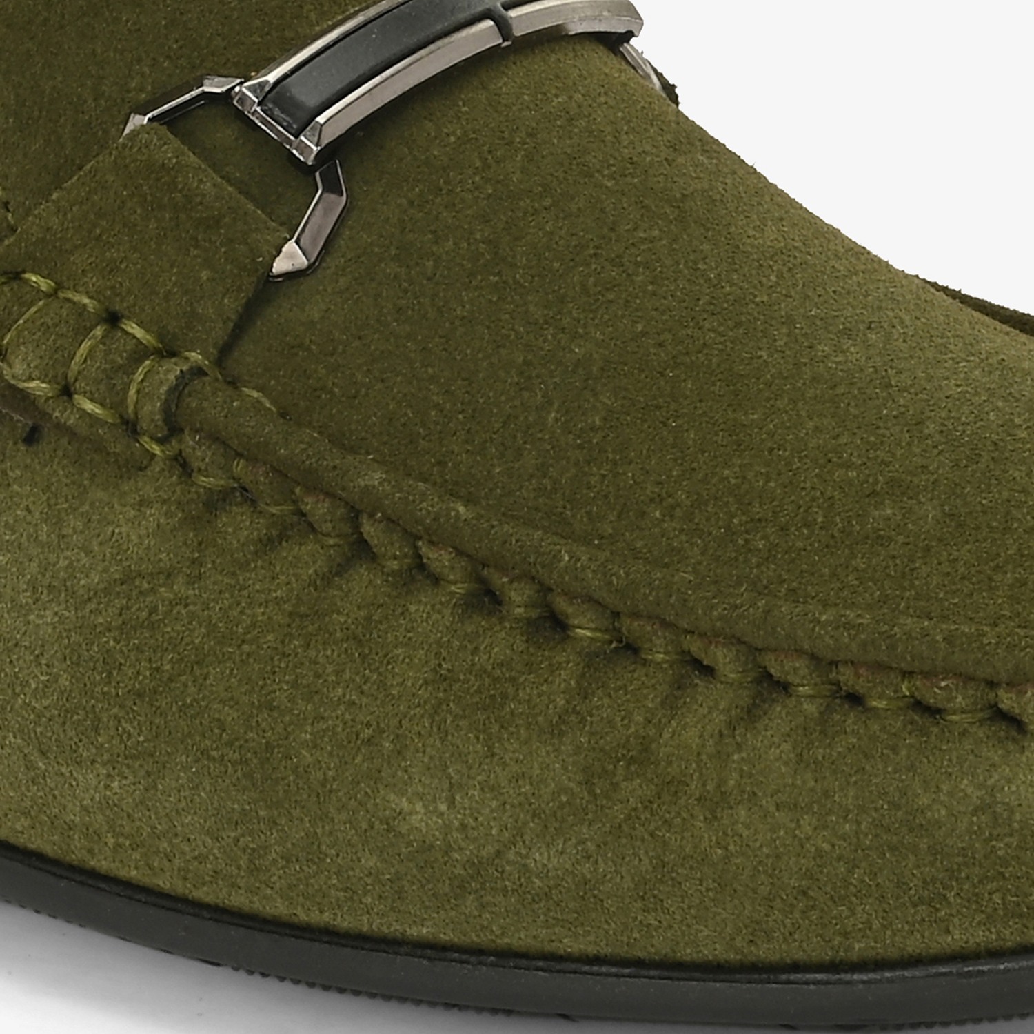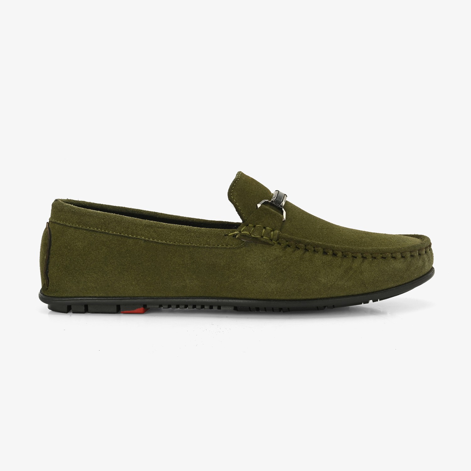| Elevate your everyday style with these olive green slip-on loafers, designed for both comfort and versatility. The suede-textured upper adds a refined, modern touch, while the sleek metal accent across the vamp enhances their overall appeal. Whether paired with casual denim or smart chinos, they bring a polished finish to any outfit. |