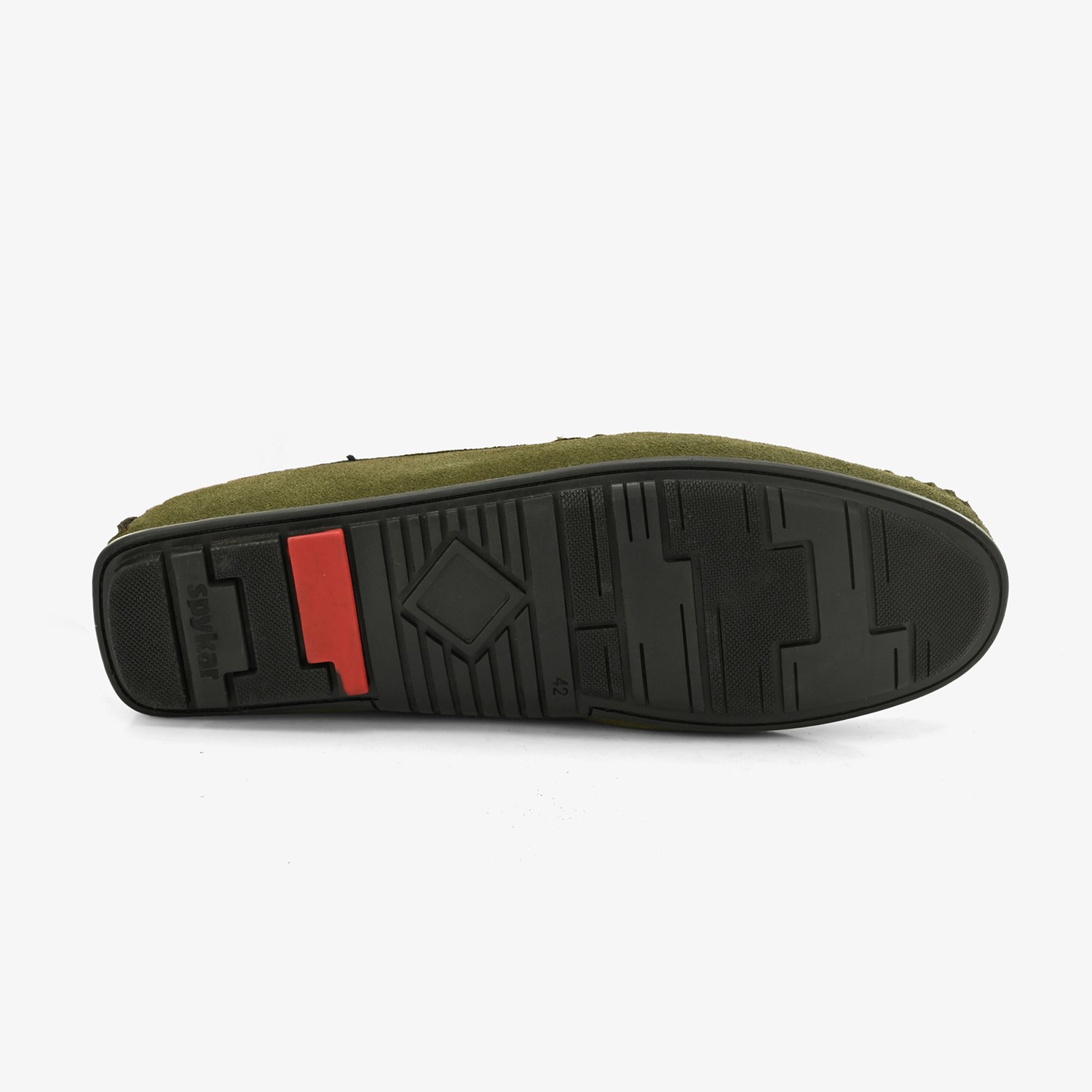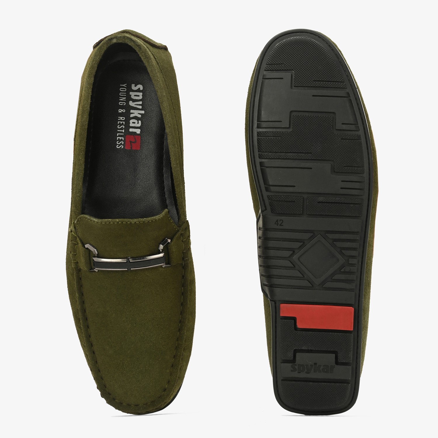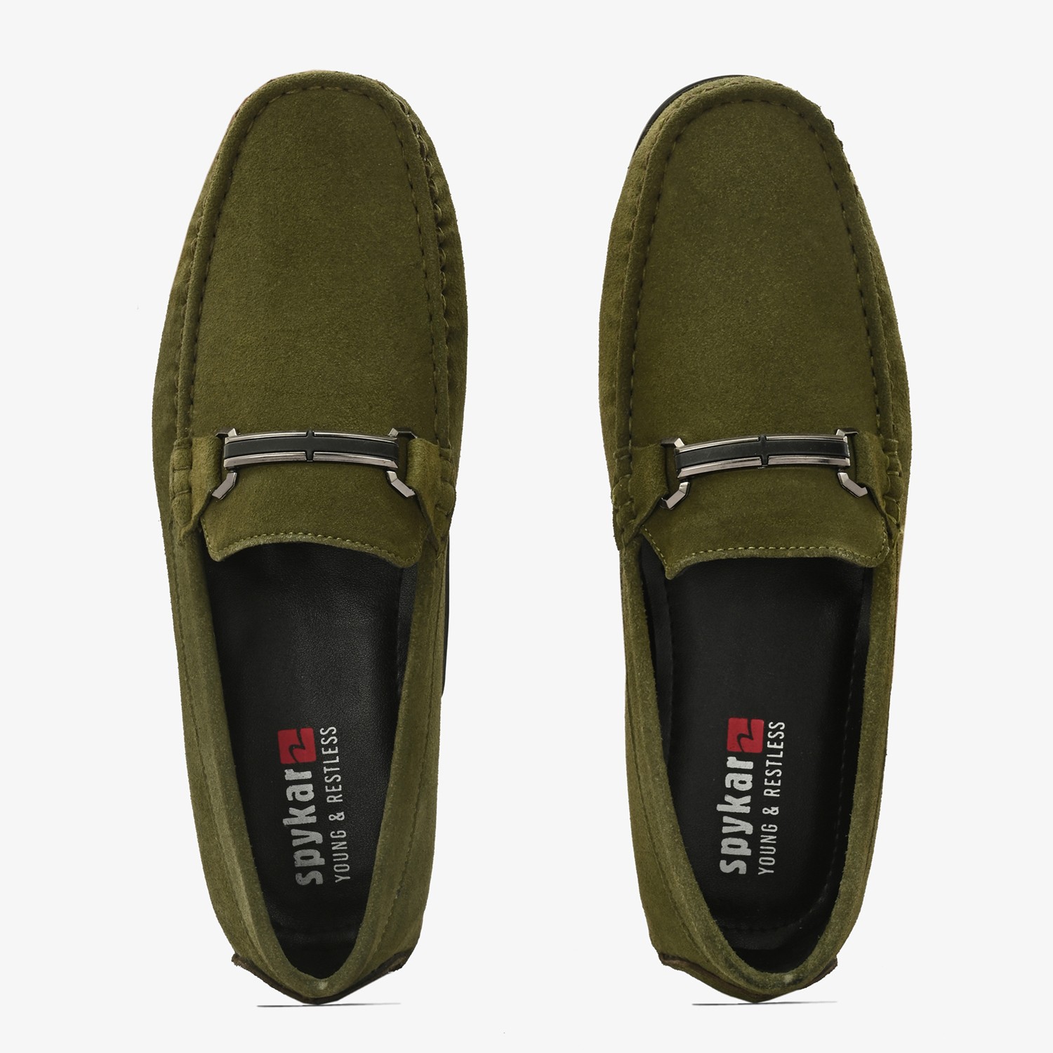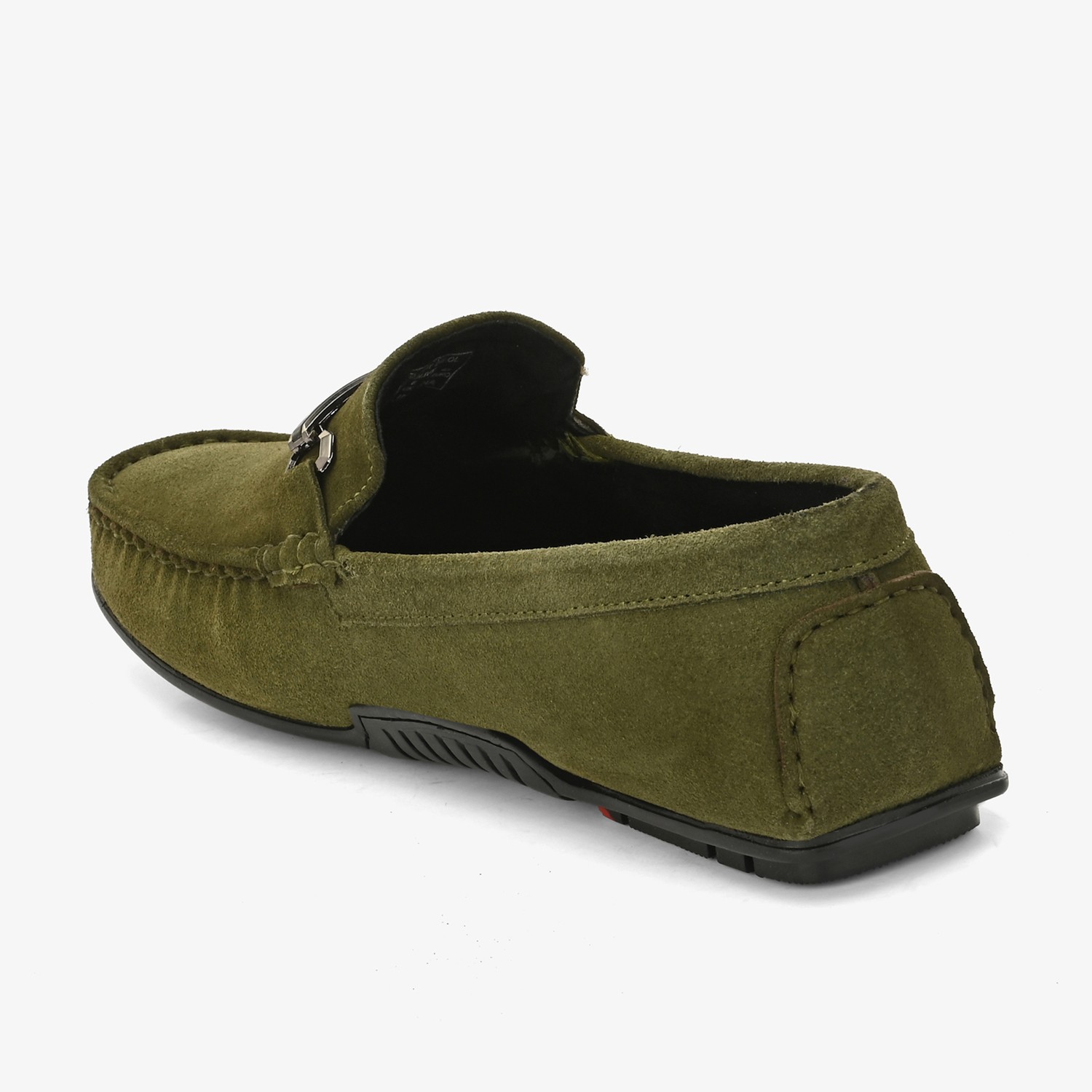 | Elevate your everyday style with these olive green slip-on loafers, designed for both comfort and versatility. The suede-textured upper adds a refined, modern touch, while the sleek metal accent across the vamp enhances their overall appeal. Whether paired with casual denim or smart chinos, they bring a polished finish to any outfit. |