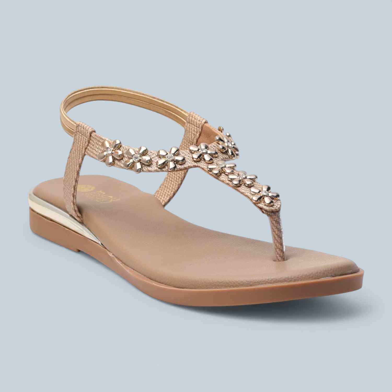 Minx embellished flat sandals combine elegance and comfort with a stone-detailed strap and secure toe-post design. Featuring a cushioned footbed and lightweight sole, they provide smooth, all-day wear. Their versatile style pairs effortlessly with both ethnic and casual outfits for everyday use or special occasions.