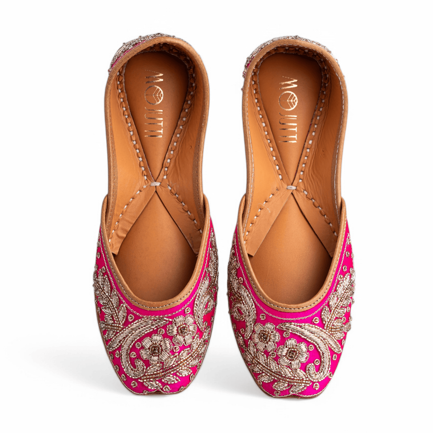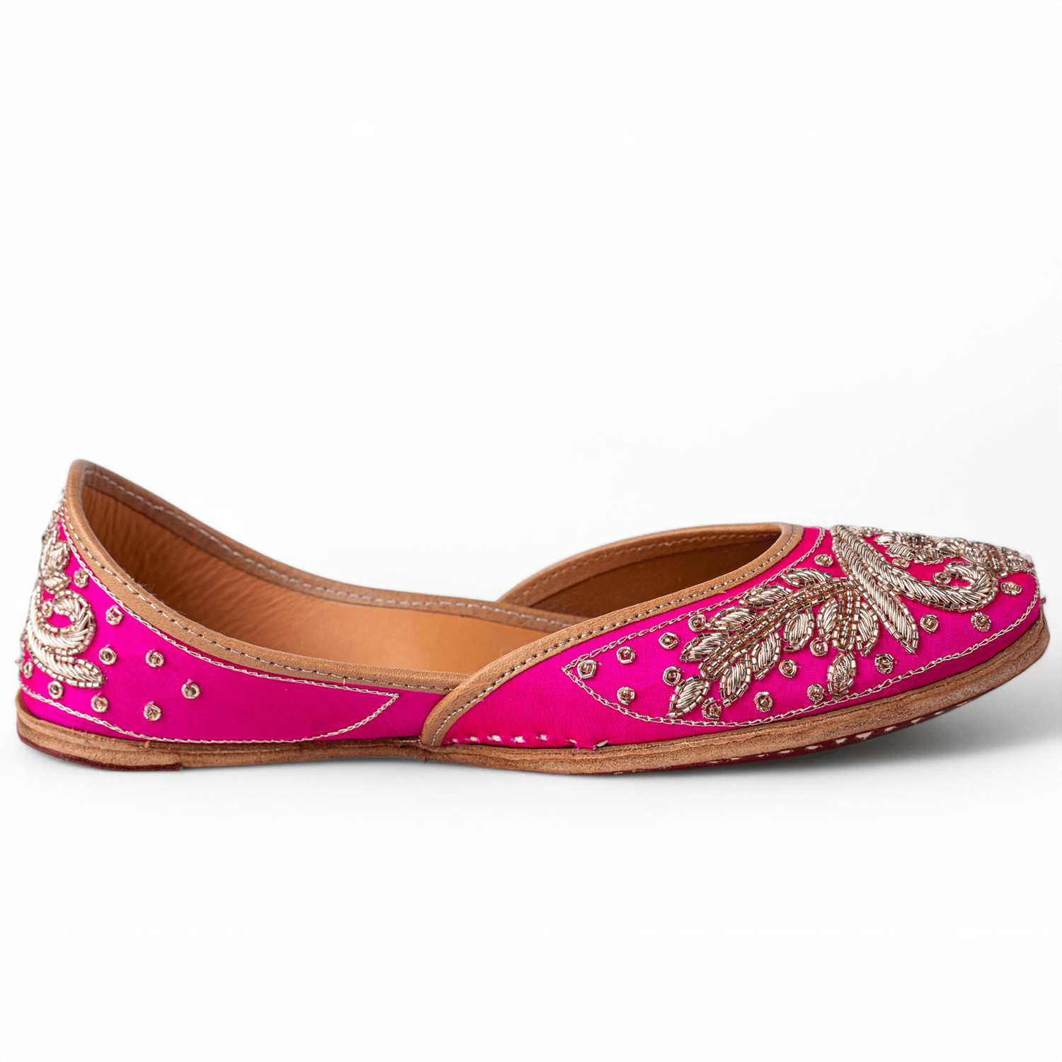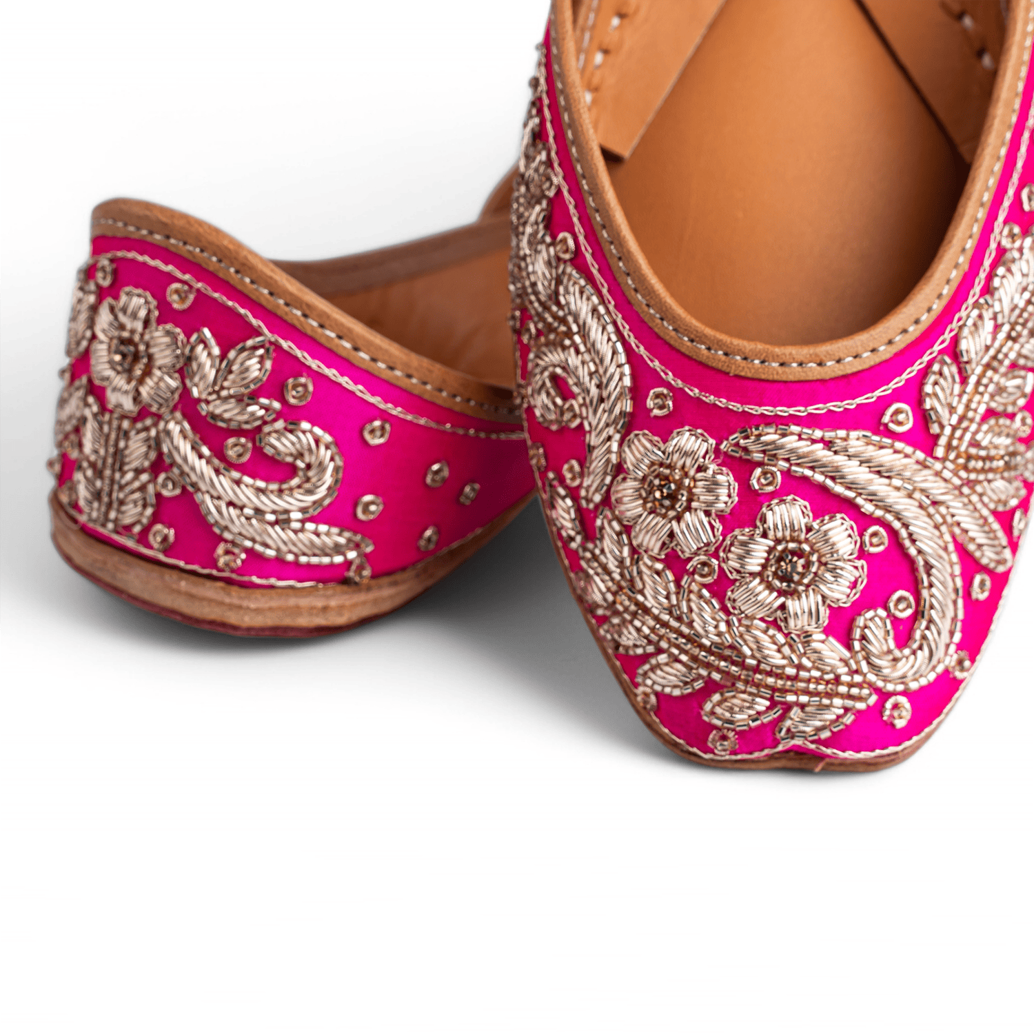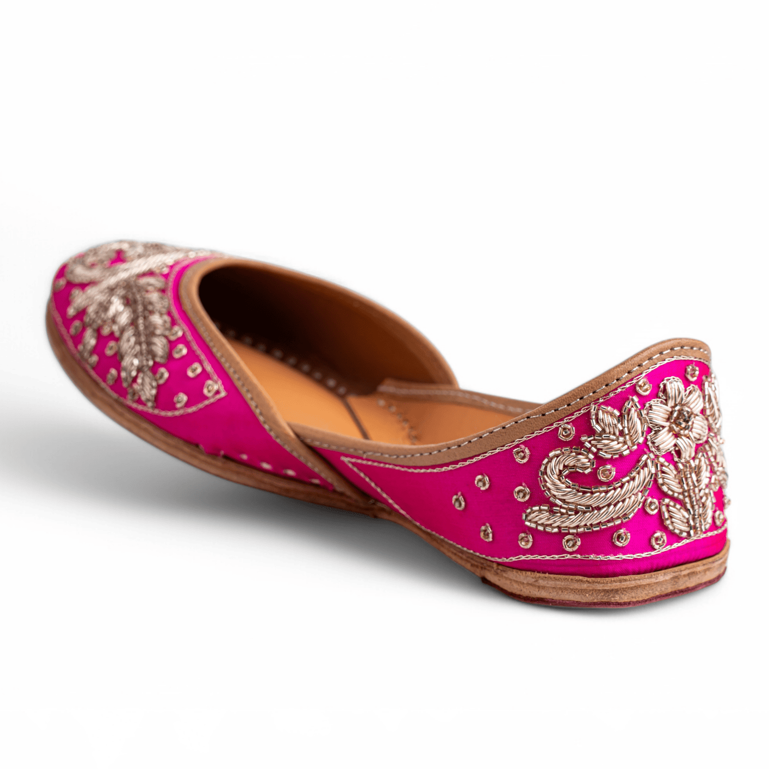 Crafted with intricate hand embroidery makes this pair a rather unique choice. It boasts gold thread embroidery and sequin detailing on a rani base. With comfy cushioning added, this jutti is what can complement your wedding outfits really well.