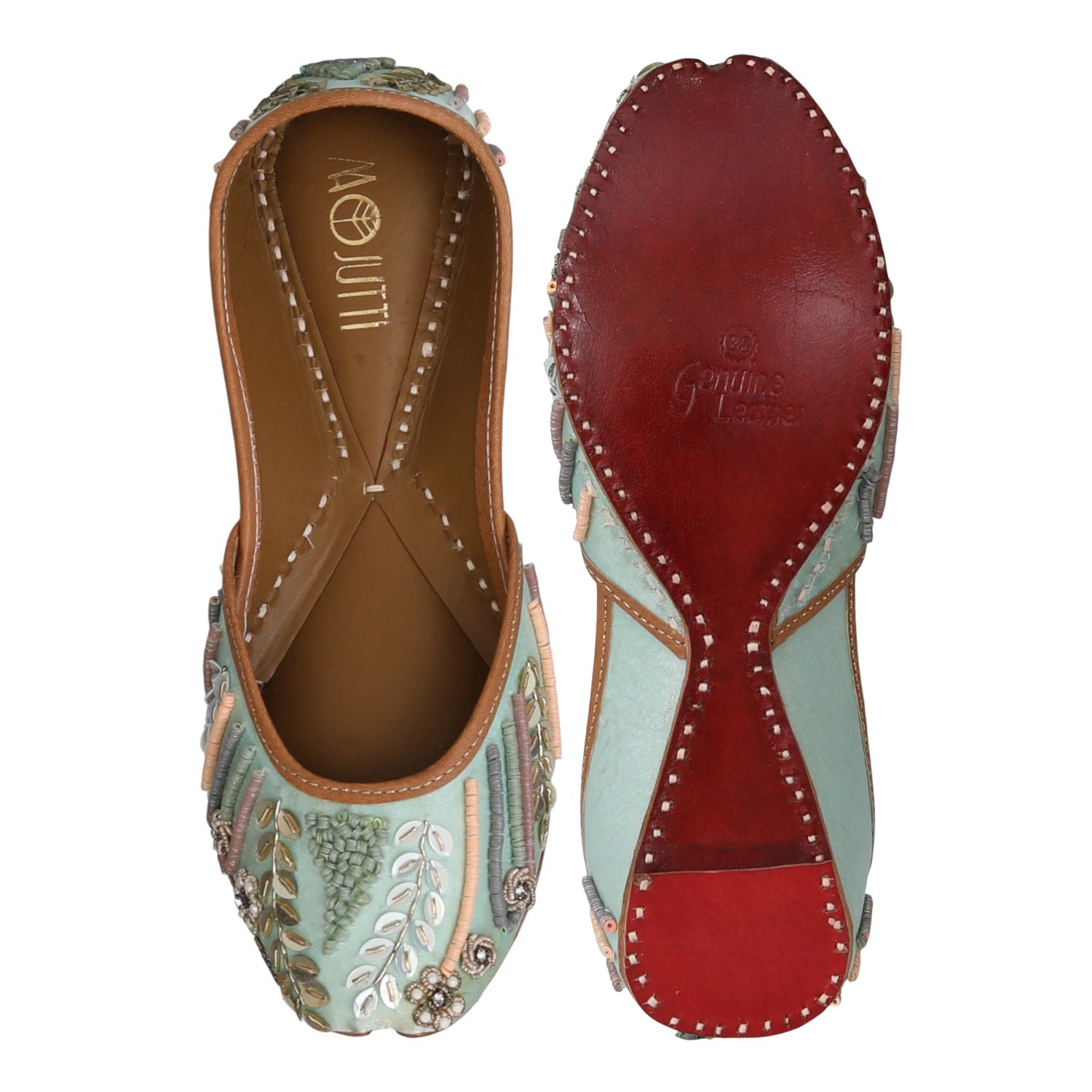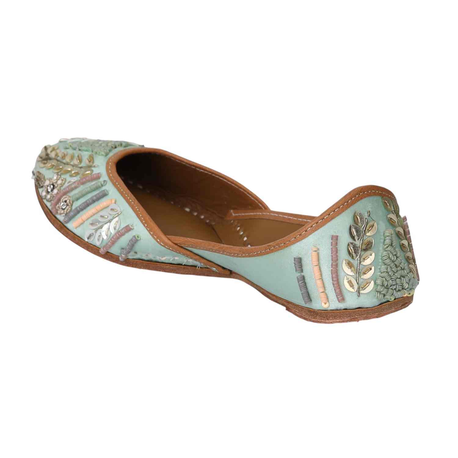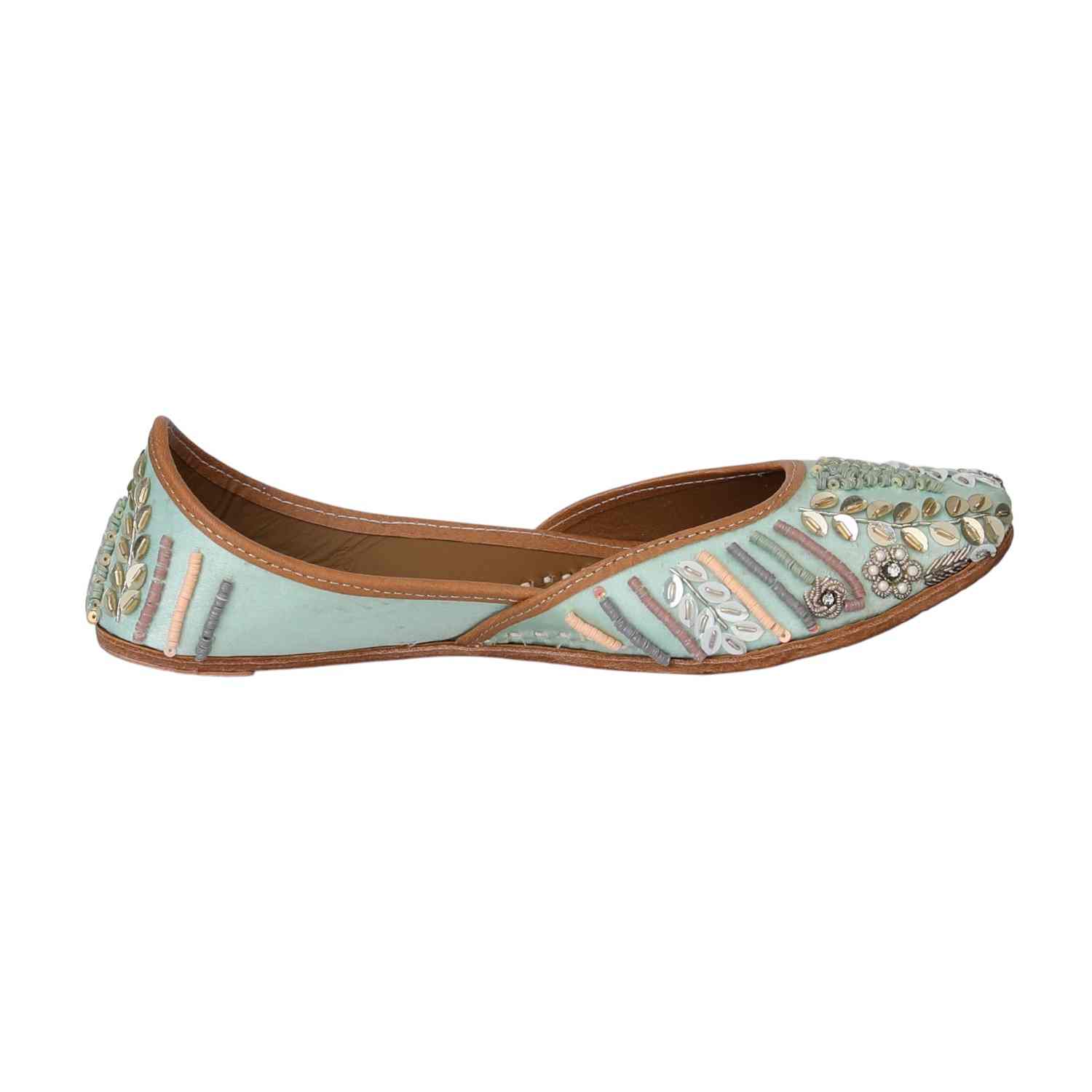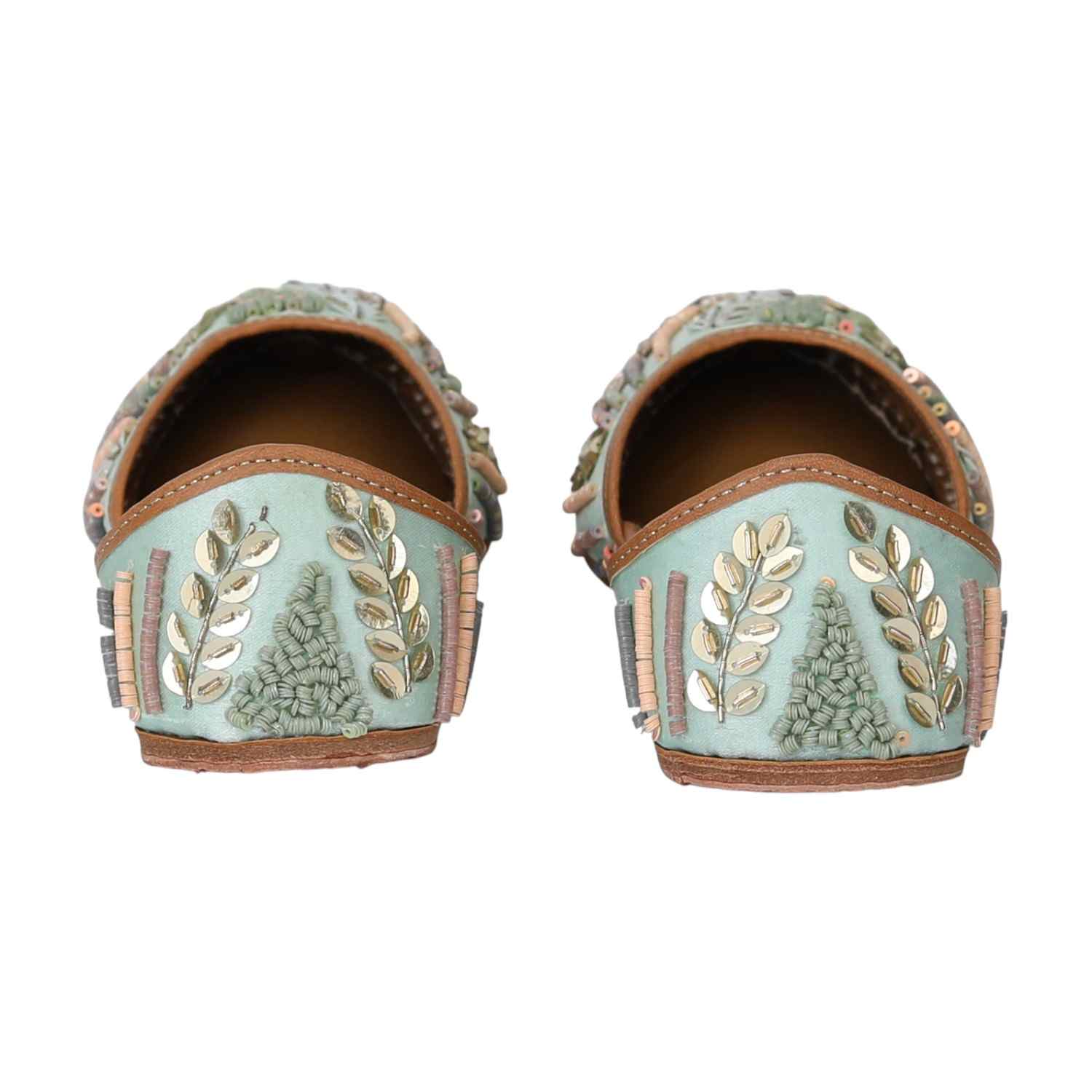 Step Into Elegance With This Exquisite Sea Green Mojaris, Featuring Intricate Embroidery And Embellishments. The Delicate Floral And Leaf Motifs Are Beautifully Complemented By Pearl And Sequin Detailing, Creating A Sophisticated And Artistic Design. The Pastel Hues And Luxurious Craftsmanship Make This Pair Perfect For Weddings, Festive Occasions, Or Adding A Touch Of Grace To Your Ethnic Wear