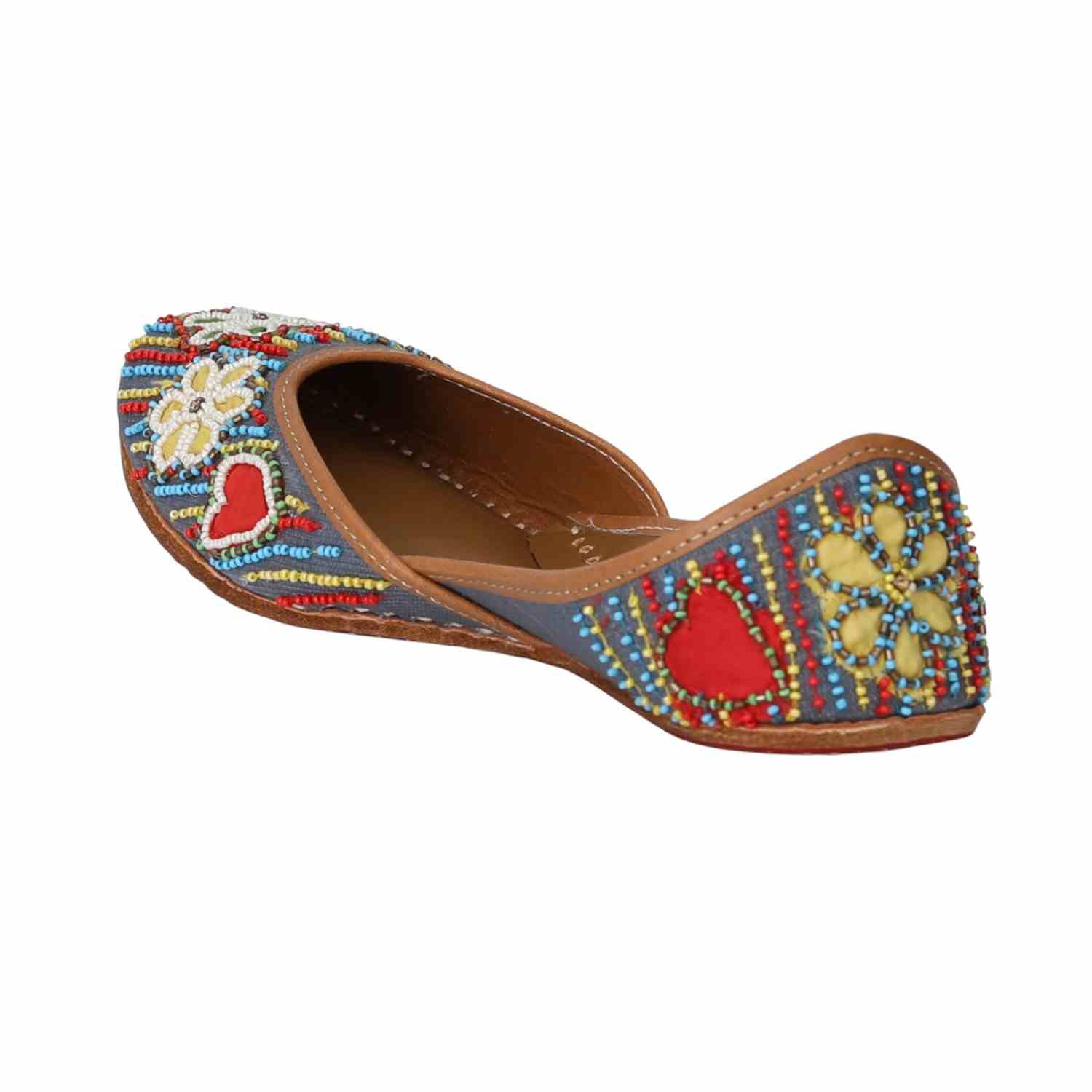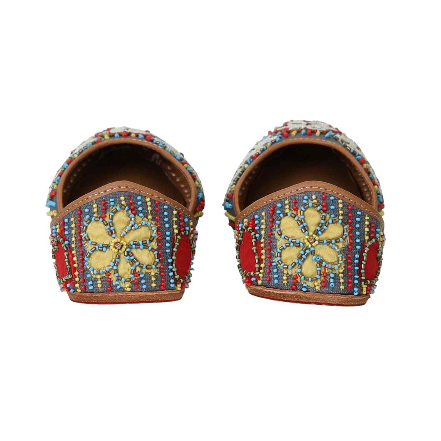 Joyfully eclectic and full of personality, this handcrafted jutti features a denim-toned canvas brought to life with vibrant beadwork and cheerful floral motifs. Pops of red, yellow, green, and blue create a lively rhythm, making this a standout piece for fun days out or festive occasions. Finished with a soft leather lining, it balances bohemian energy with everyday comfort.