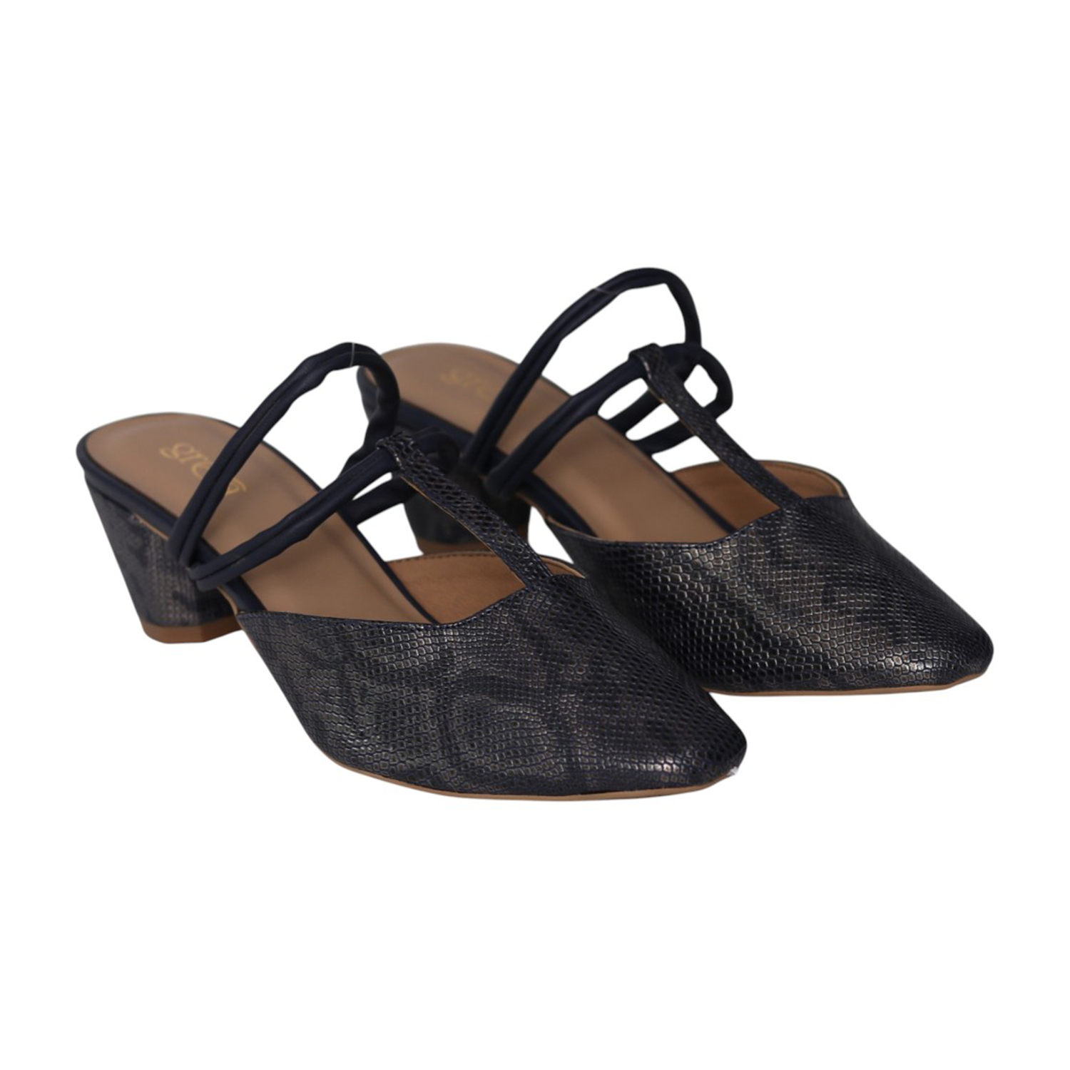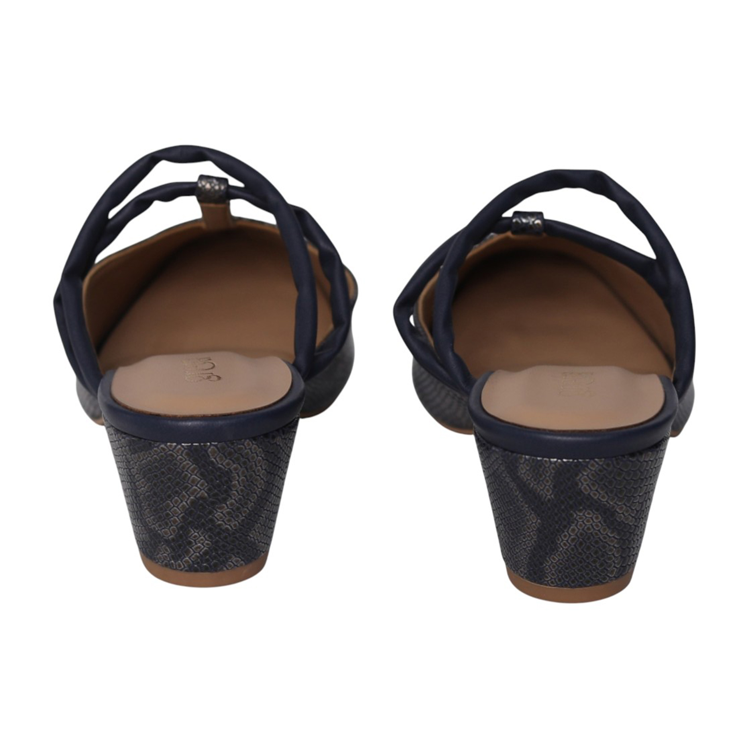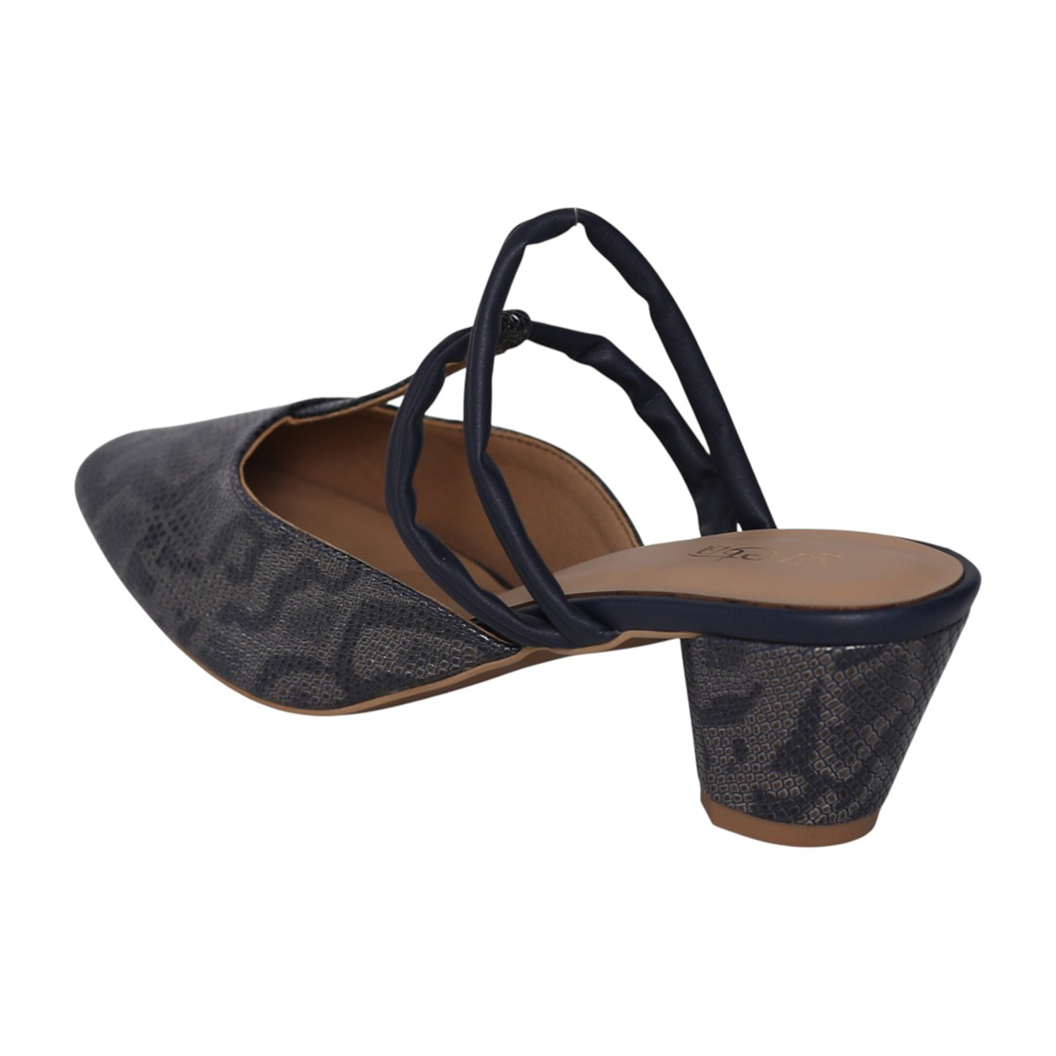Step into elegance with these navy blue mules, designed for the modern woman who values both style and stability. Featuring a sophisticated faux-snakeskin texture and a unique multi-strap design, these heels offer a contemporary twist on a classic silhouette. Perfect for transitioning from the office to an evening dinner, they provide a refined finish to any outfit.