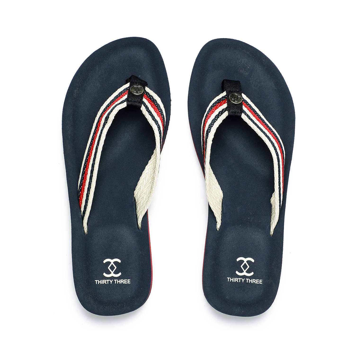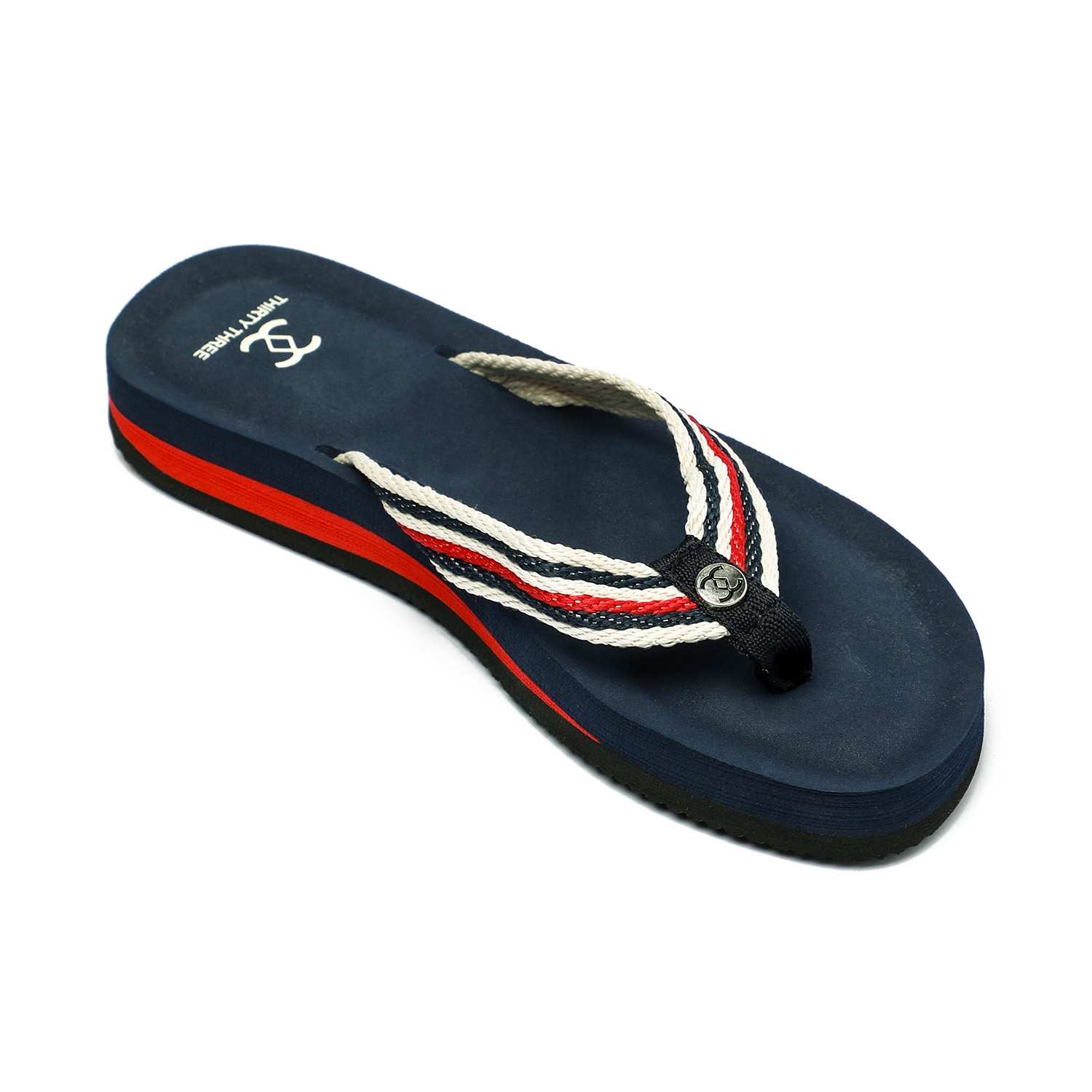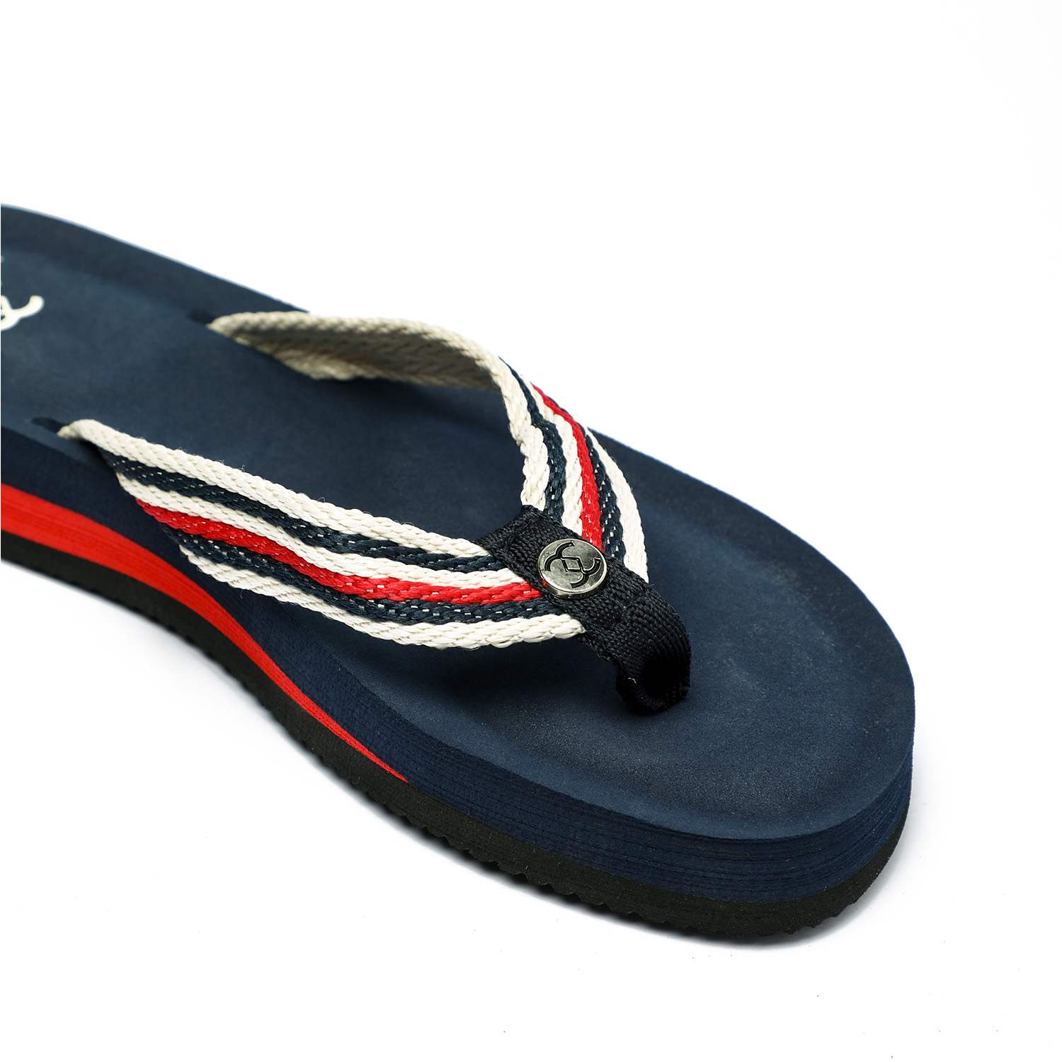 Step into effortless style and comfort with these Womens navy flip-flops, designed for everyday wear. Featuring durable braided fabric straps in a sporty red, white, and navy color combination, these flip-flops deliver a classic yet bold look. The cushioned sole ensures comfort with every step.