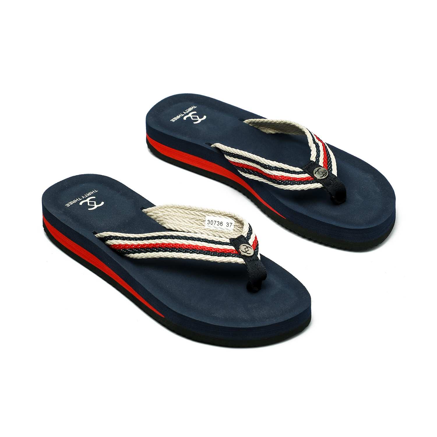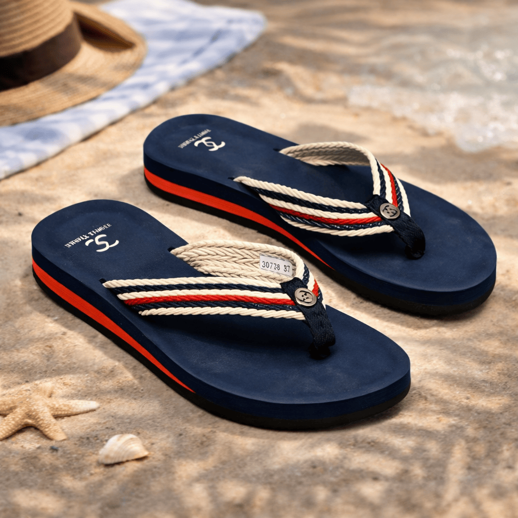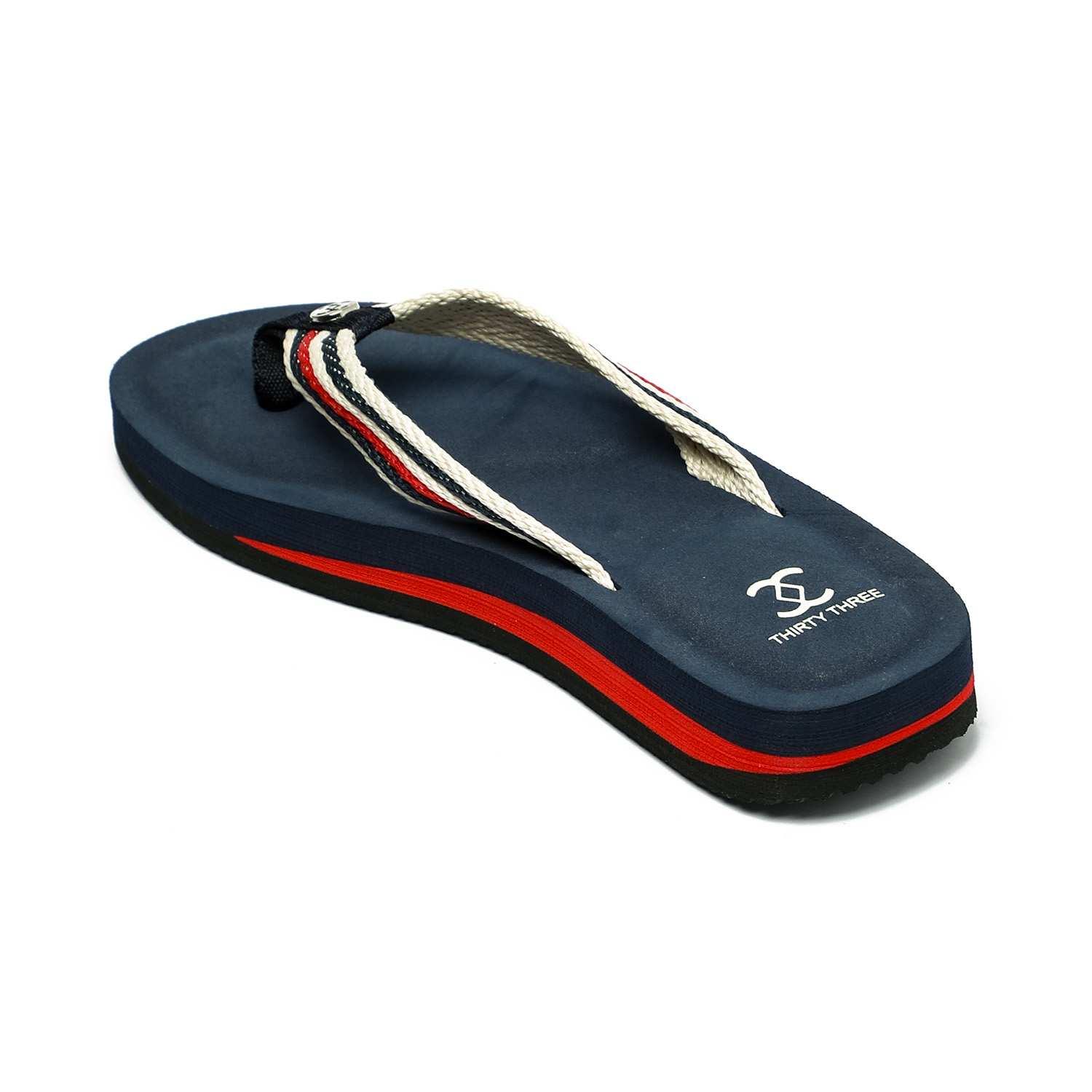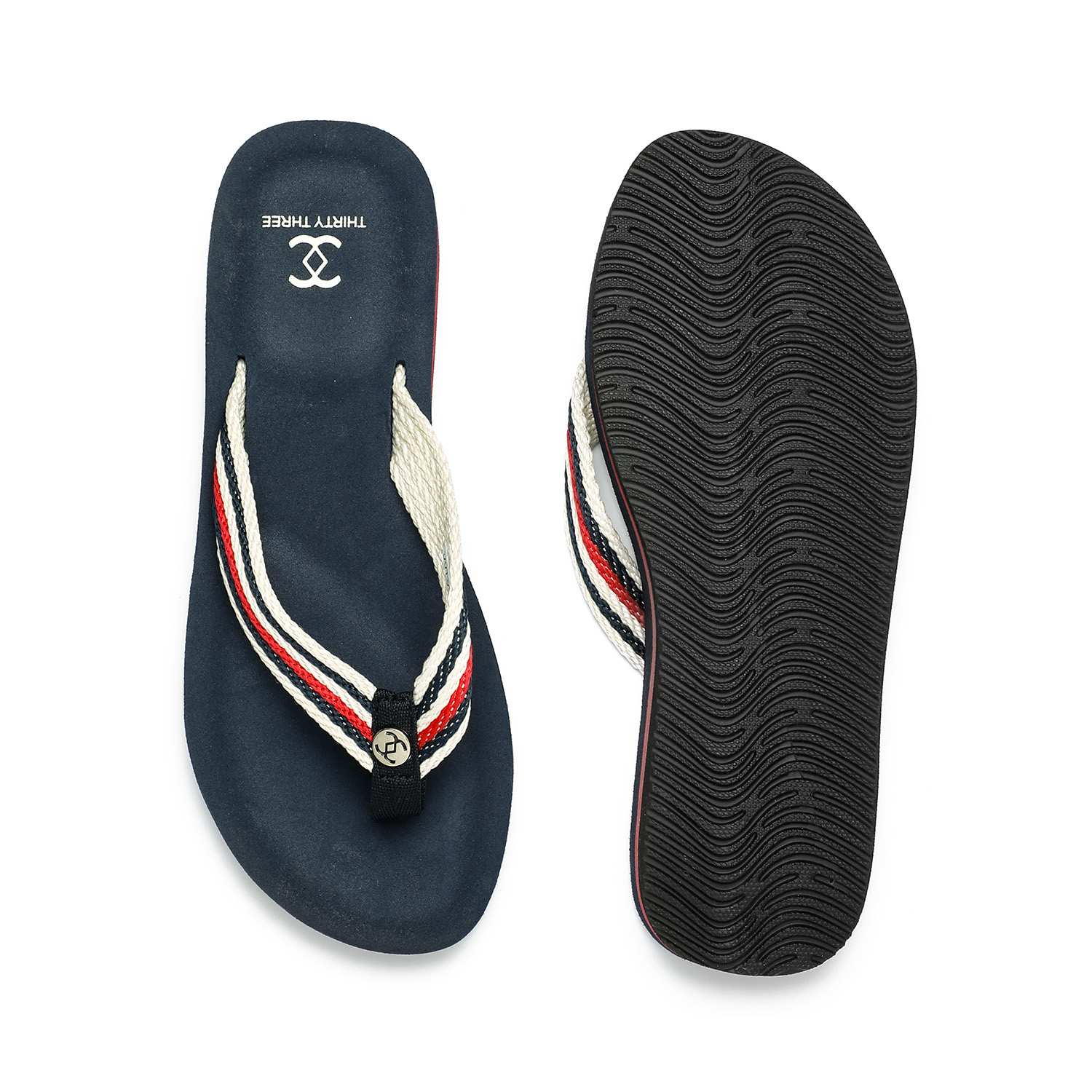Step into effortless style and comfort with these Womens navy flip-flops, designed for everyday wear. Featuring durable braided fabric straps in a sporty red, white, and navy color combination, these flip-flops deliver a classic yet bold look. The cushioned sole ensures comfort with every step.