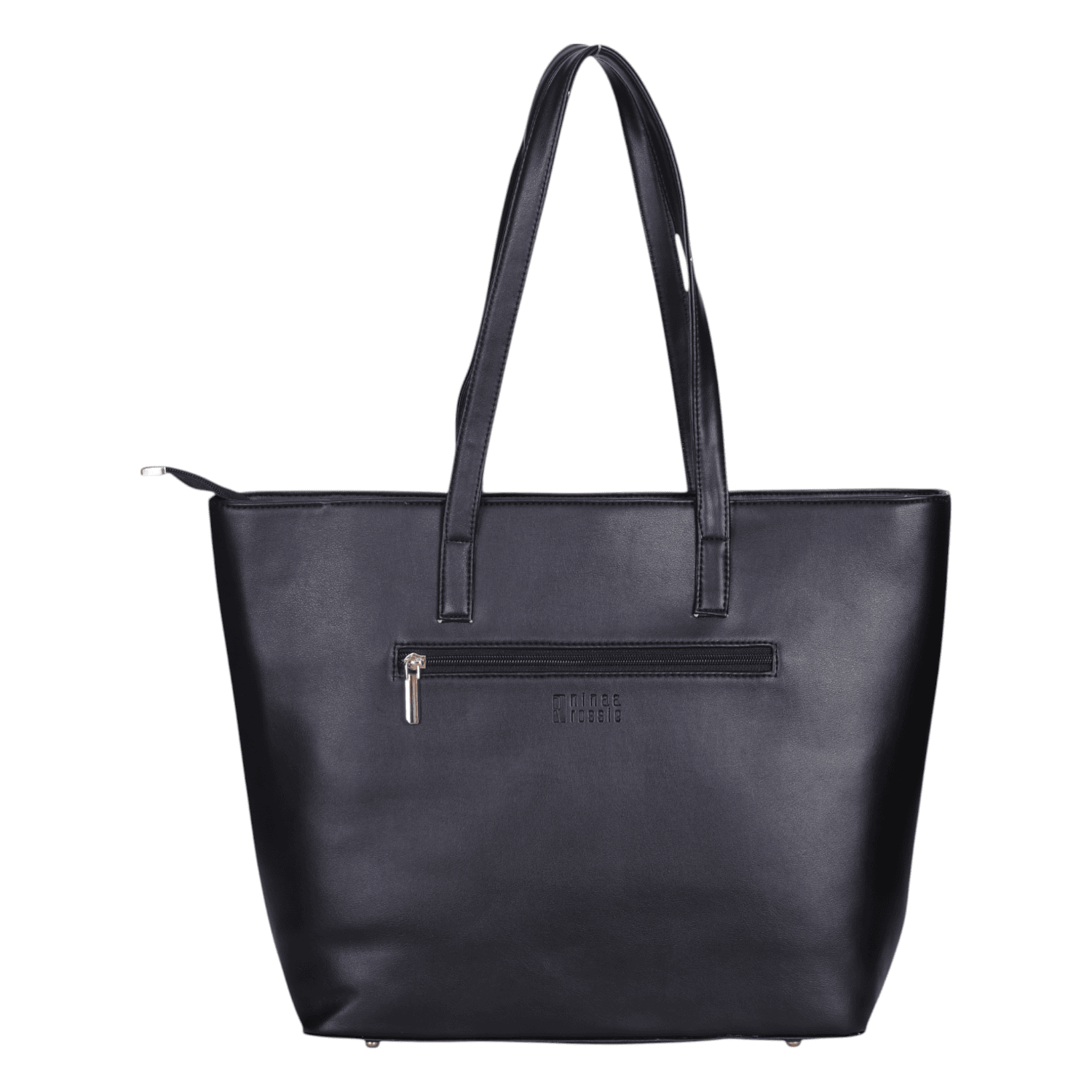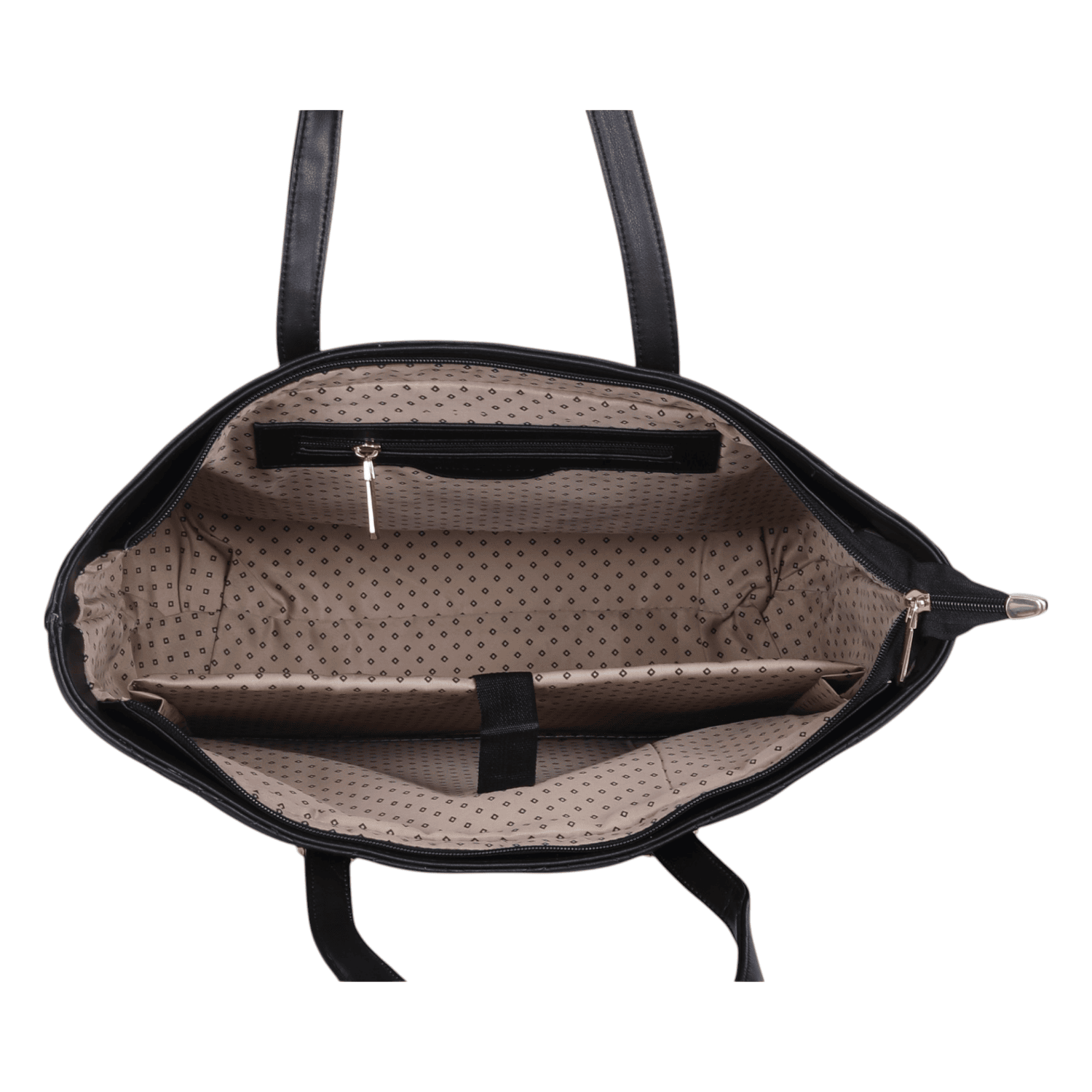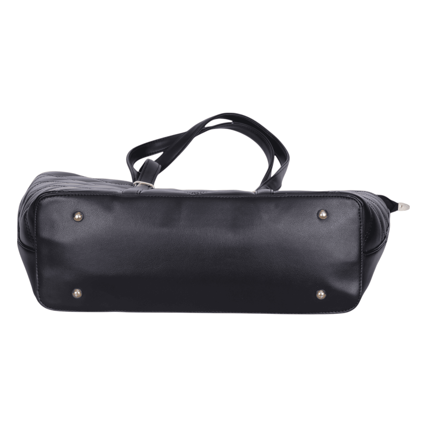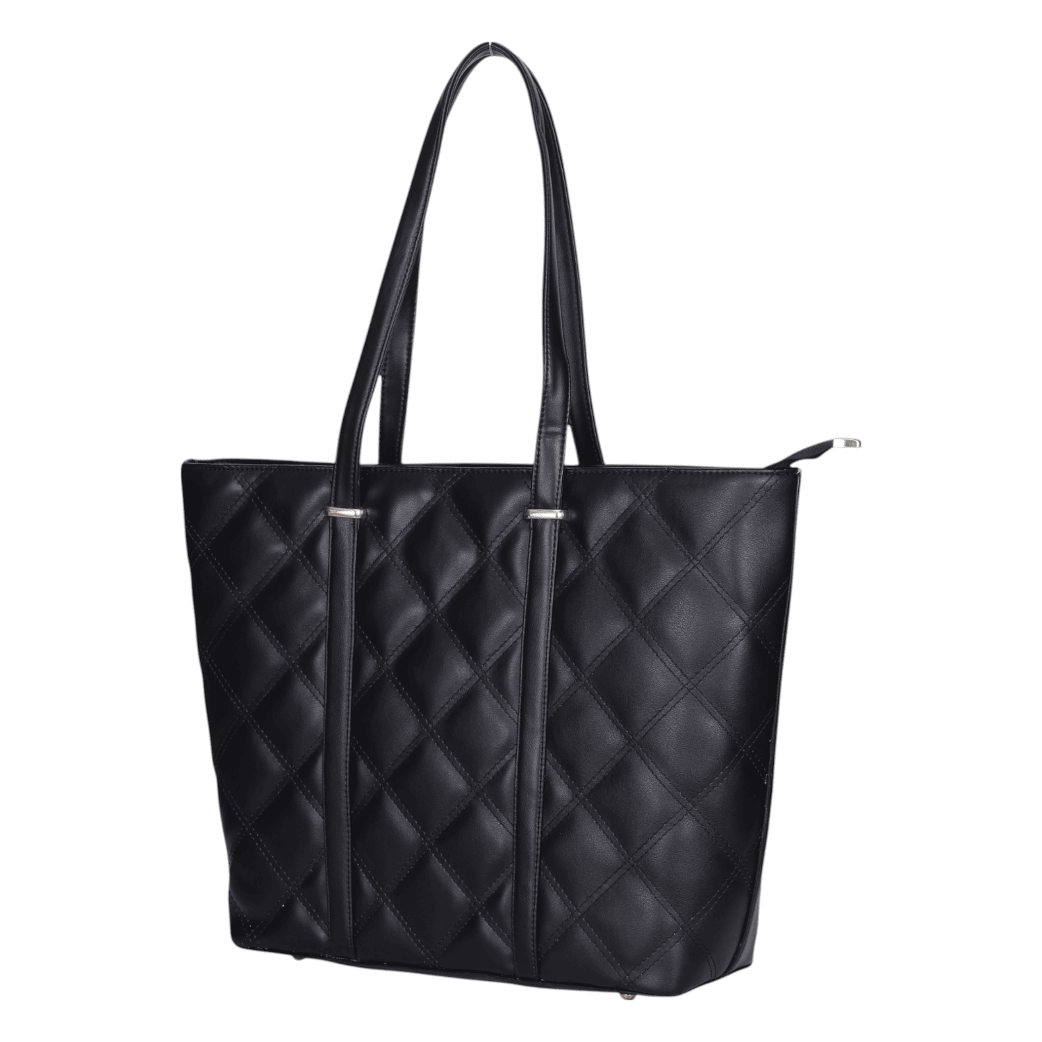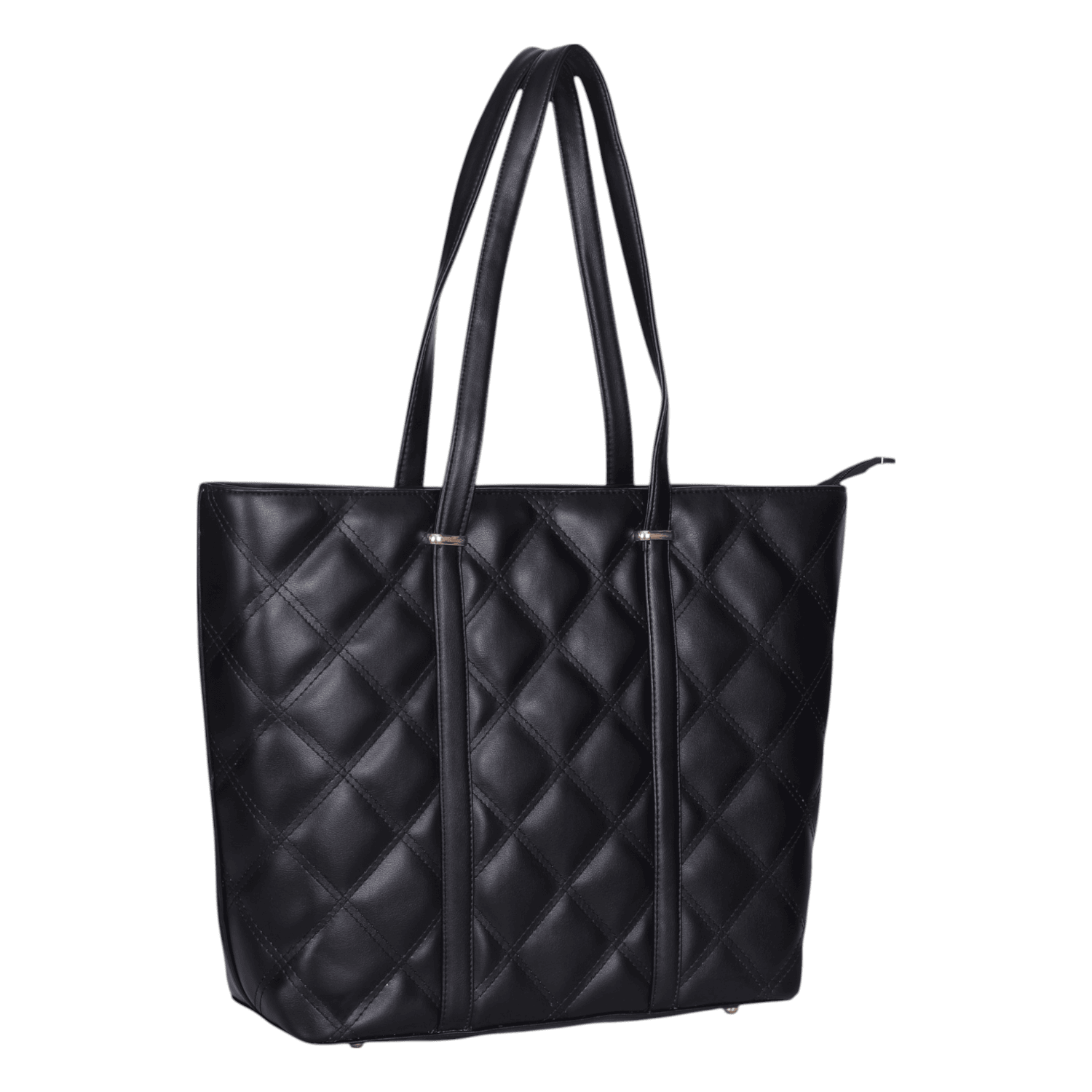 Our elegant black quilted faux leather tote is designed for the modern individual. It combines timeless style with practical features like a secure top zip, comfortable straps, and a spacious, organized interior complete with a padded laptop sleeve and multiple pockets for effortless daily or professional use.