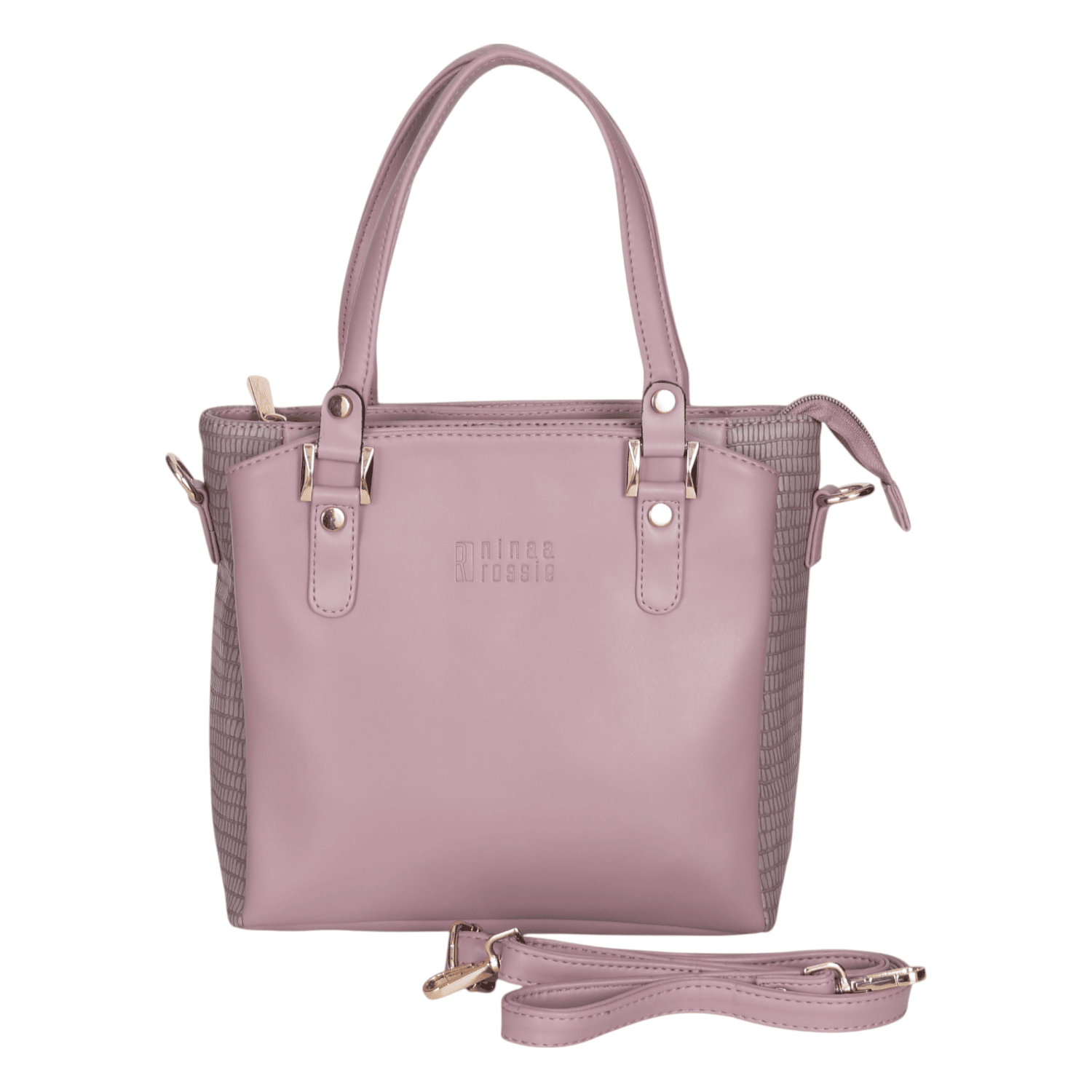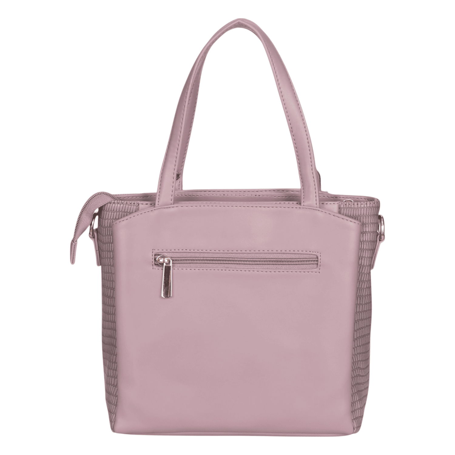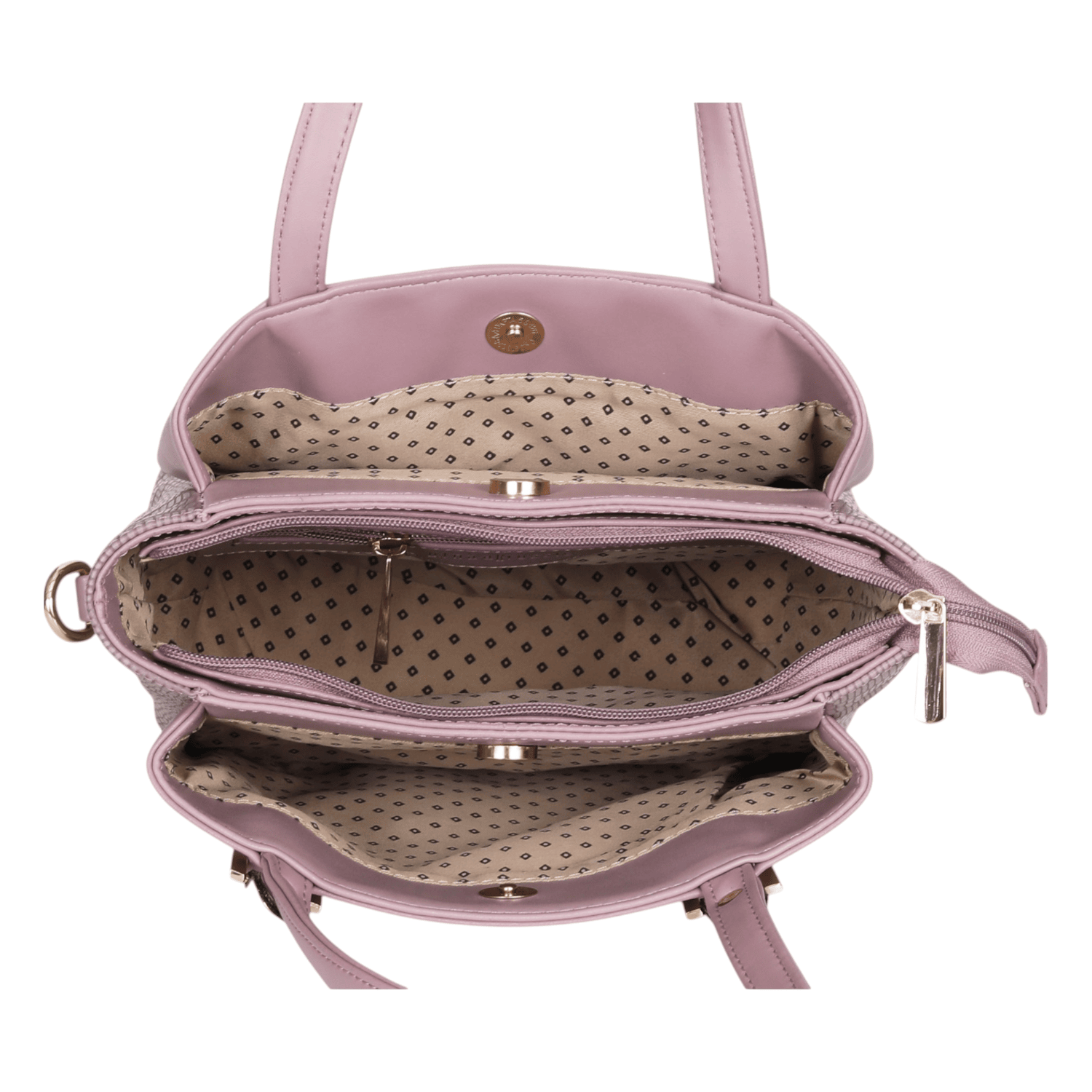 This elegant handbag showcases a sophisticated two-tone design, combining a smooth, lighter grey on the front panel with a darker, textured grey on the sides, offering a subtle contrast. It features polished gold-tone hardware that adds a touch of refinement. The interior is thoughtfully designed with multiple compartments, including secure zippered pockets, ensuring excellent organization for all your essentials. The main opening is secured by a magnetic snap, and the inside is lined with a stylish patterned fabric. This versatile accessory is perfect for adding a chic and organized touch to any daily or professional outfit.