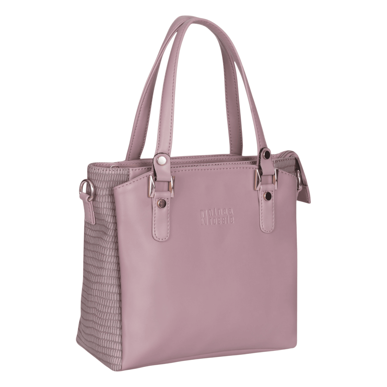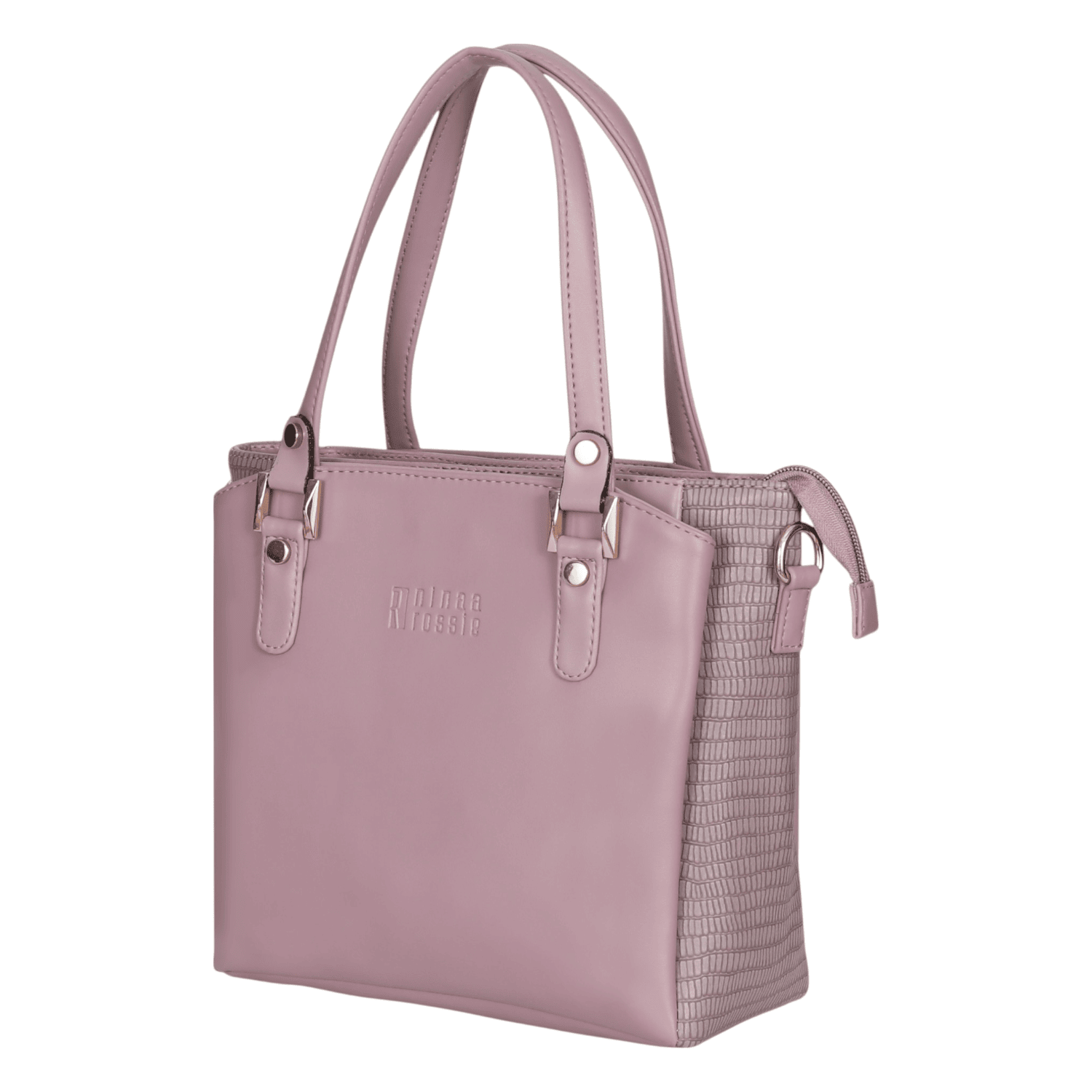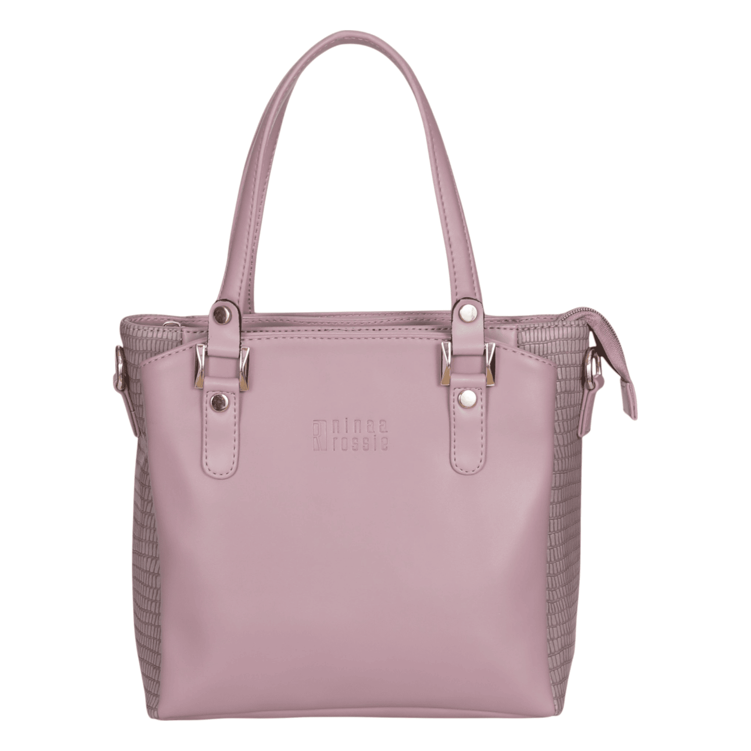 This elegant handbag showcases a sophisticated two-tone design, combining a smooth, lighter grey on the front panel with a darker, textured grey on the sides, offering a subtle contrast. It features polished gold-tone hardware that adds a touch of refinement. The interior is thoughtfully designed with multiple compartments, including secure zippered pockets, ensuring excellent organization for all your essentials. The main opening is secured by a magnetic snap, and the inside is lined with a stylish patterned fabric. This versatile accessory is perfect for adding a chic and organized touch to any daily or professional outfit.