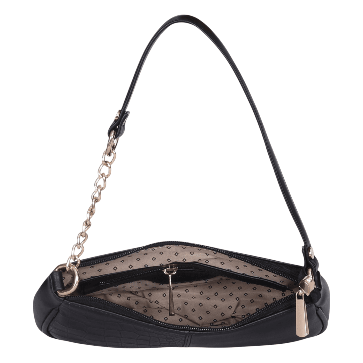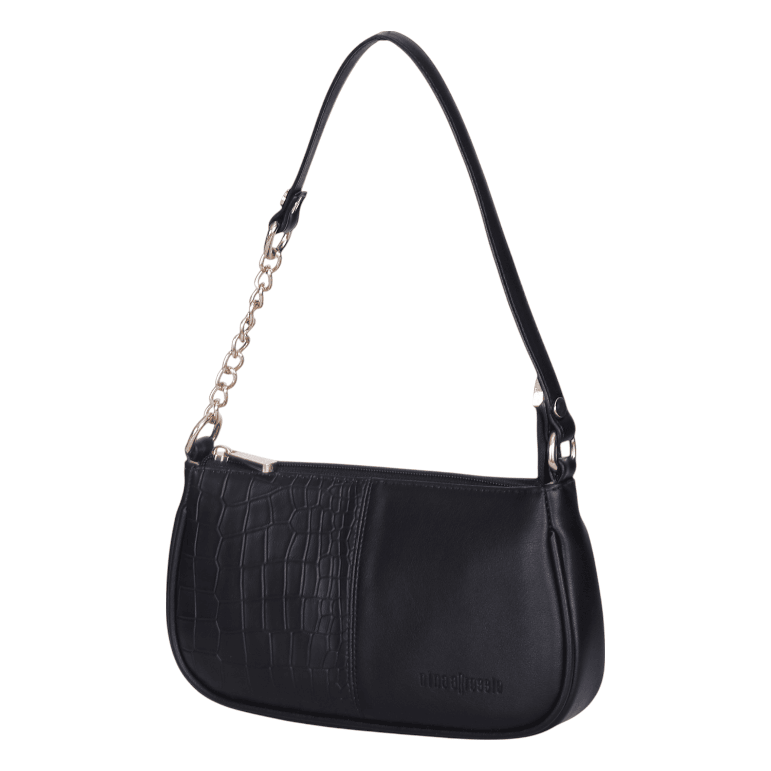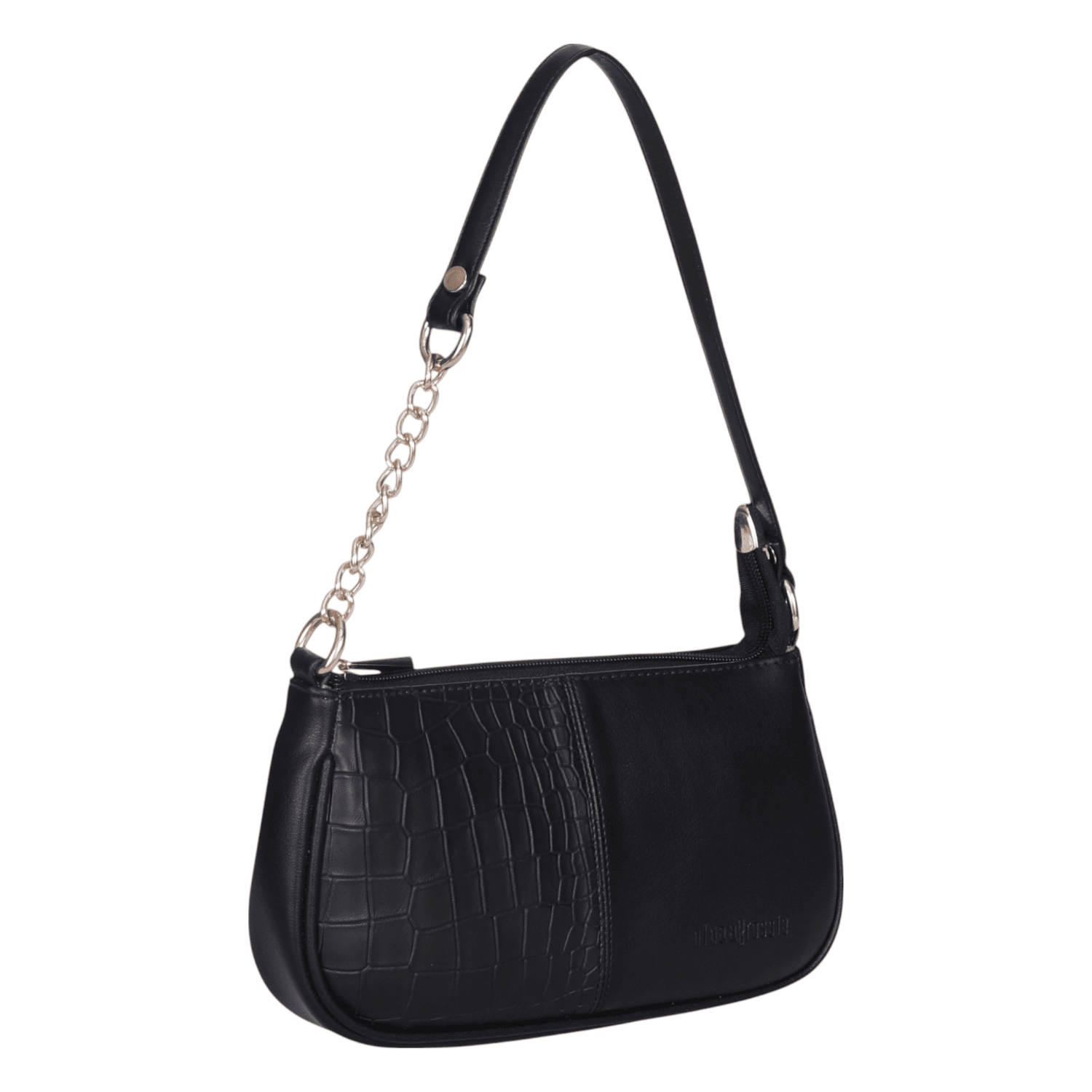 Elevate your style with this trendy and versatile black shoulder bag, a perfect blend of classic elegance and contemporary flair. Crafted from smooth faux leather with a stylish croc-embossed detail, this bag is designed for effortless everyday wear or a night out.