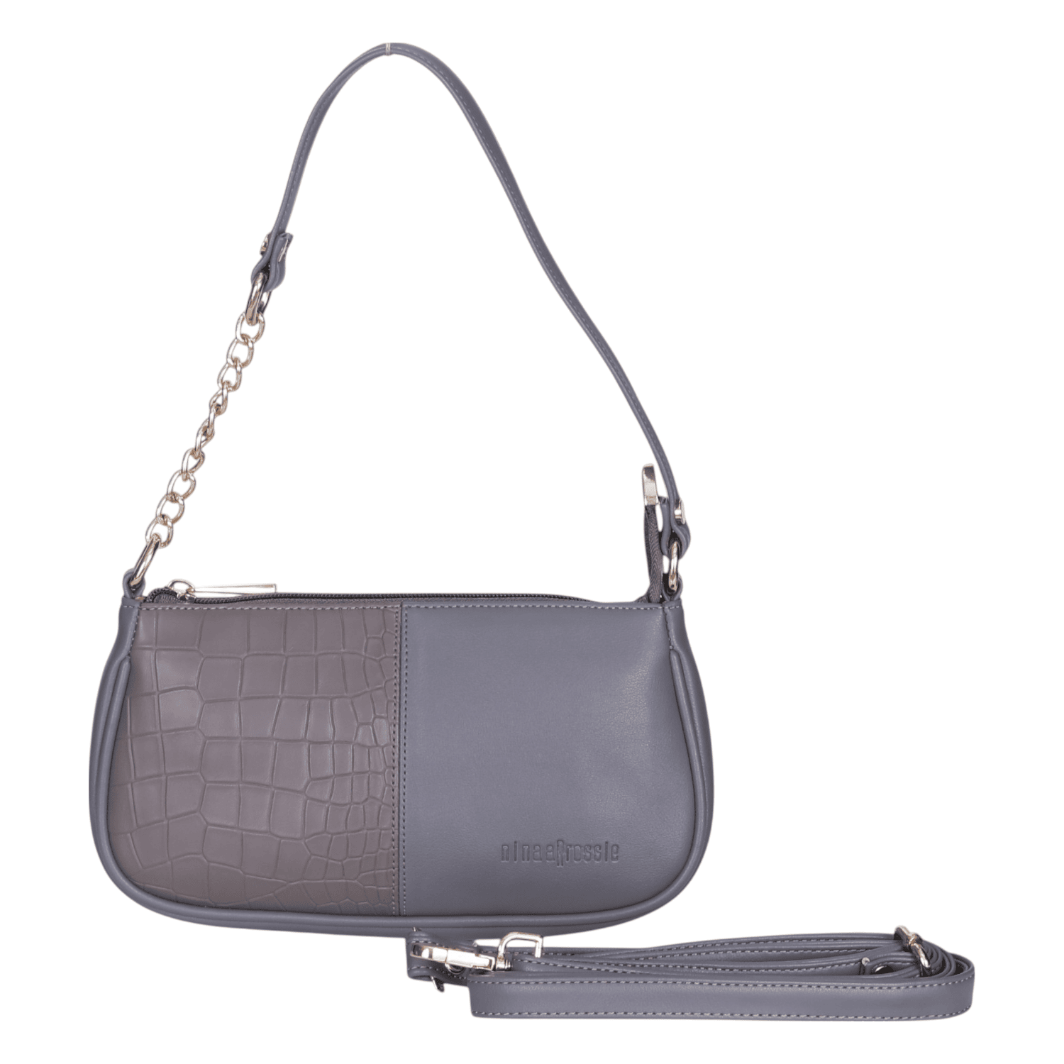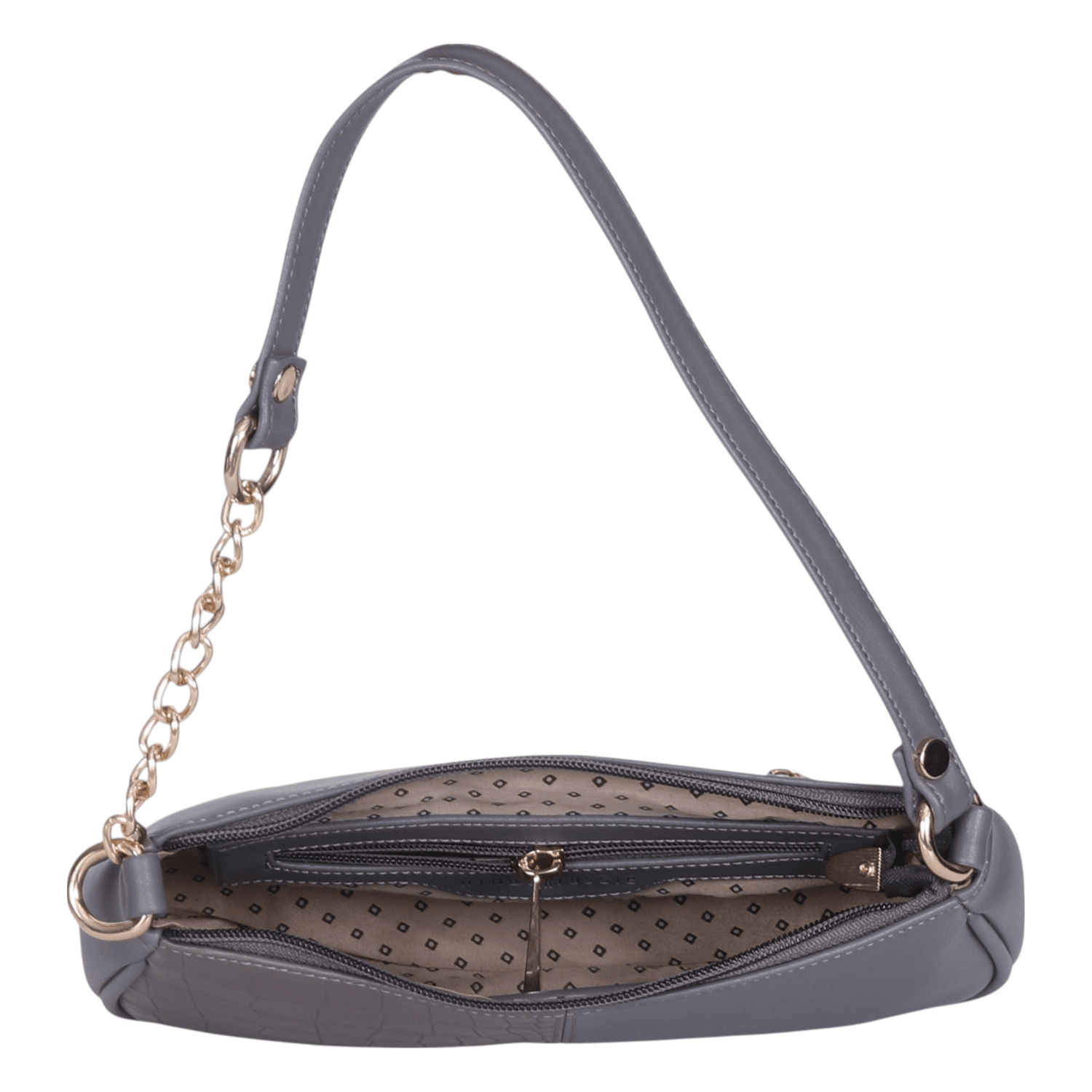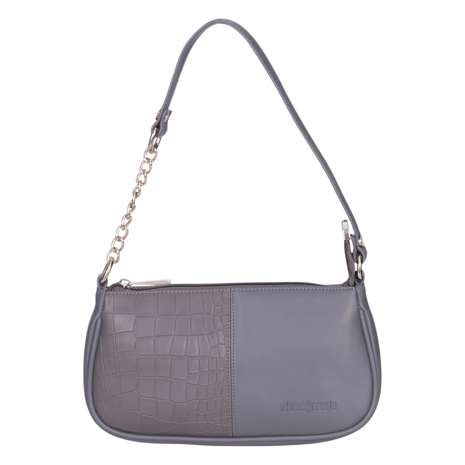 Elevate your style with this trendy and versatile grey shoulder bag, a perfect blend of classic elegance and contemporary flair. Crafted from smooth faux leather with a stylish croc-embossed detail, this bag is designed for effortless everyday wear or a night out.