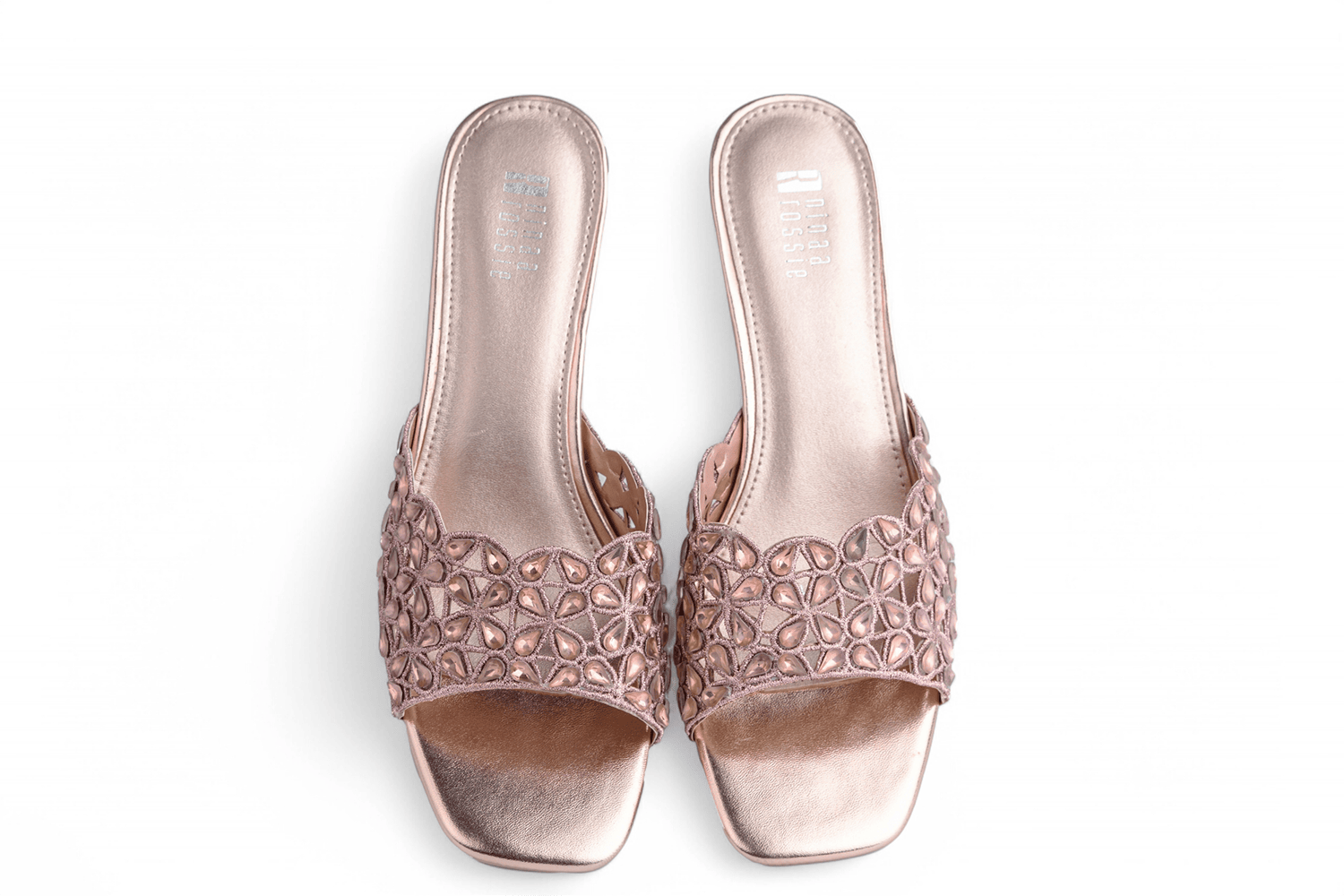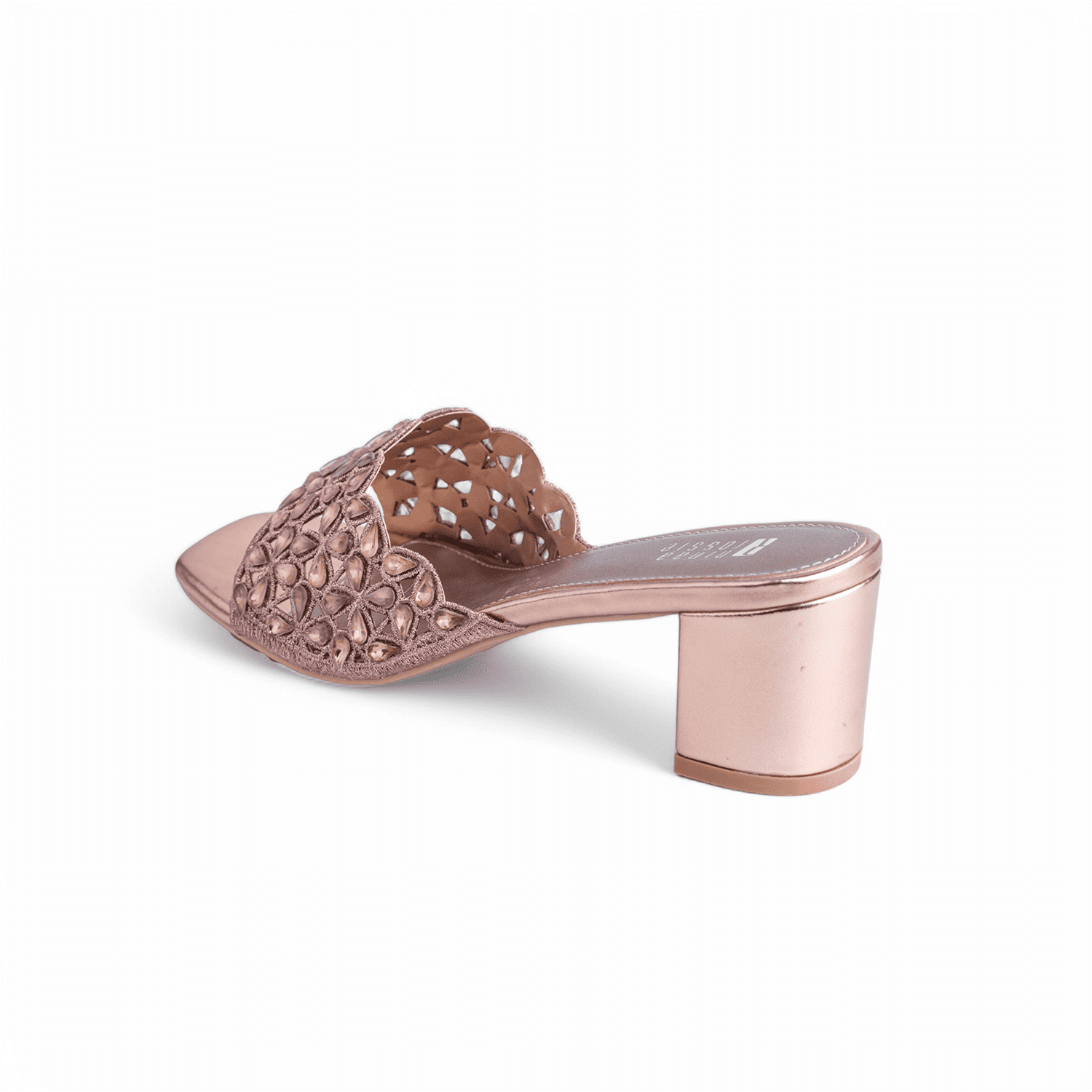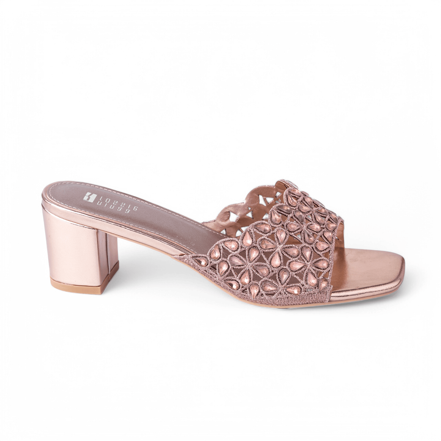 Glamourous, sparkling and in house favorite! A deep champagne base, with highlighted cutwork mirror jaal. Made on our all new peak heel, with a broad, round heel for extra comfort with style.You can style it with your lehengas on a wedding and festive occasion. Add it to your closet now.