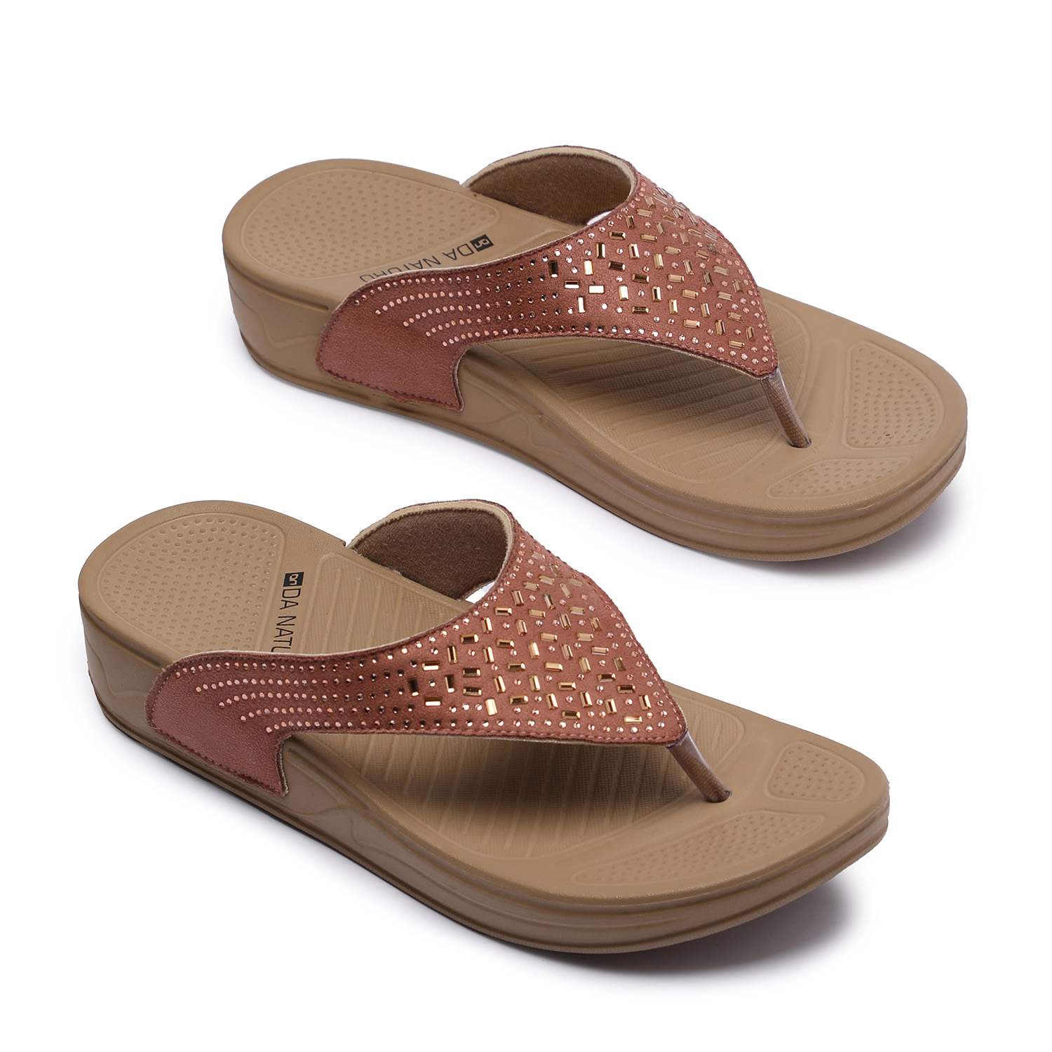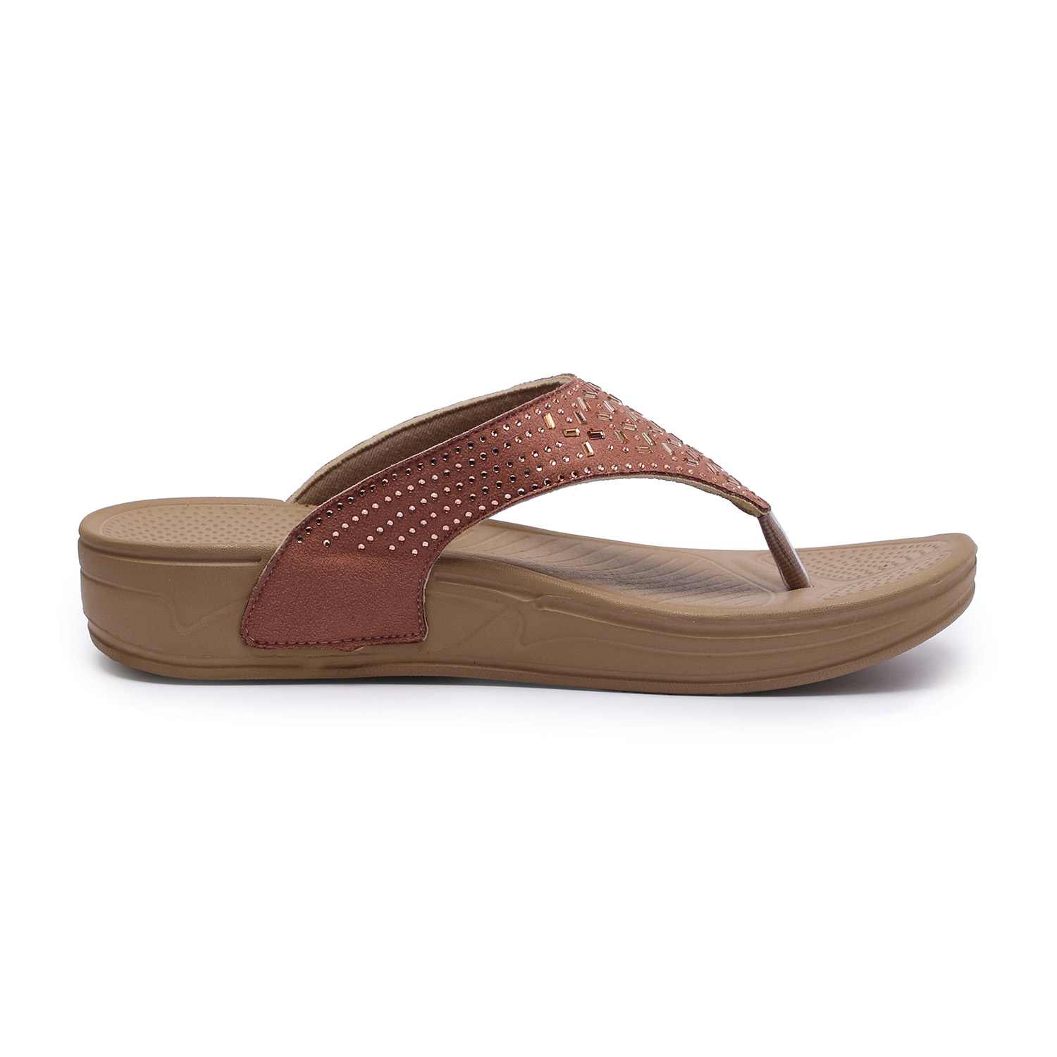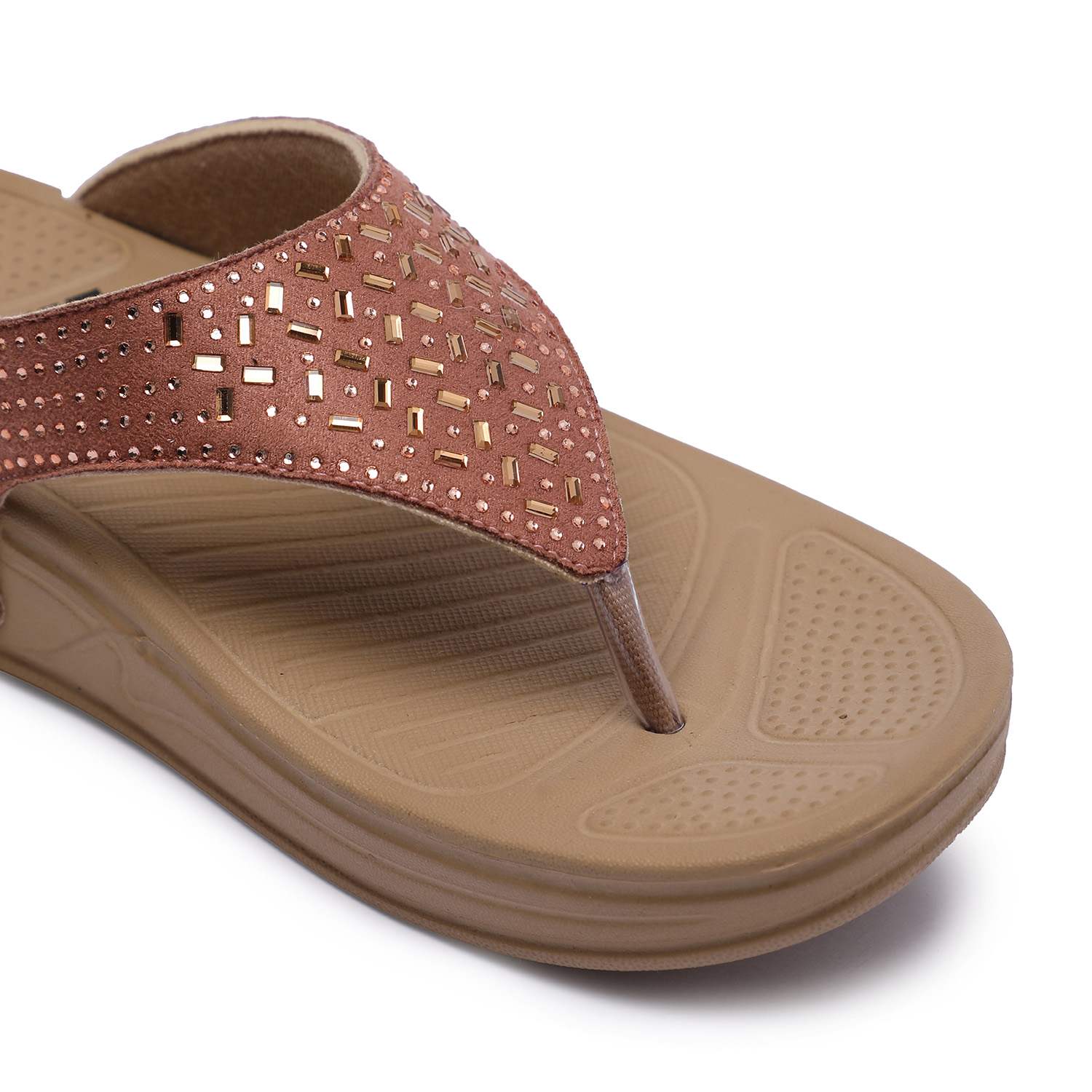 Elevate your everyday style with these chic peach flip-flops featuring a stylish cutwork design on the straps. Designed with a comfortable wedge sole and ergonomic footbed, these sandals offer both style and support. The upper strap is crafted with a subtle shimmer and geometric perforations, adding a touch of elegance to your casual ensemble.
