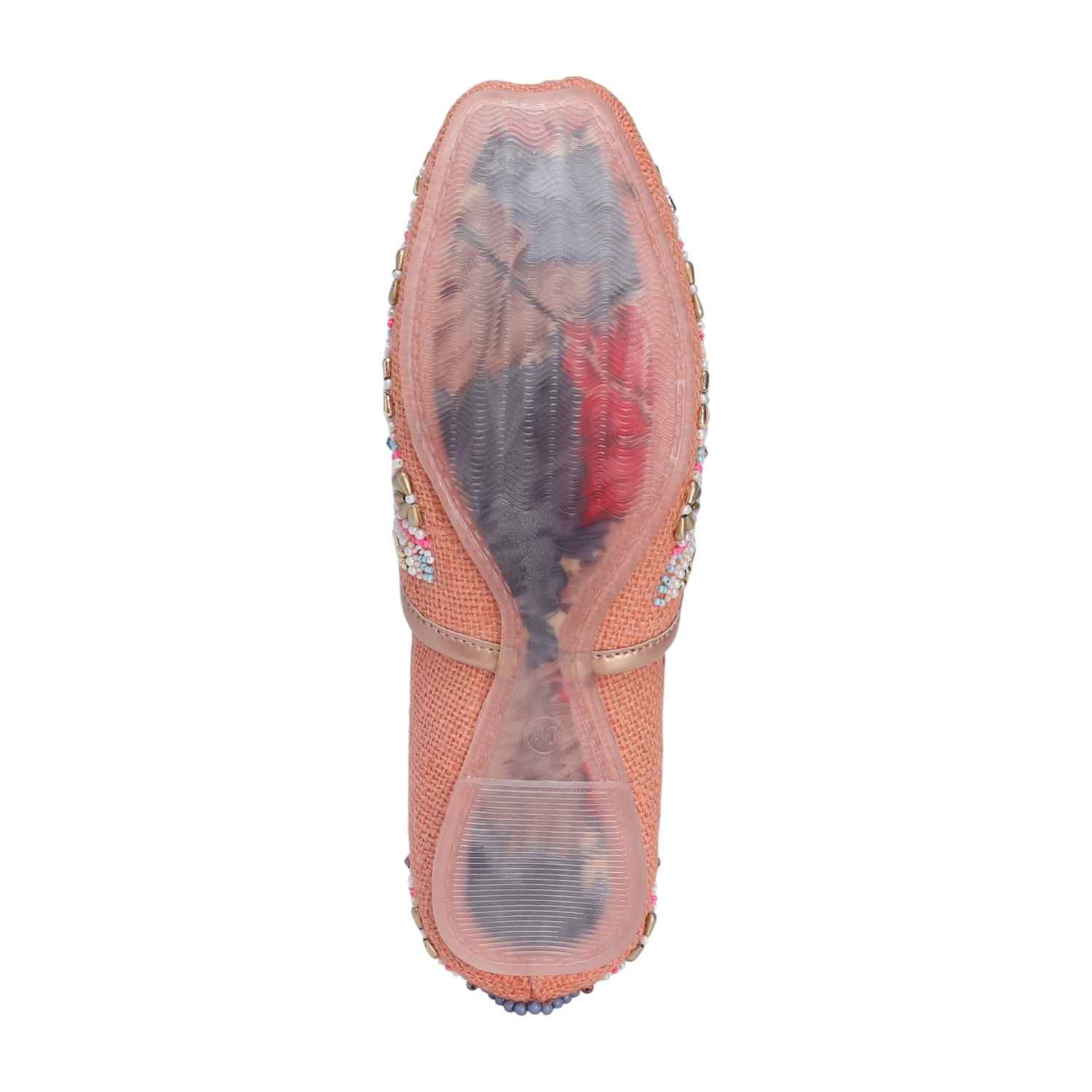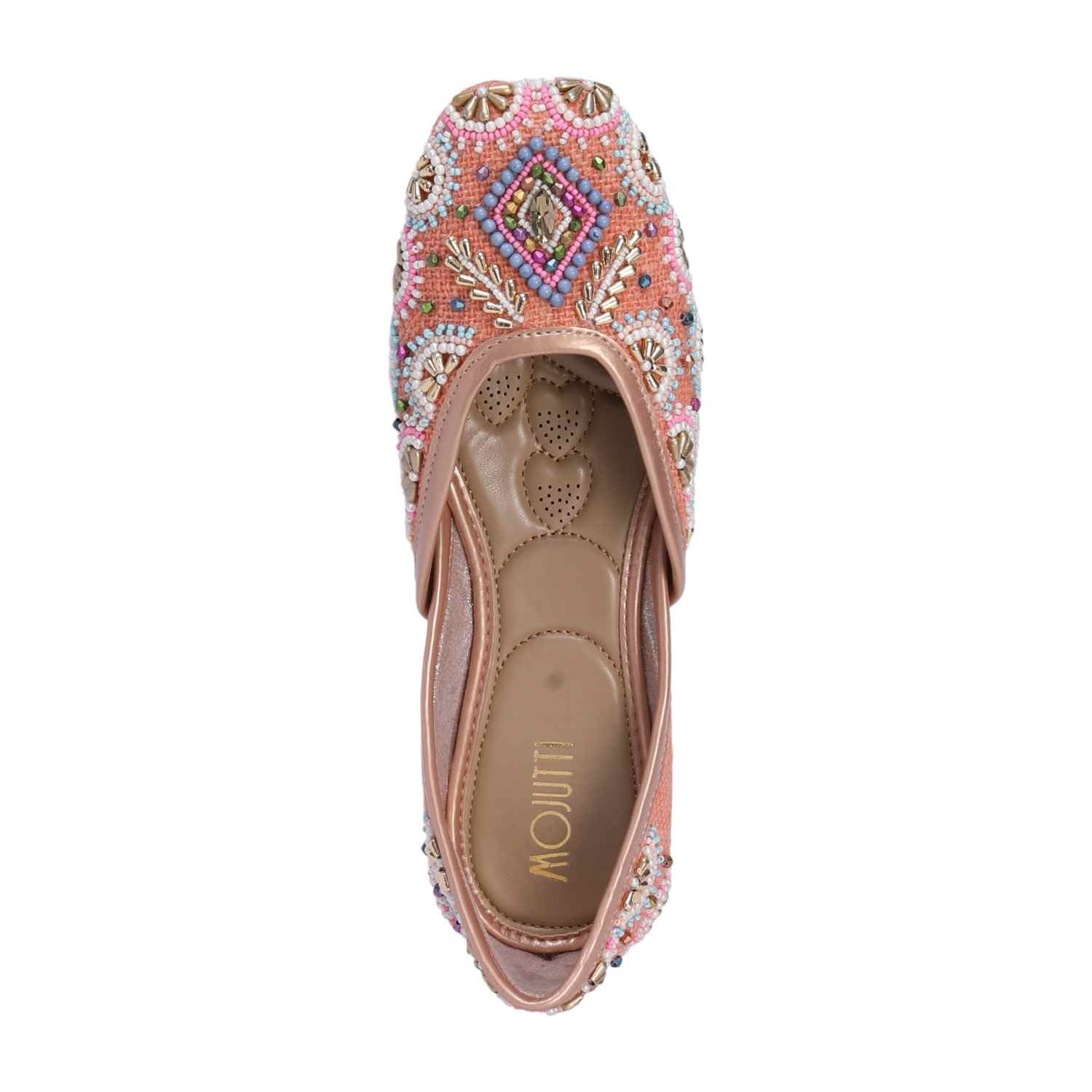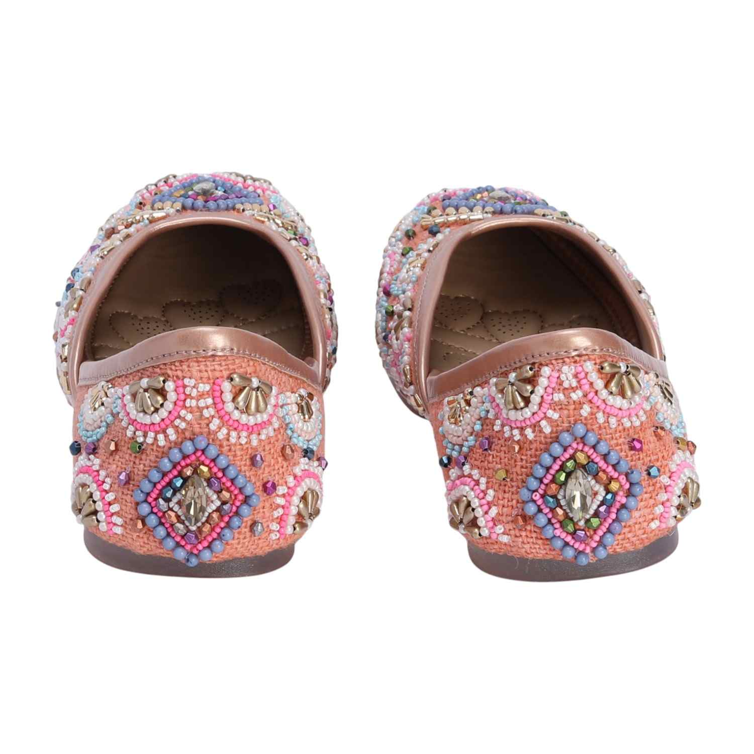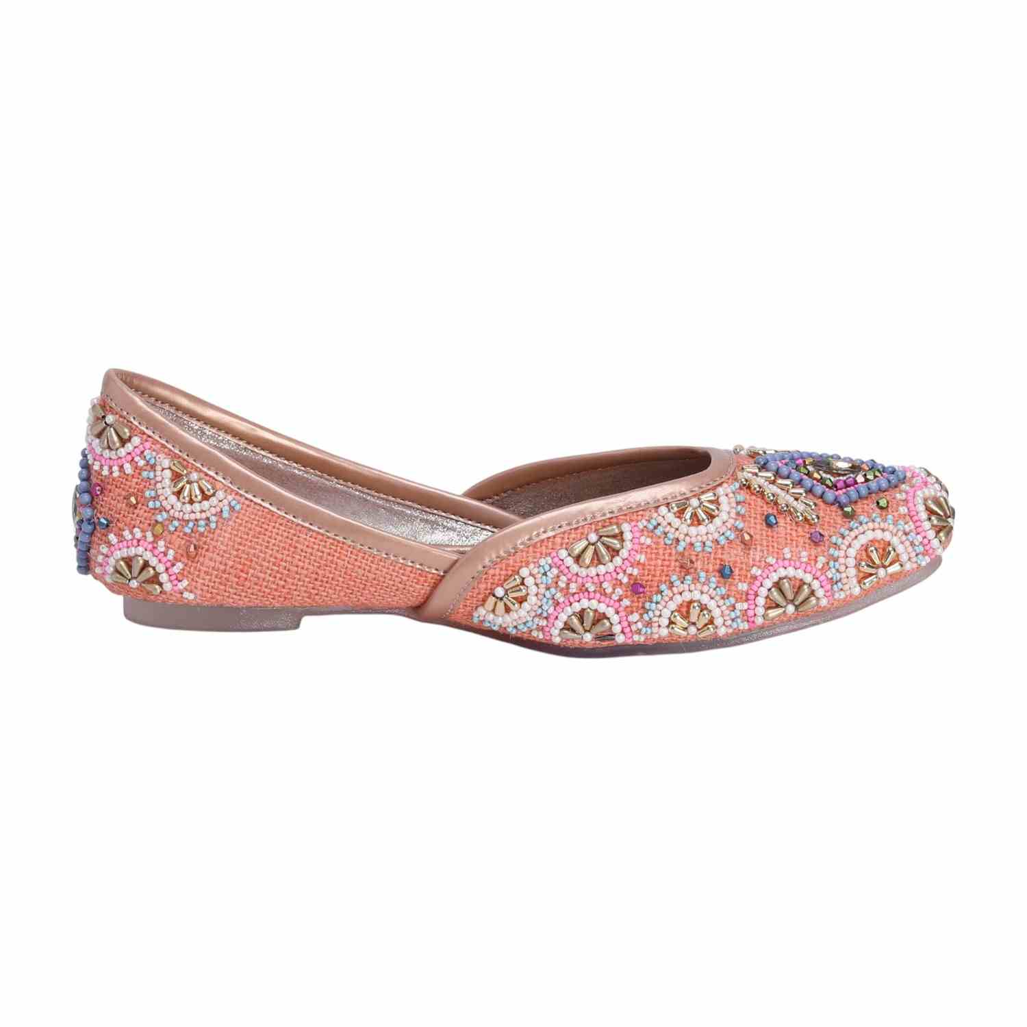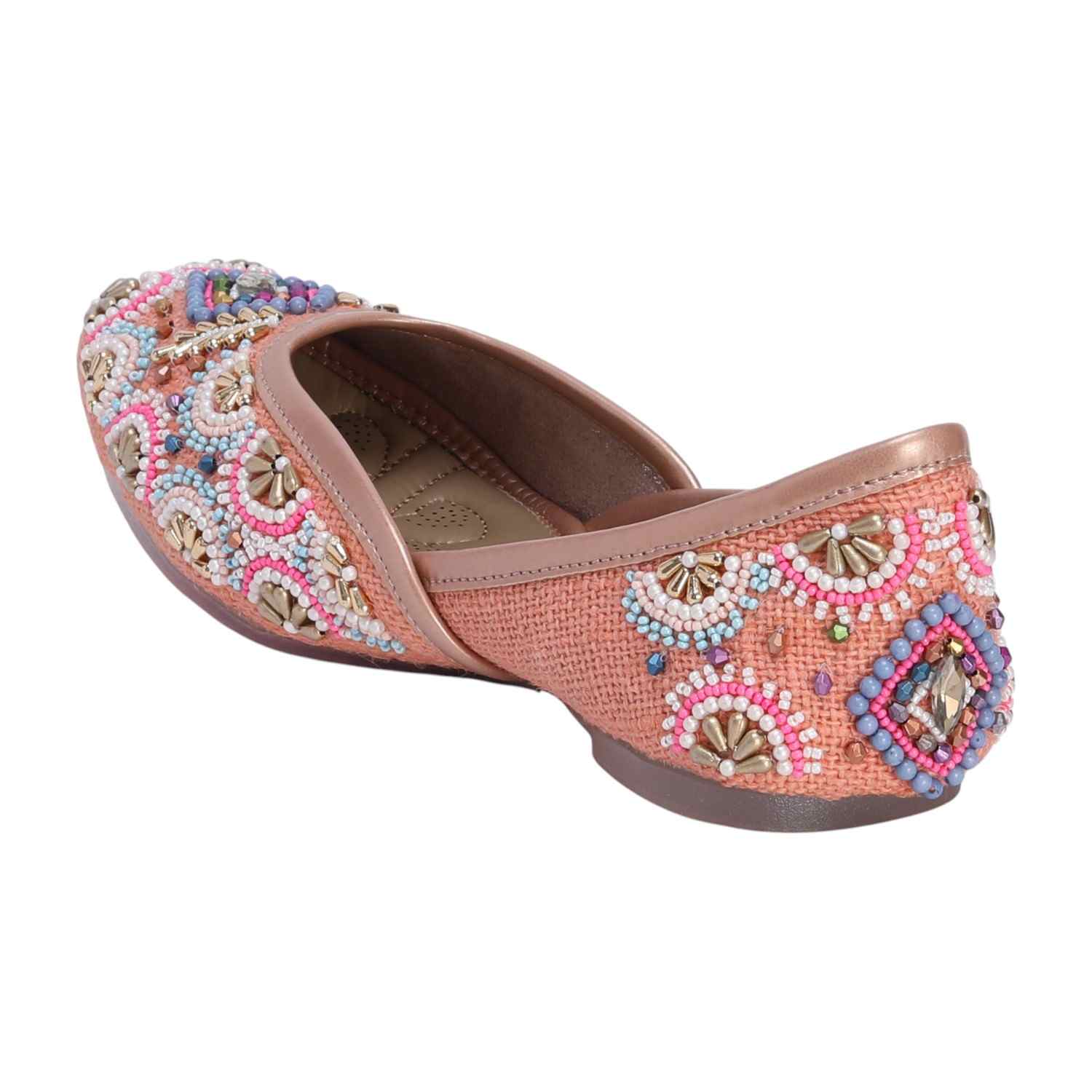 Indulge in elegance with these handcrafted peach mojaris, adorned with exquisite pearl embellishments.