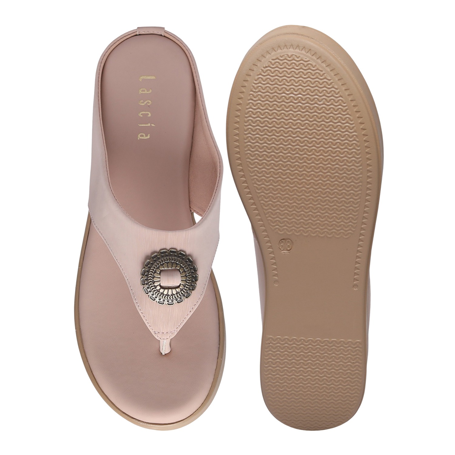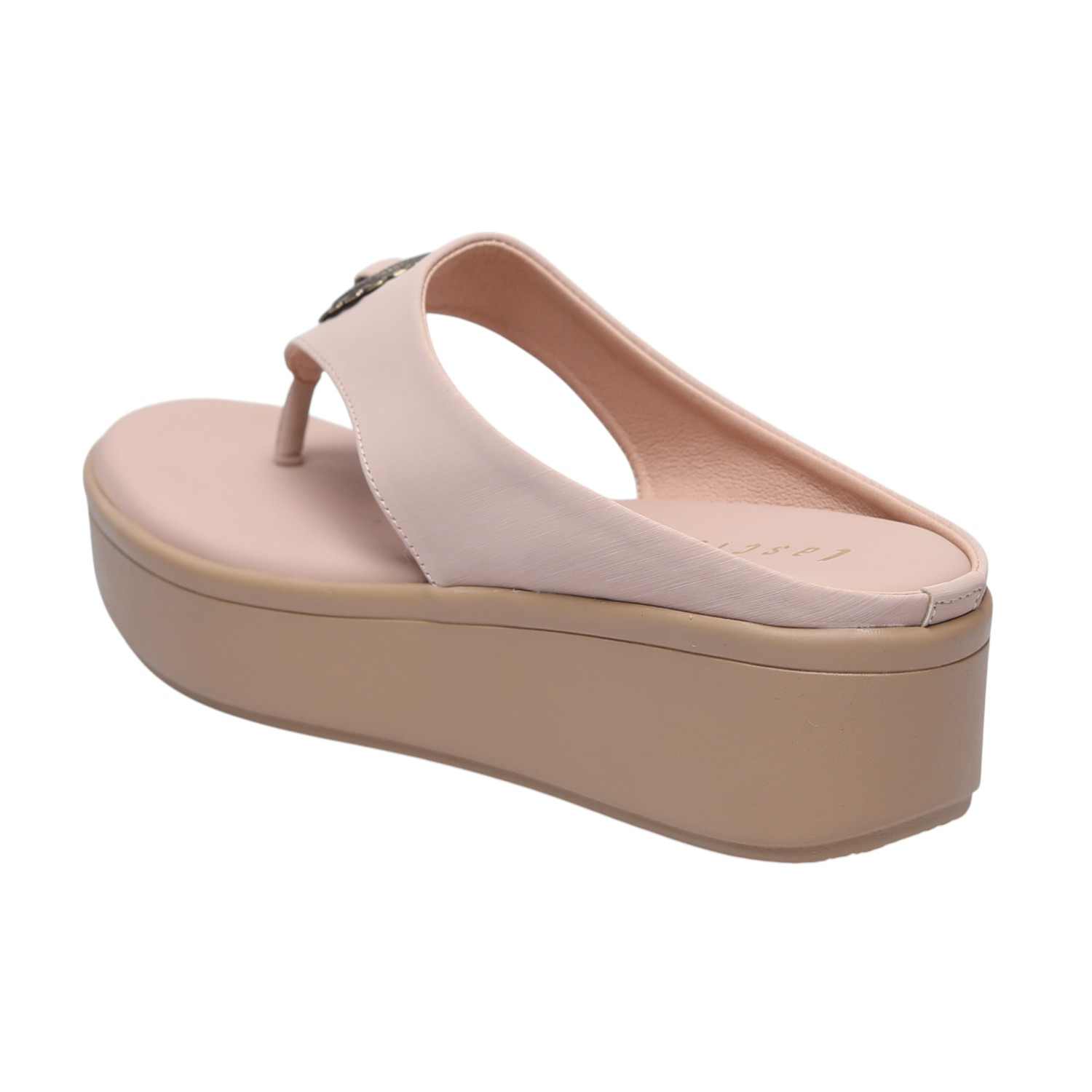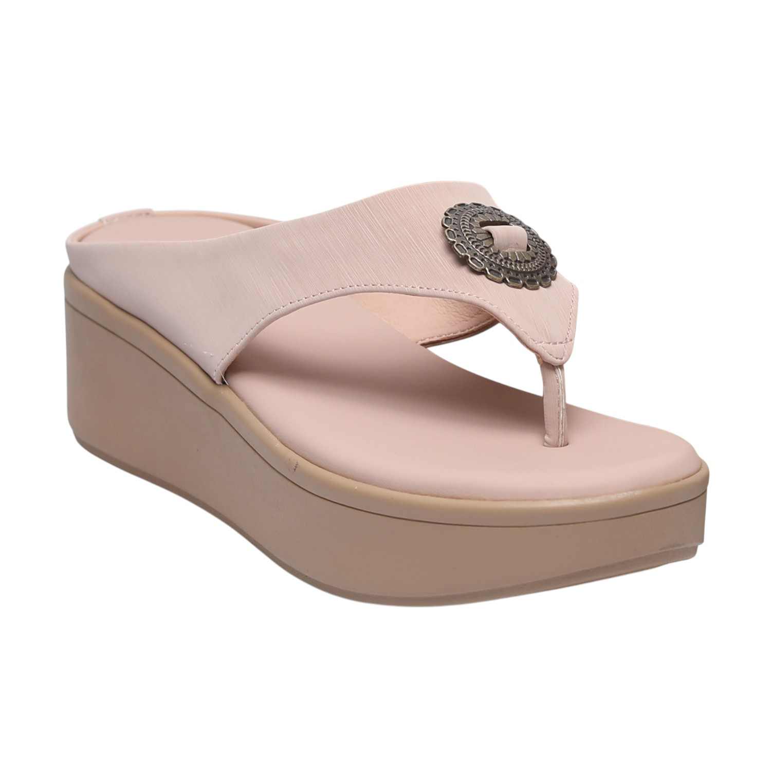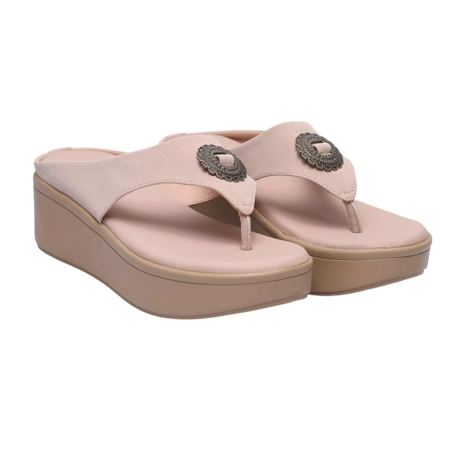 A perfect blend of fashion and function, these nude rose comfort wedges combine a sleek thong silhouette with distinctive metallic detailing and practical comfort. The versatile neutral hue ensures they are a chic and adaptable addition to your footwear collection for various occasions.