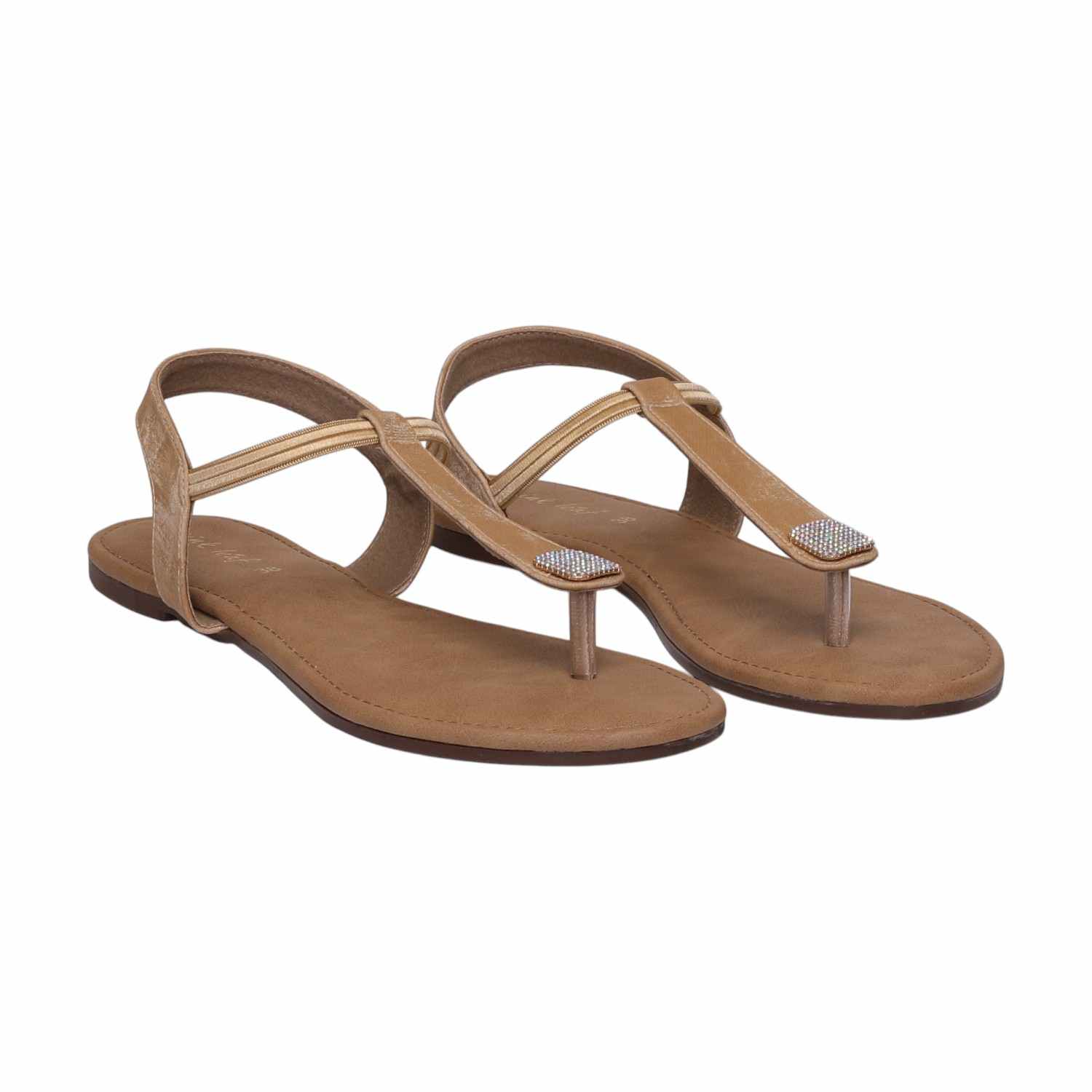 This Stylish T-Strap Sandal Offers The Perfect Blend Of Elegance And Comfort. Designed With A Soft Cushioned Sole, It Features A Sleek Beige Finish And A Subtle Touch Of Sparkle On The Toe Detail. The Elasticated Ankle Strap Ensures A Secure Fit, Making It Ideal For All-Day Wear.