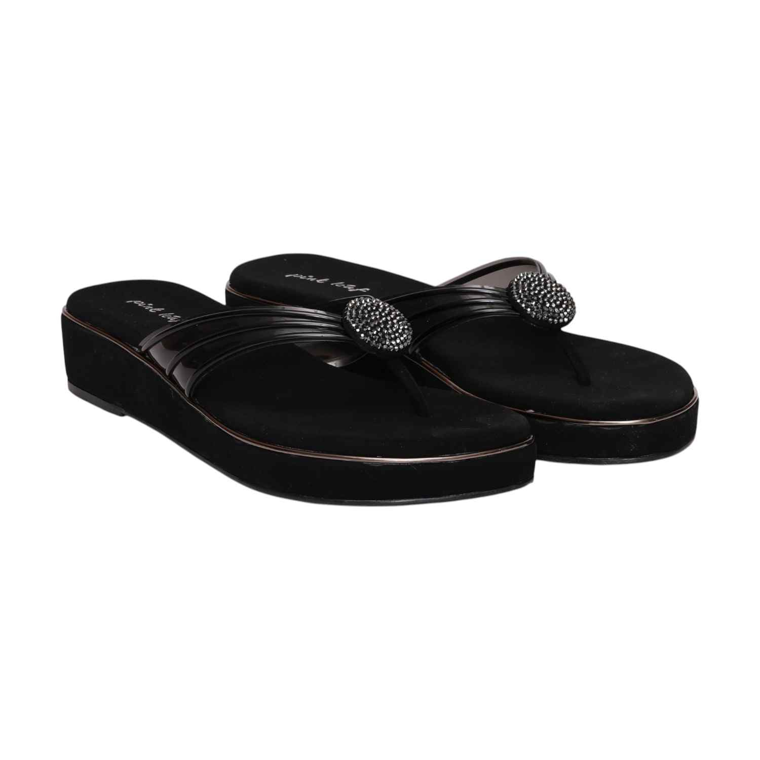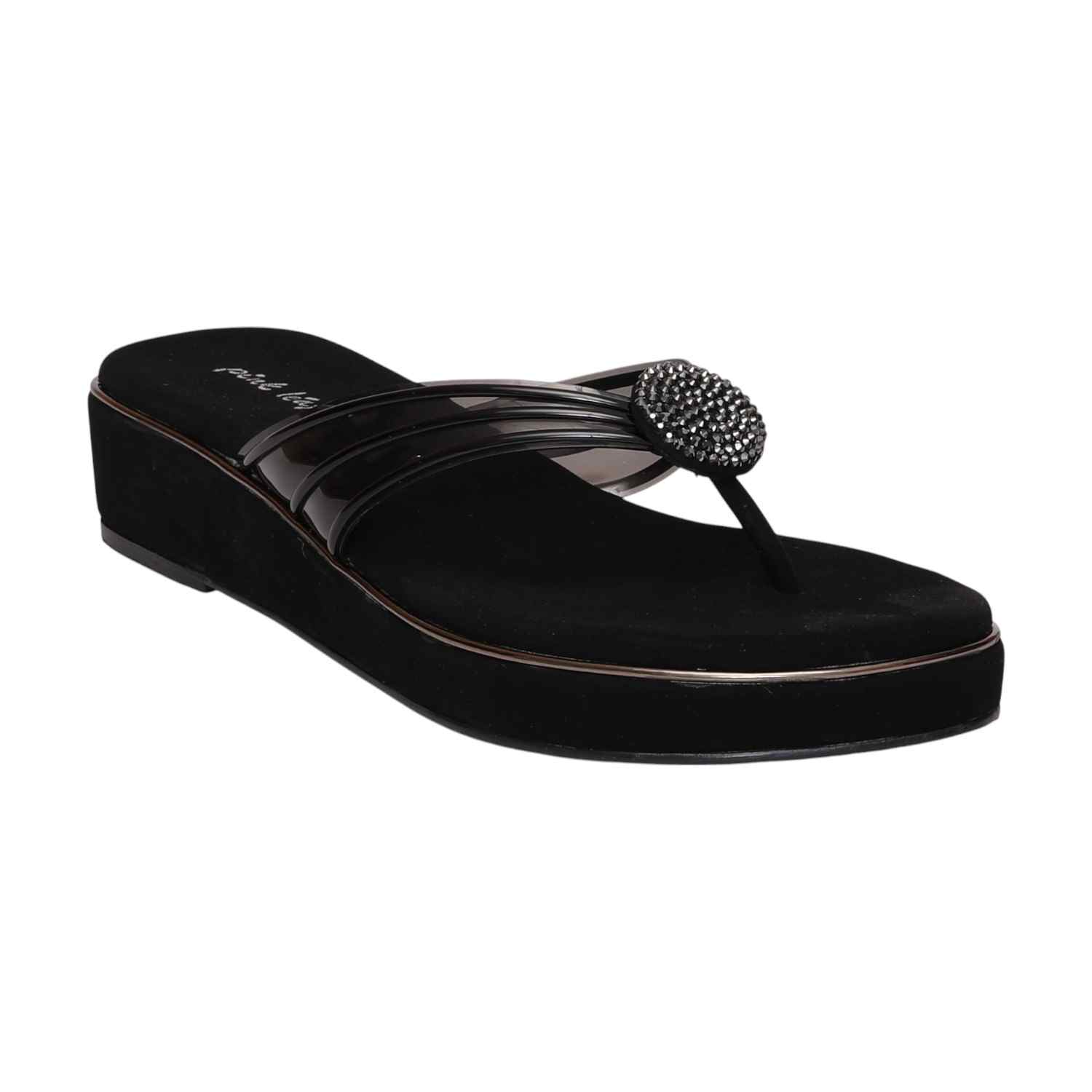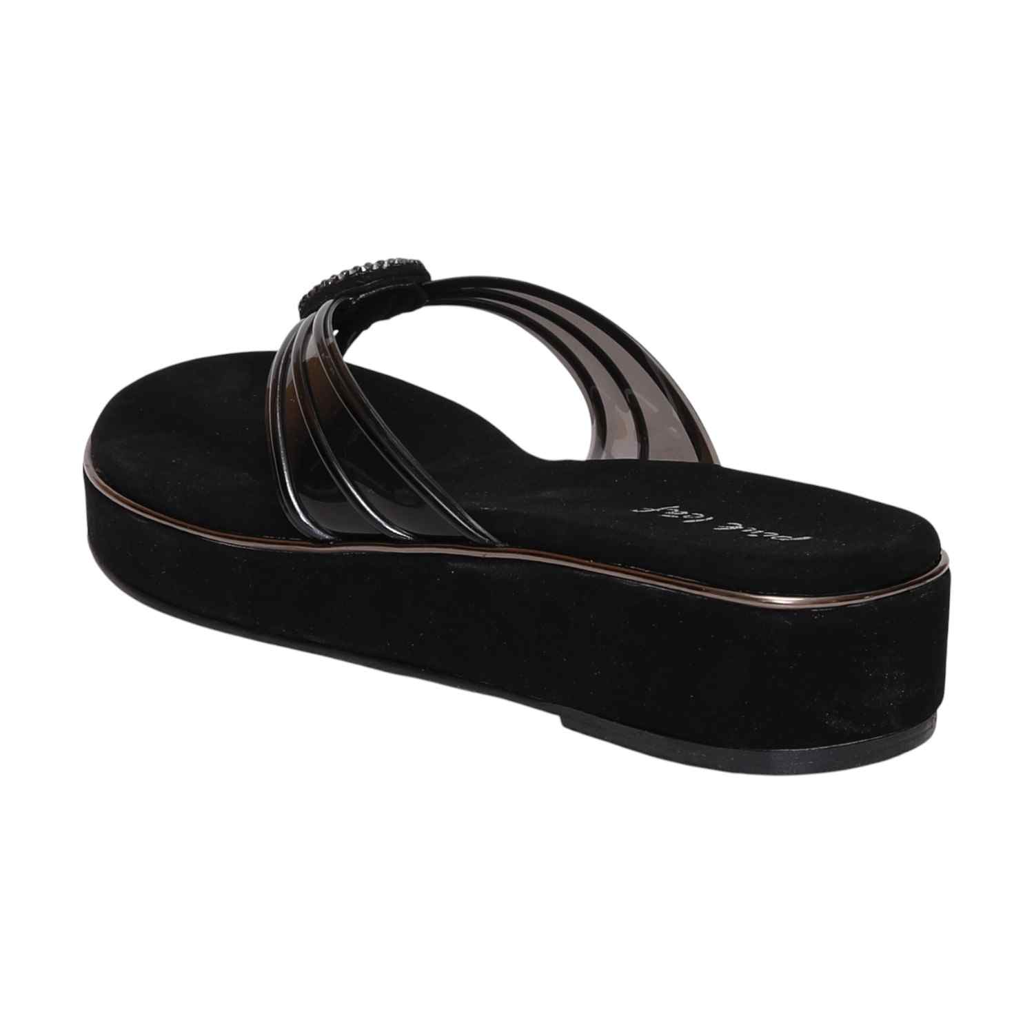 nfuse your look with subtle glamour using these Black Aura Transparent Wedges. The clear straps create a sophisticated, barely-there effect, while the shimmering metallic platform and comfortable wedge ensure both chic appeal and all-day ease.