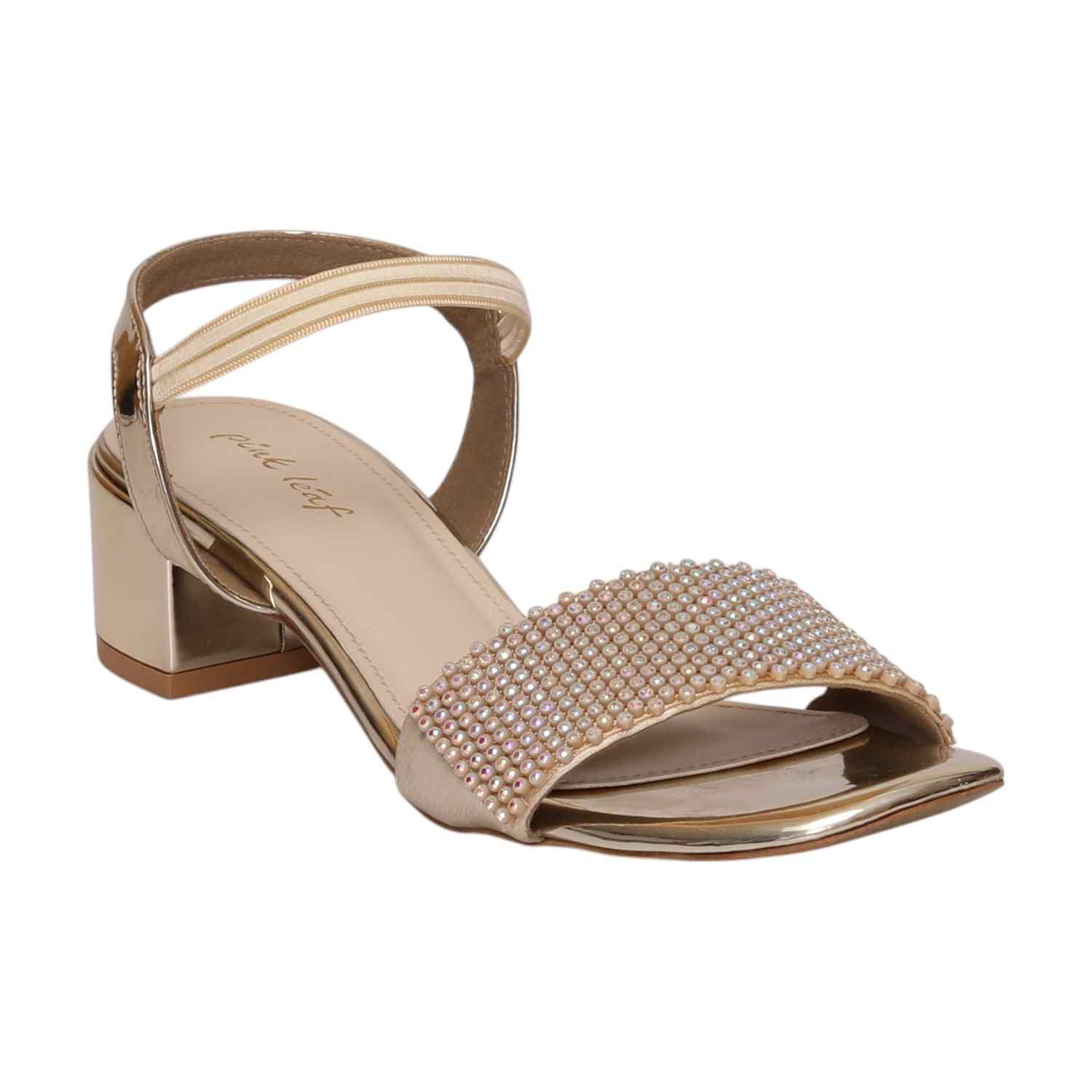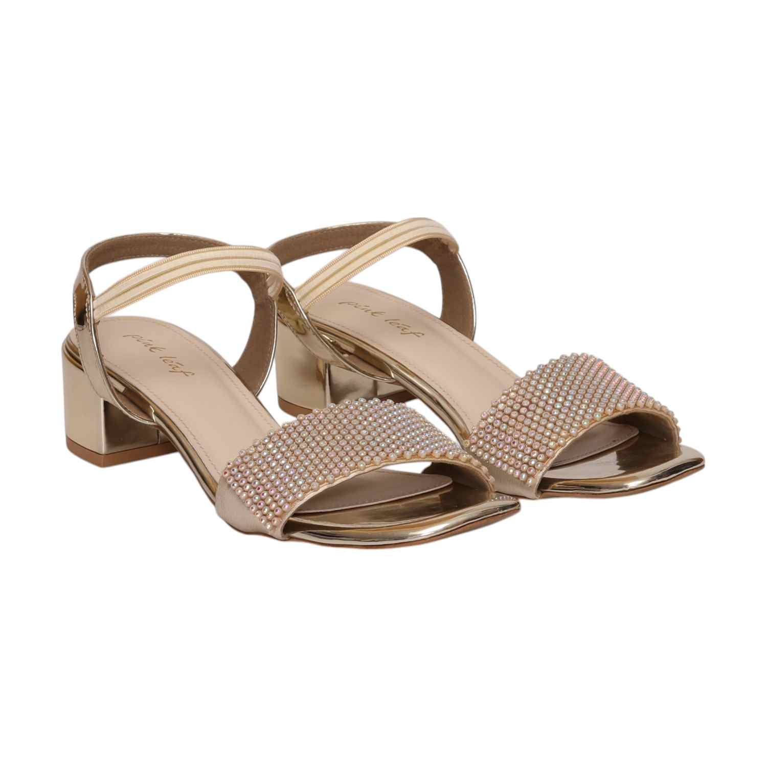 Add instant sparkle to your step with these Gold Pearl-Embellished Block Heels that blend bling with comfort. The wide studded front strap catches light from every angle, while the low block heel gives you stable glam all day (or night). Whether you’re dancing at a wedding or keeping it luxe at brunch, this pair is made to shine.