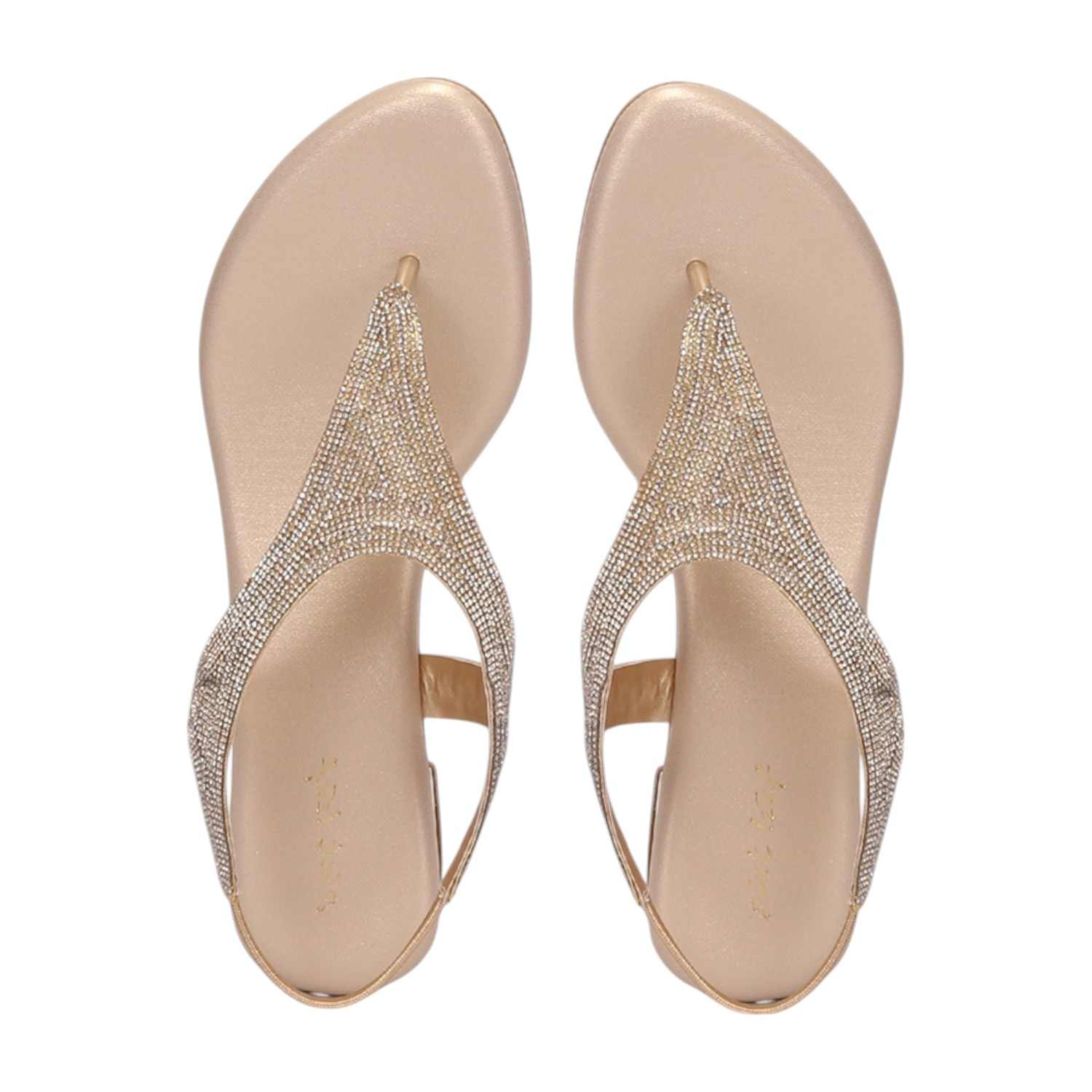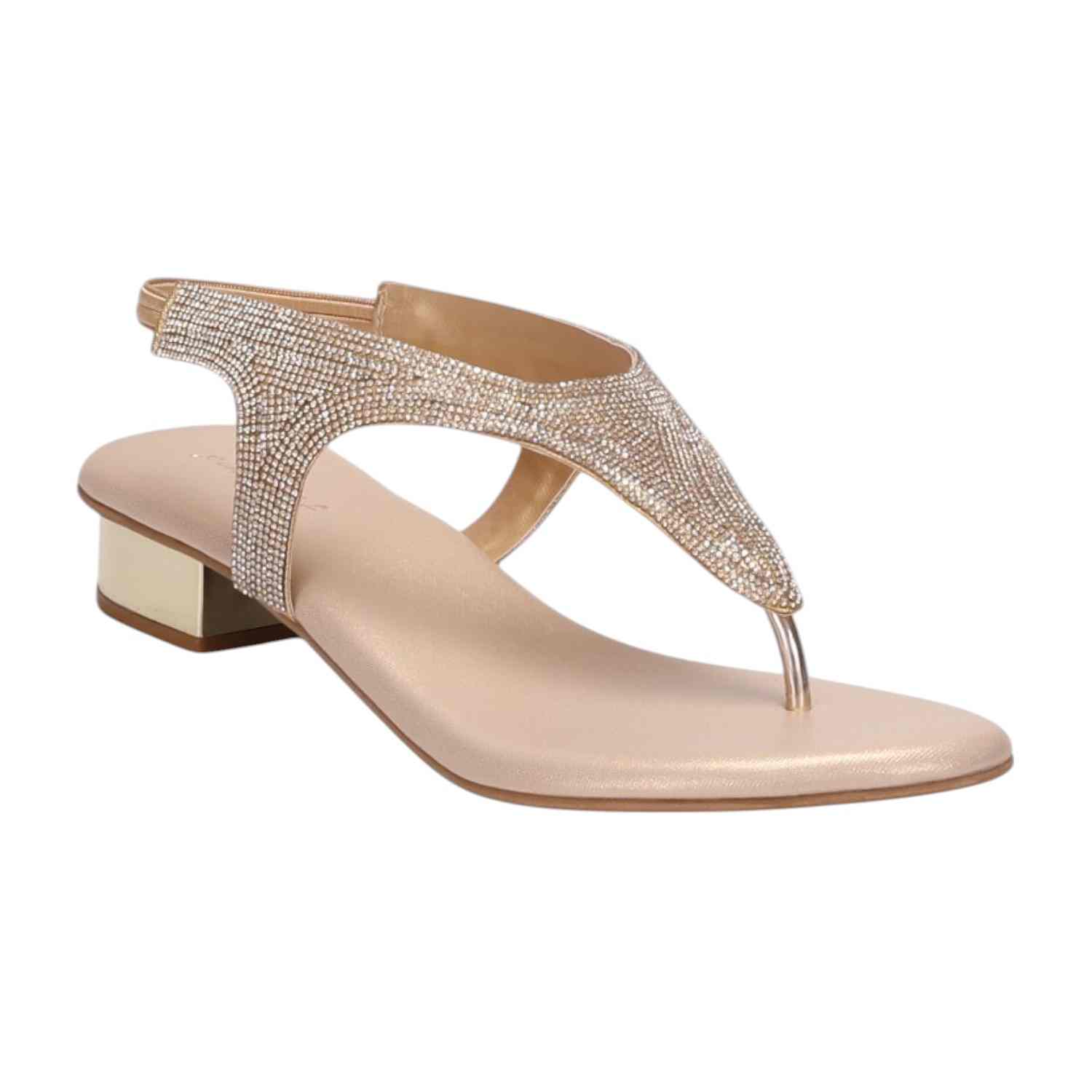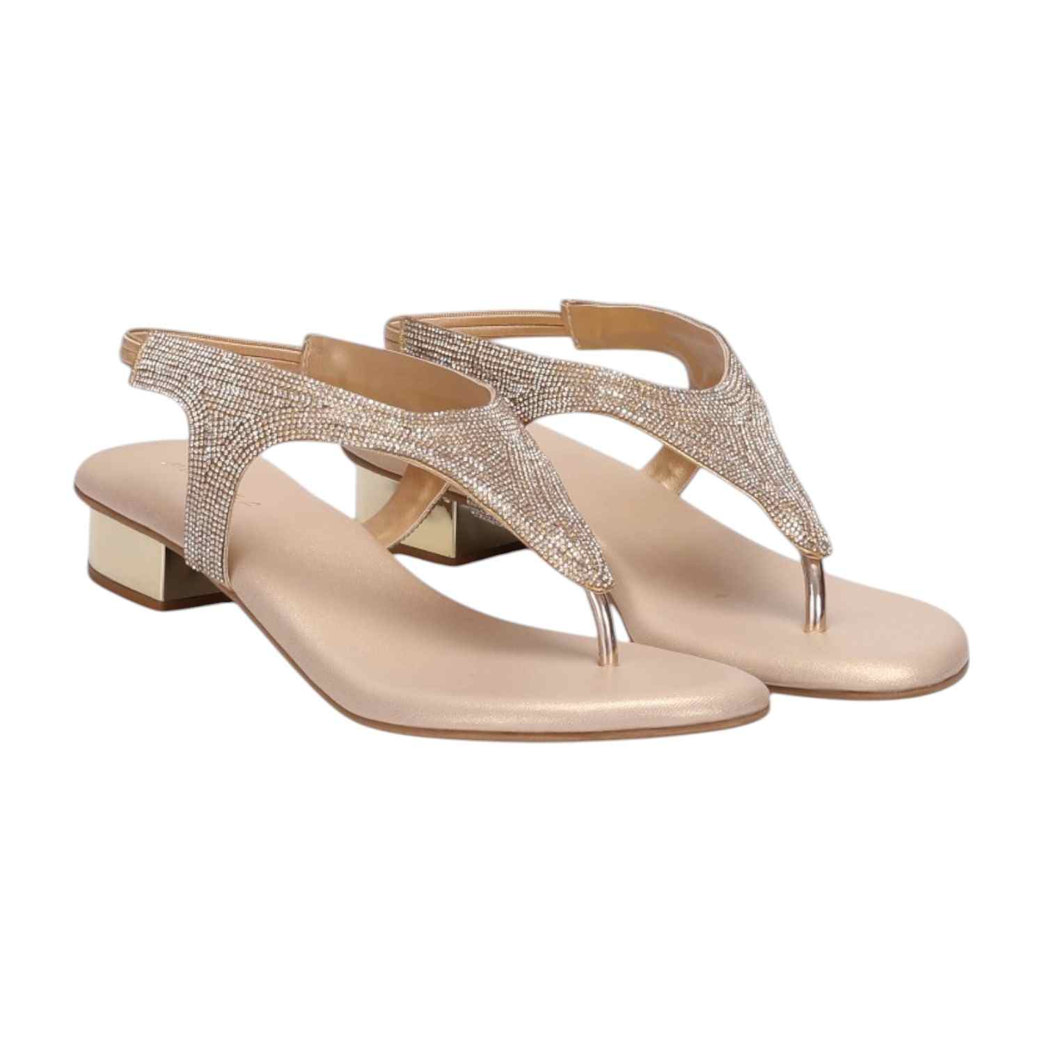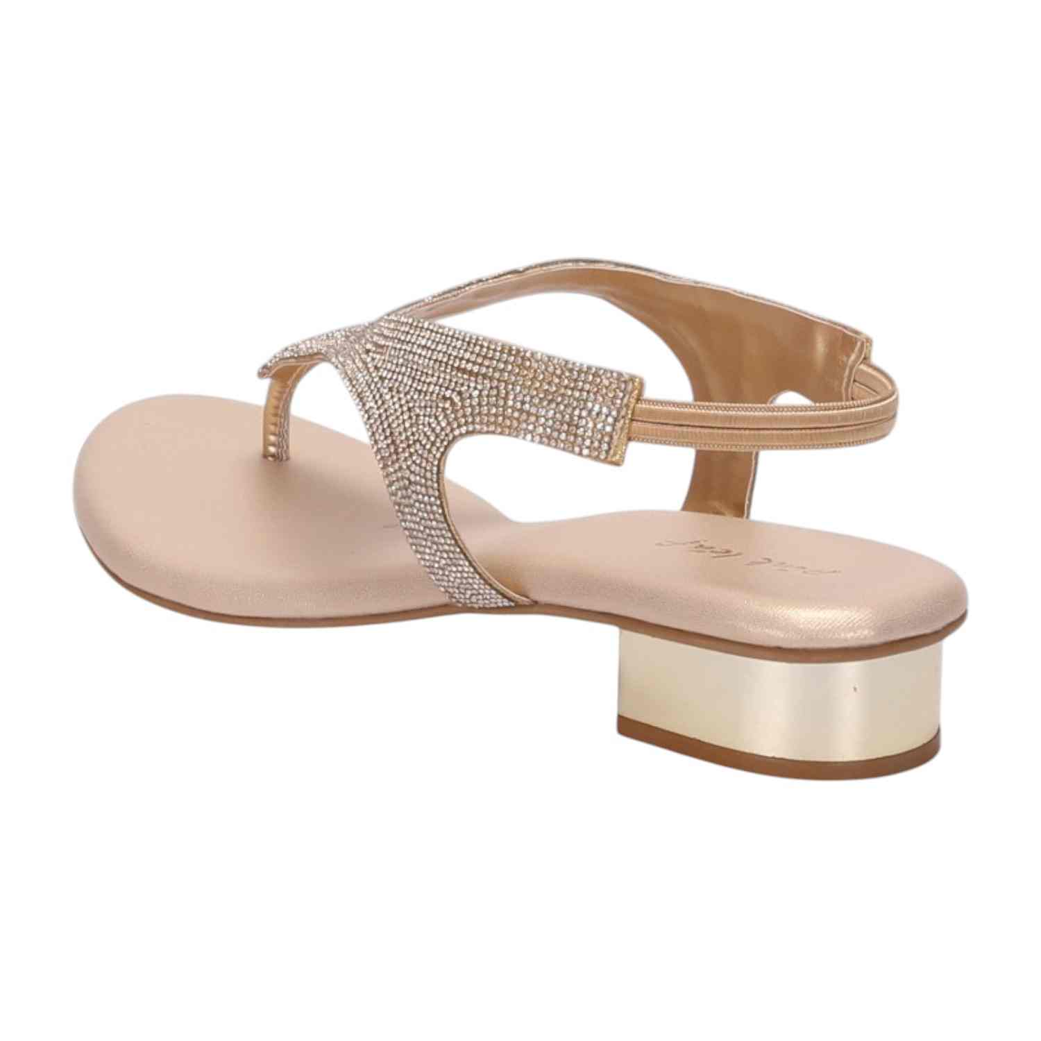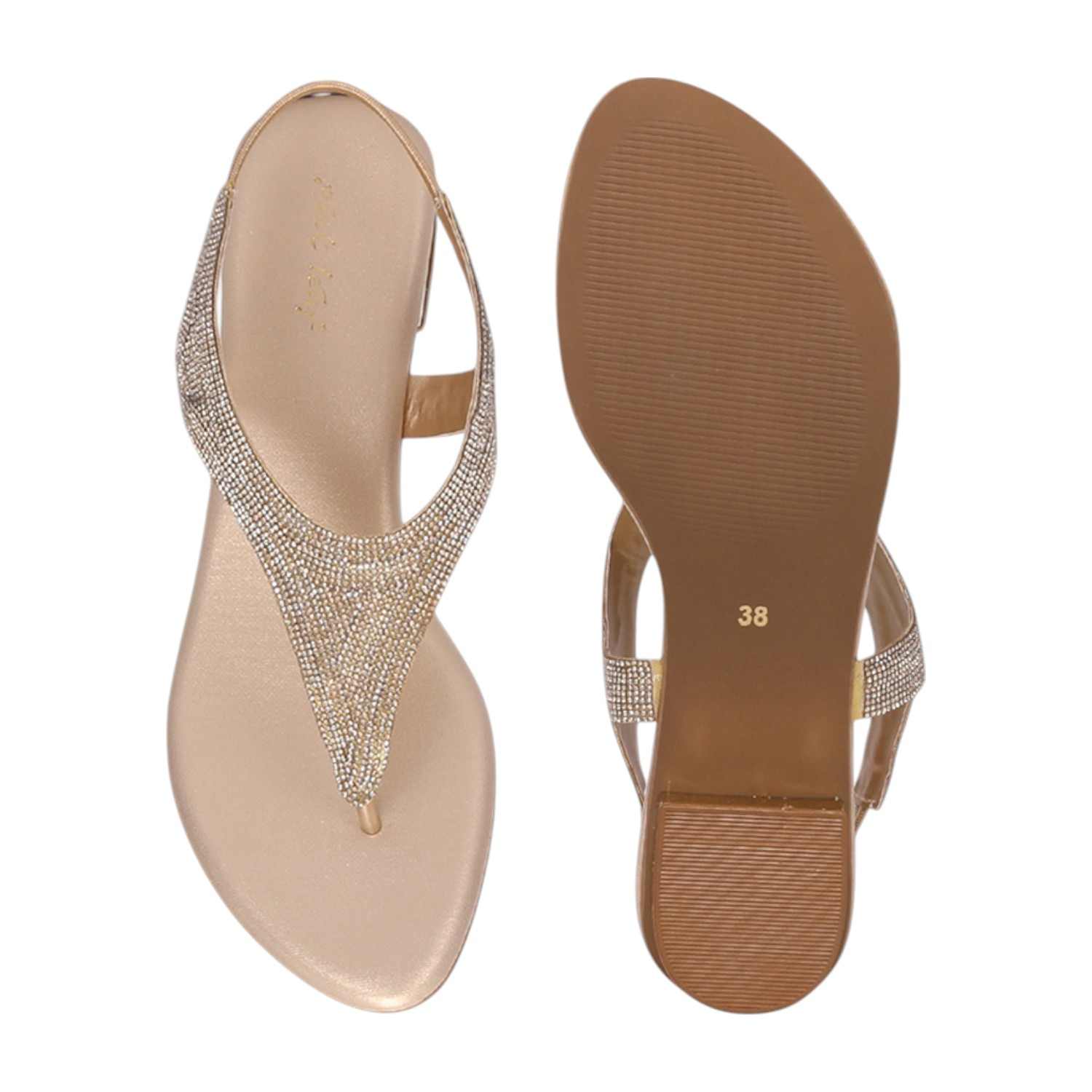 These Golden Rhinestone Low Heel Sandals offer a perfect blend of captivating dazzle and comfortable elegance. They feature a wide, V-shaped strap richly adorned with rows of shimmering rhinestones, a delicate thong, and a supportive low block heel for stable and stylish lift.
