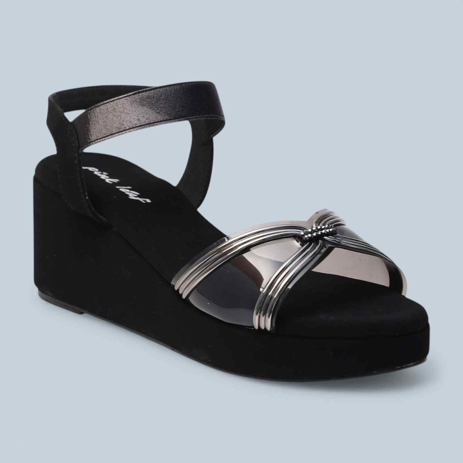 Pinkleaf Women’s Black Metallic Cross-Strap Wedge Sandals