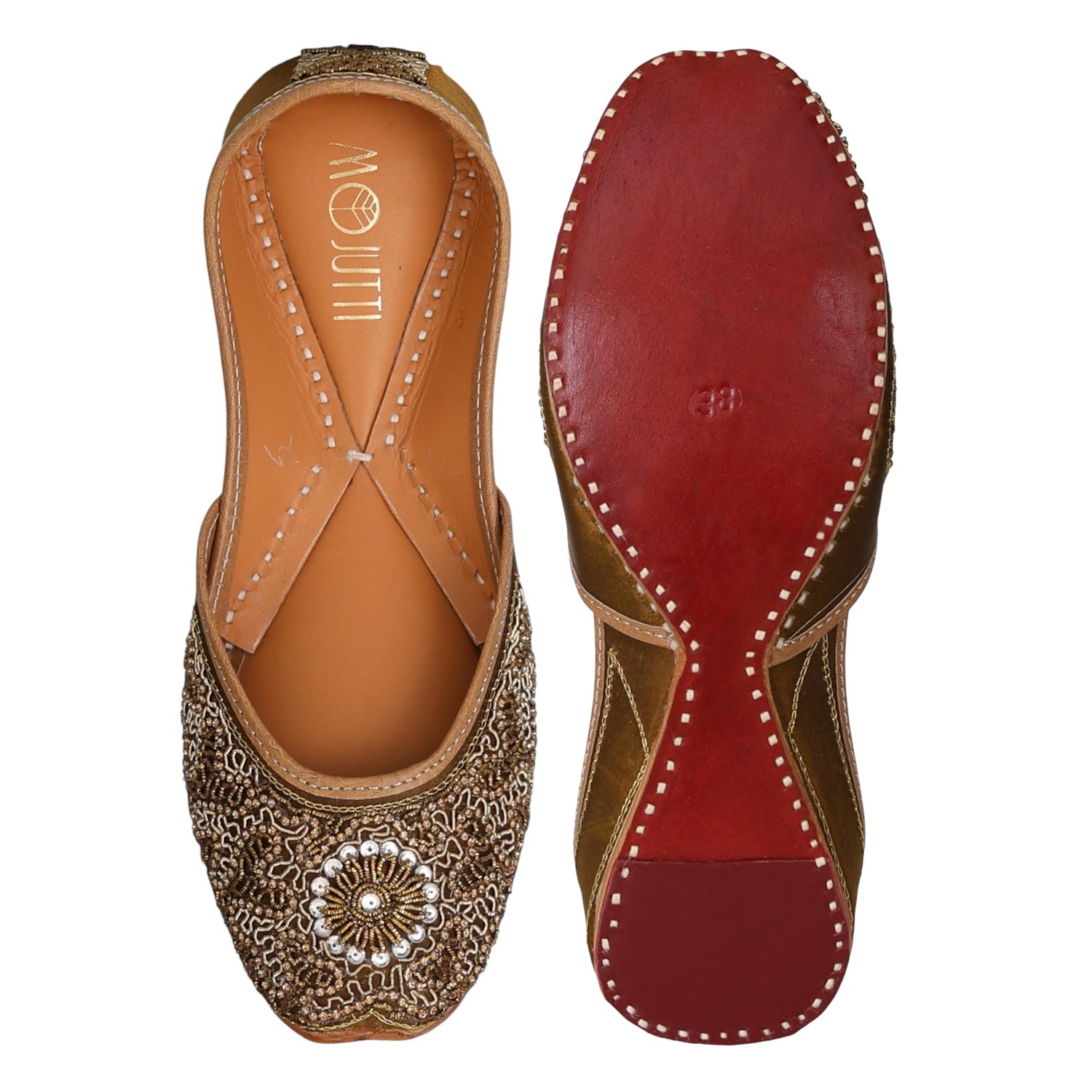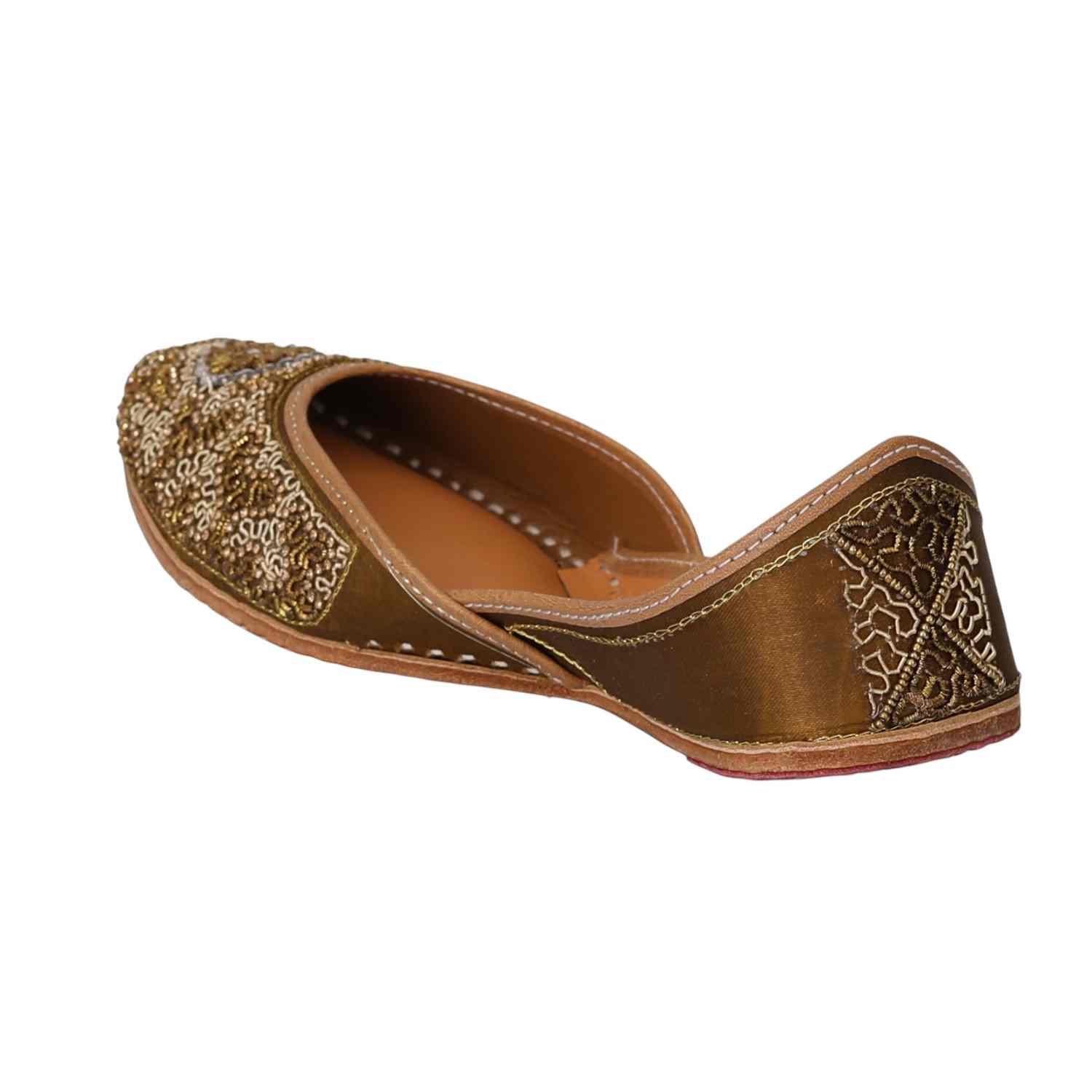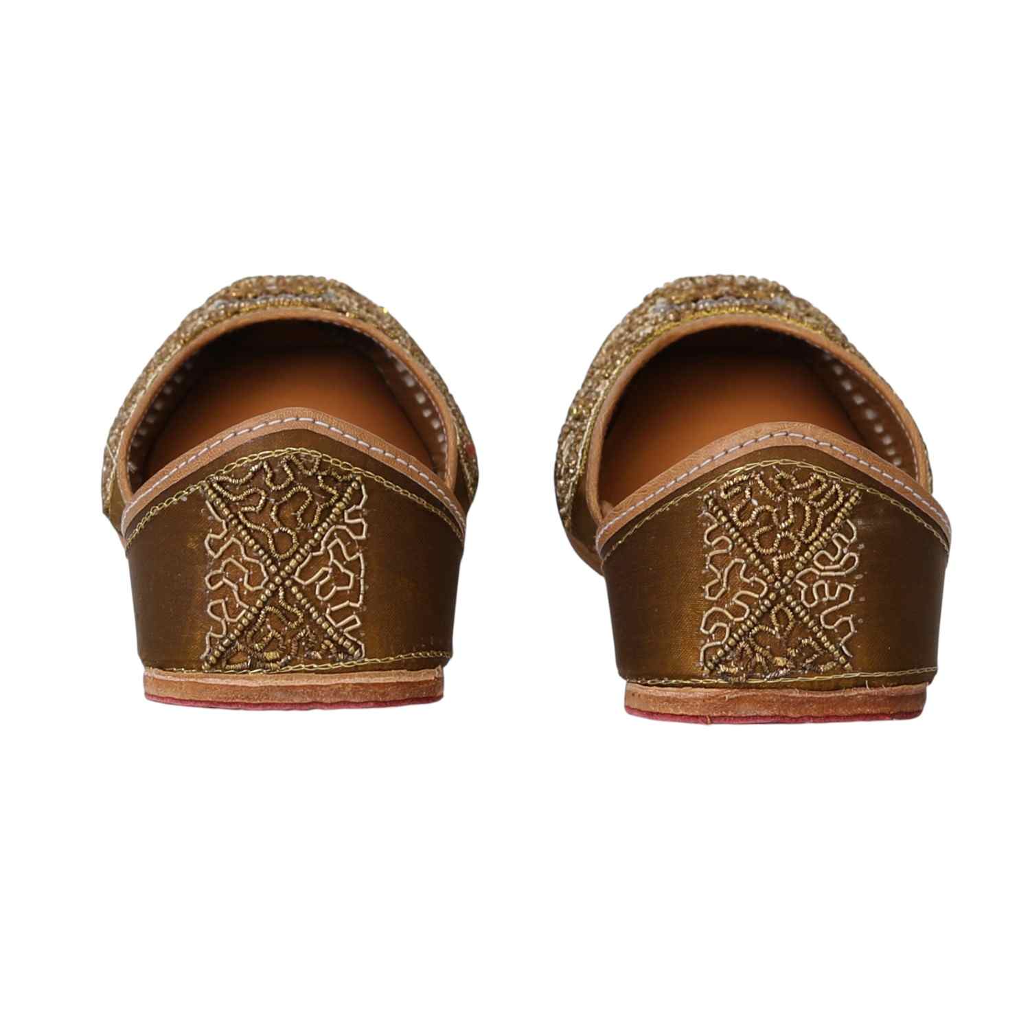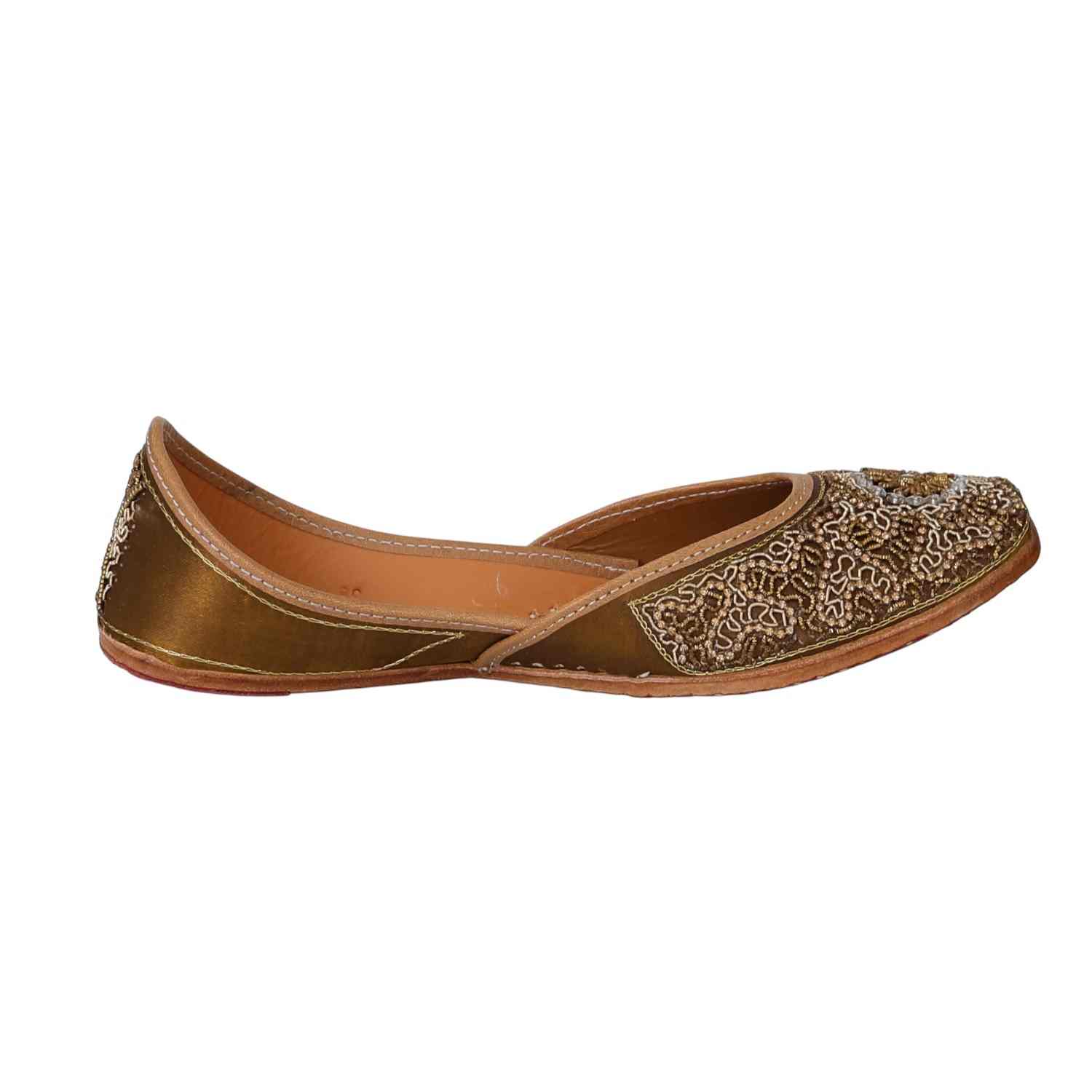 A statement handcrafted jutti featuring intricate thread and bead embroidery in shimmering bronze and silver tones. The rich detailing adds a regal touch, making it a perfect choice for weddings, festive evenings, and traditional celebrations. Designed with comfort and elegance in mind, this pair beautifully blends heritage artistry with modern charm.