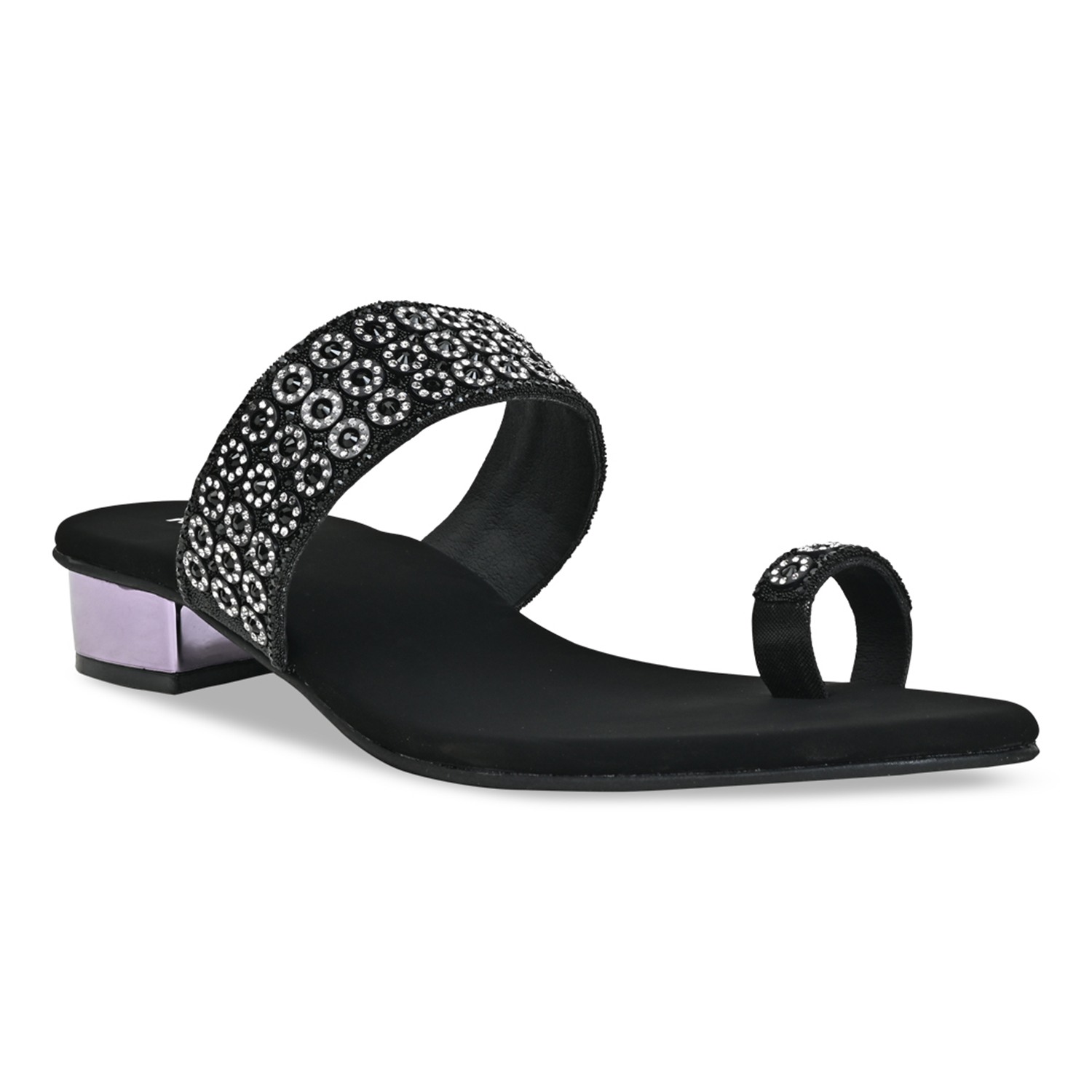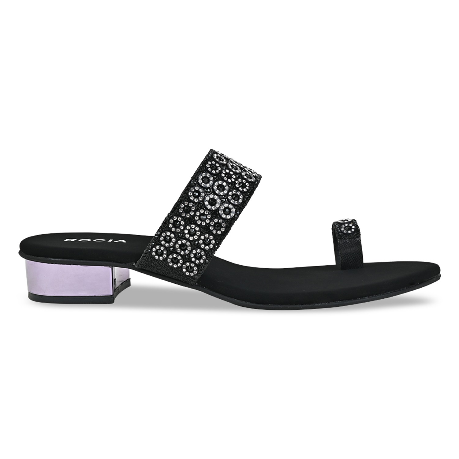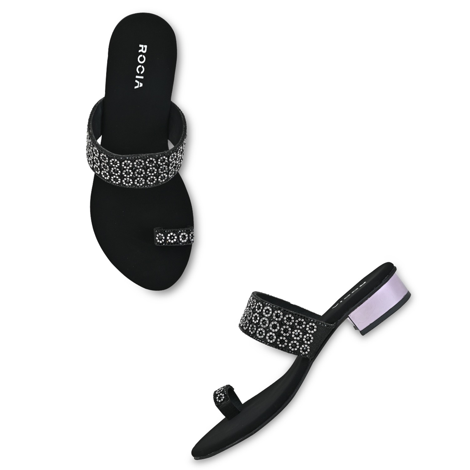 Comfortable Rocia Diamond Studded Low Box Heel One-Toe Sandals. These versatile ethnic sandals featuring straps adorned with glitter and diamonds will add sparkle to your oufits like salwars and sarees. Heel Height : 1.5 inches