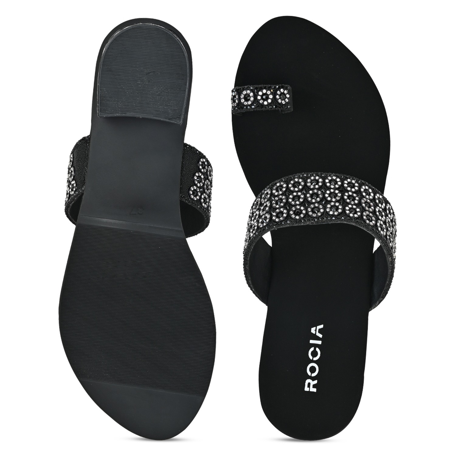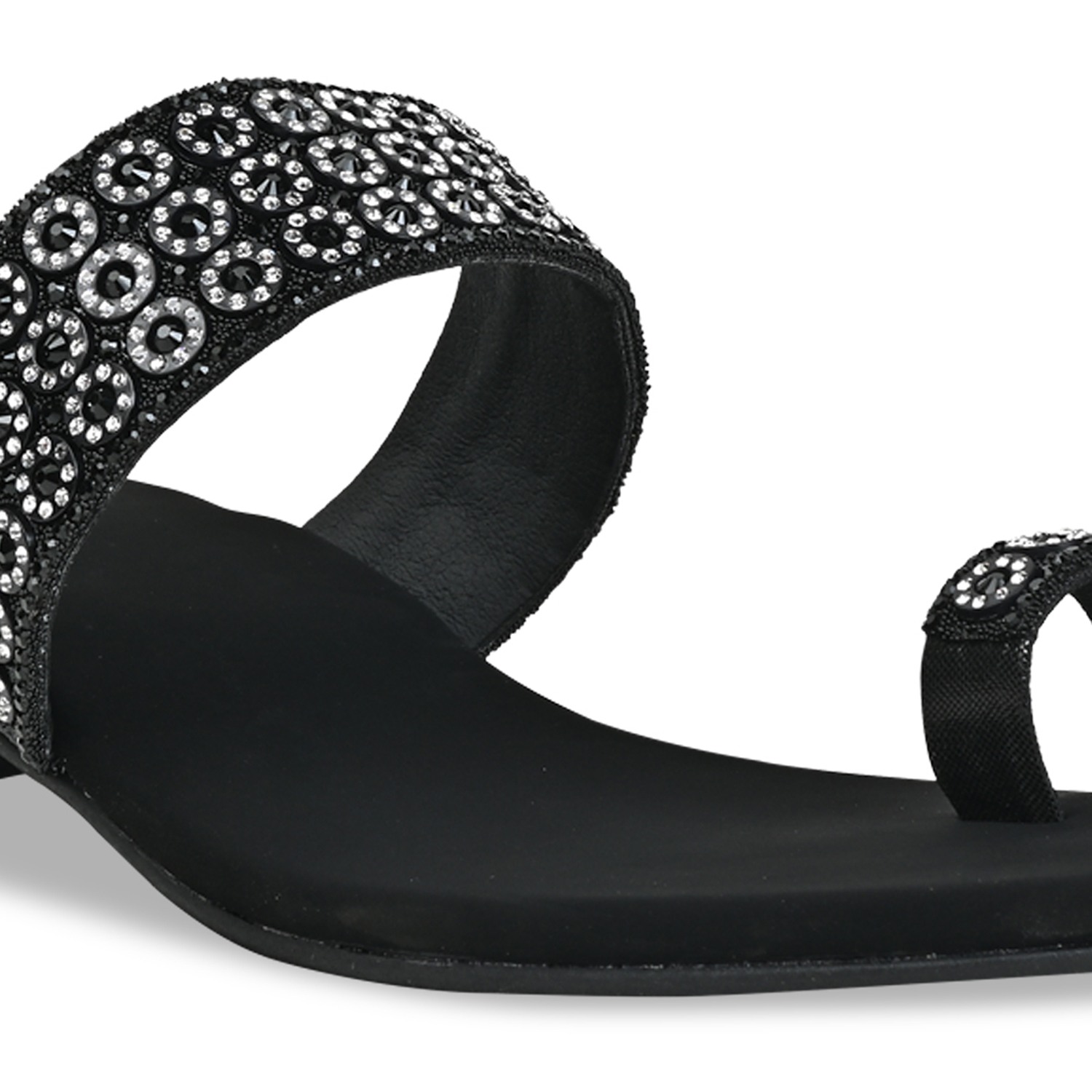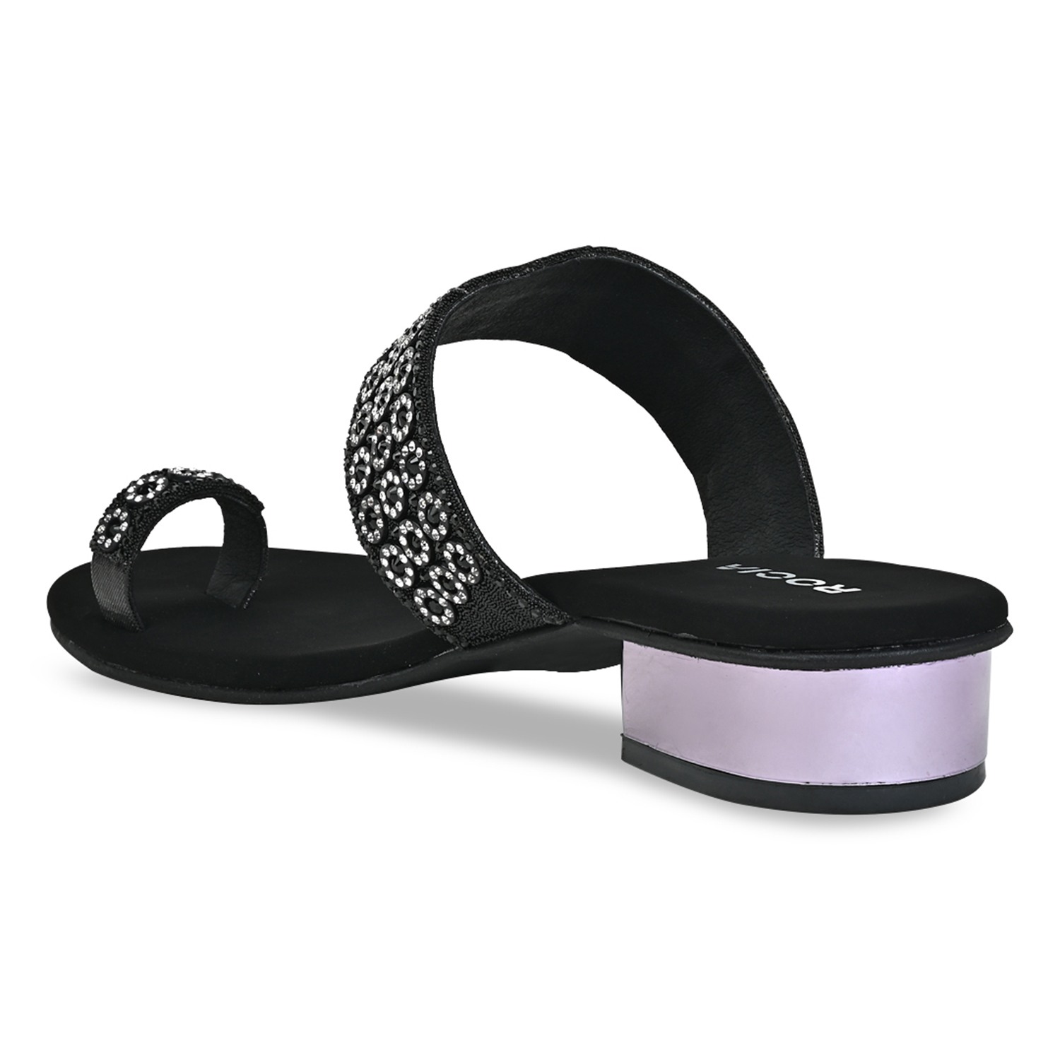 Comfortable Rocia Diamond Studded Low Box Heel One-Toe Sandals. These versatile ethnic sandals featuring straps adorned with glitter and diamonds will add sparkle to your oufits like salwars and sarees. Heel Height : 1.5 inches