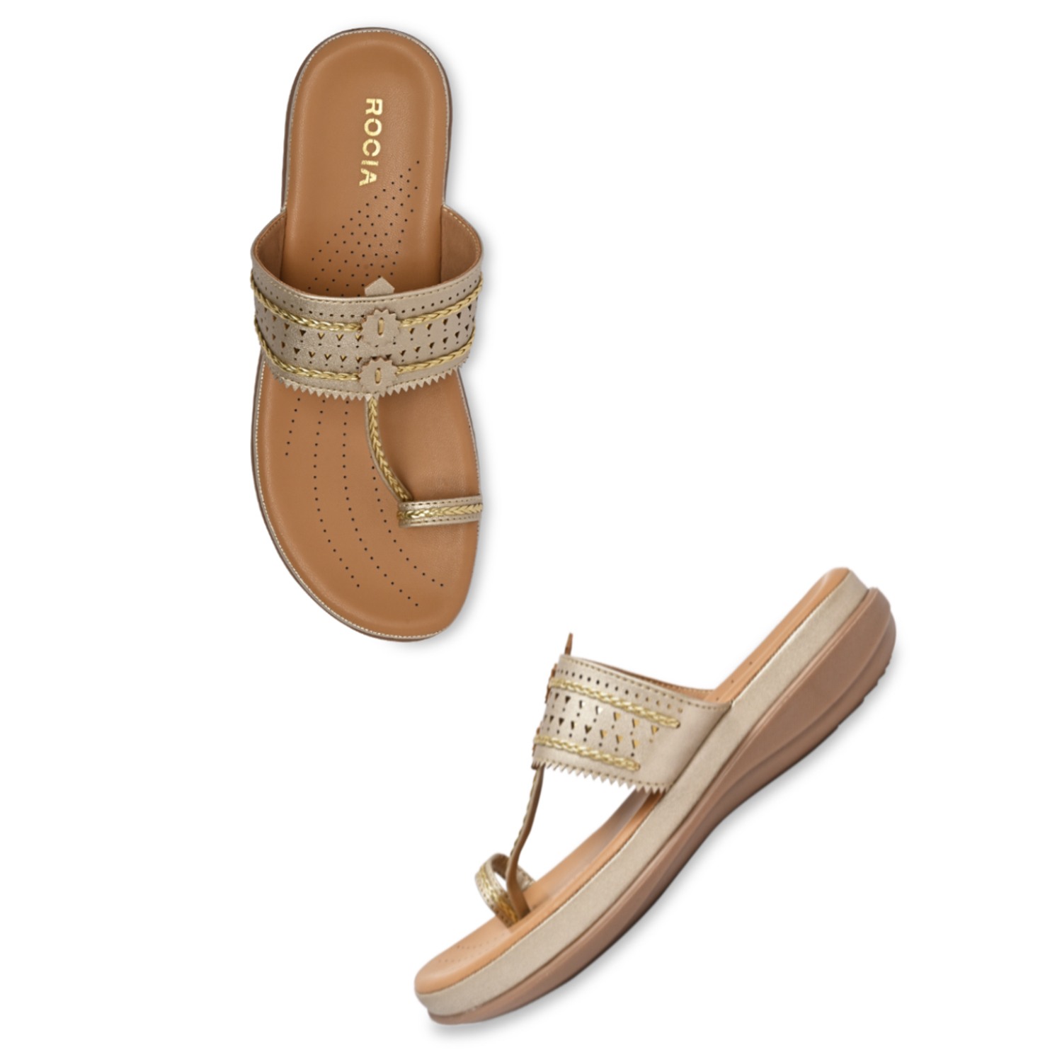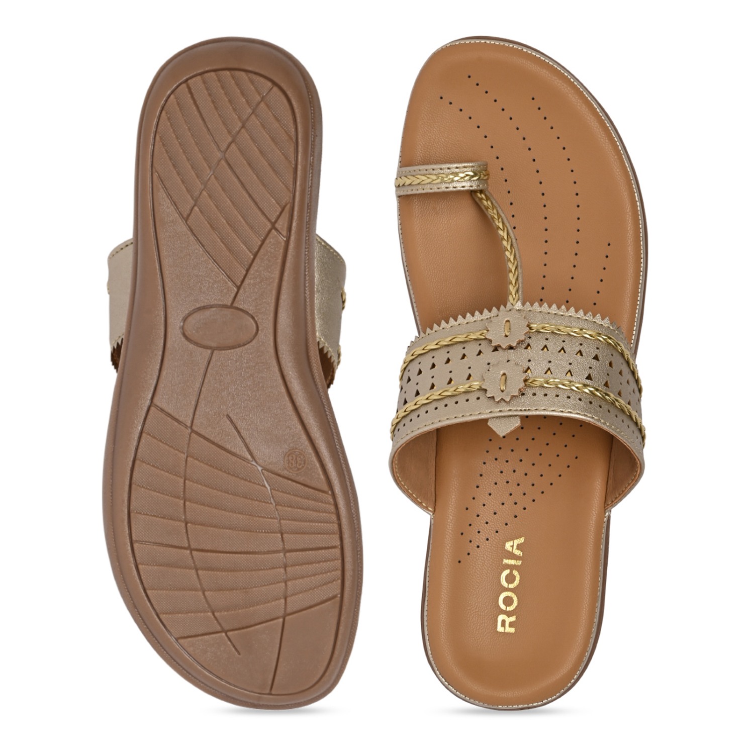 Elevate your casual footwear collection with the Rocia Women Kolhapuri Flat Comfort Sandals. Designed to blend traditional Indian craftsmanship with contemporary comfort, these soft soled sandals are perfect for the modern woman who values both style and ease. Heel Height: 1 inch