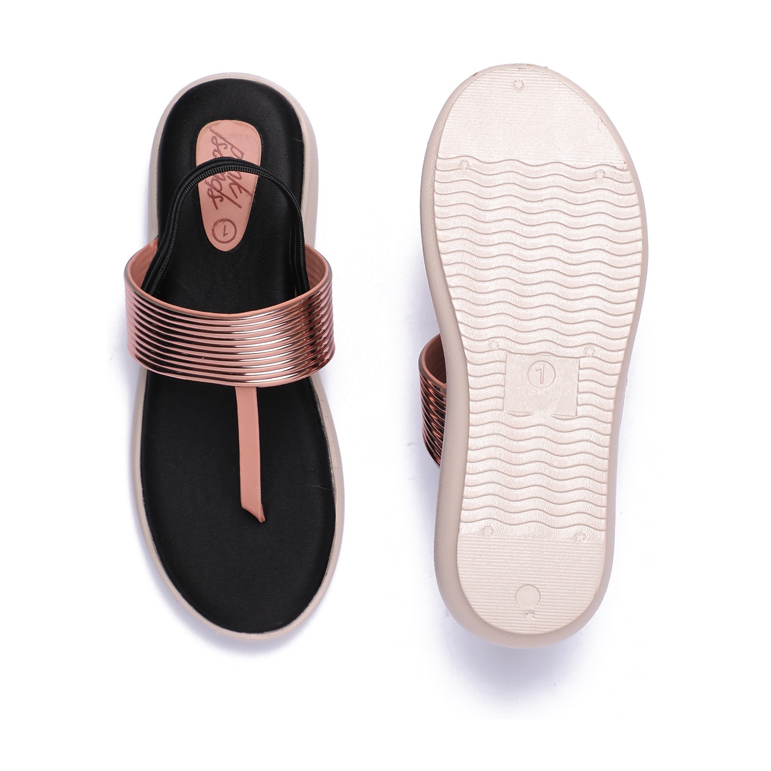 tep into style with these charming rose gold sandals, designed to add a touch of sparkle to any outfit. Featuring a glossy finish and elegant straps, they offer both comfort and flair. The cushioned sole and secure fit make them perfect for parties, casual outings, or special occasions. Stylish, comfy, and made to shine with every step.