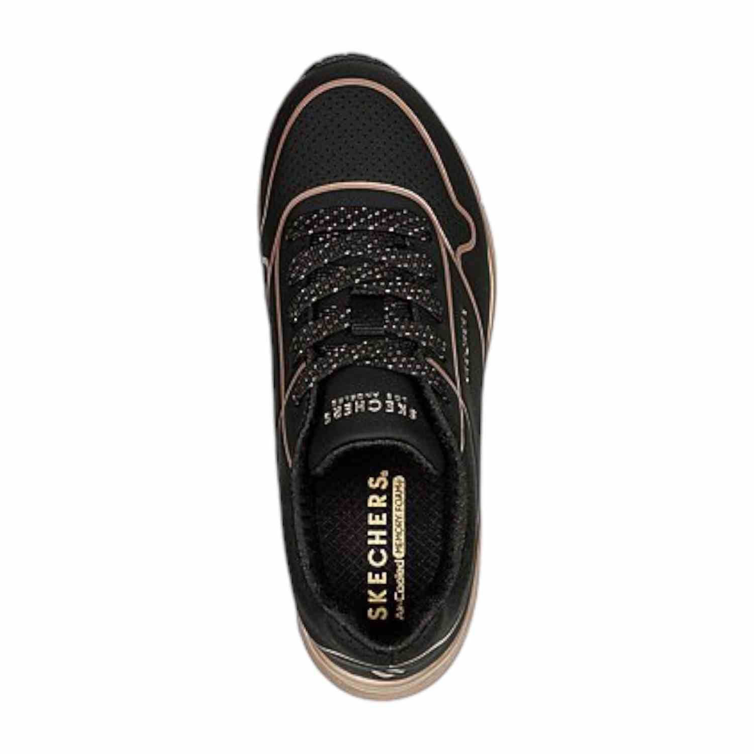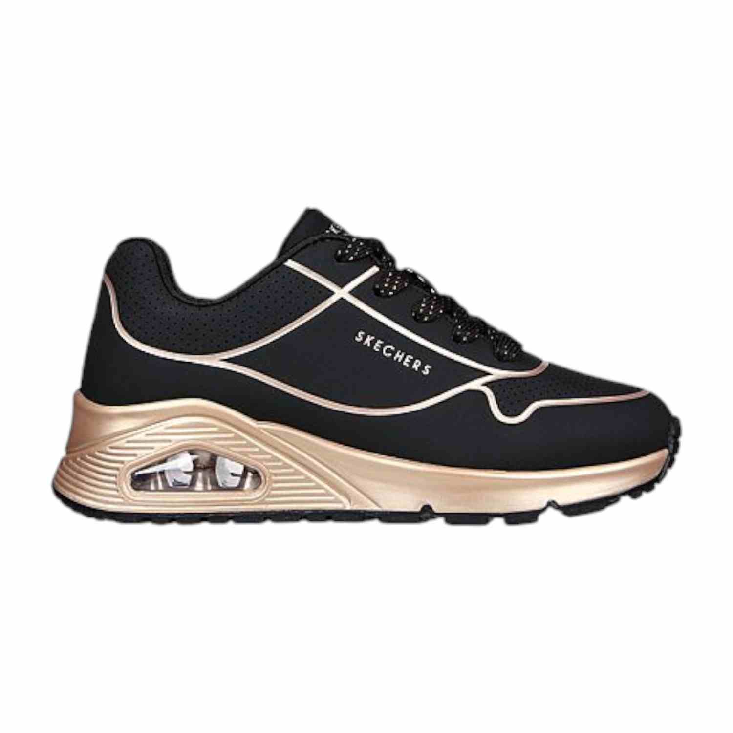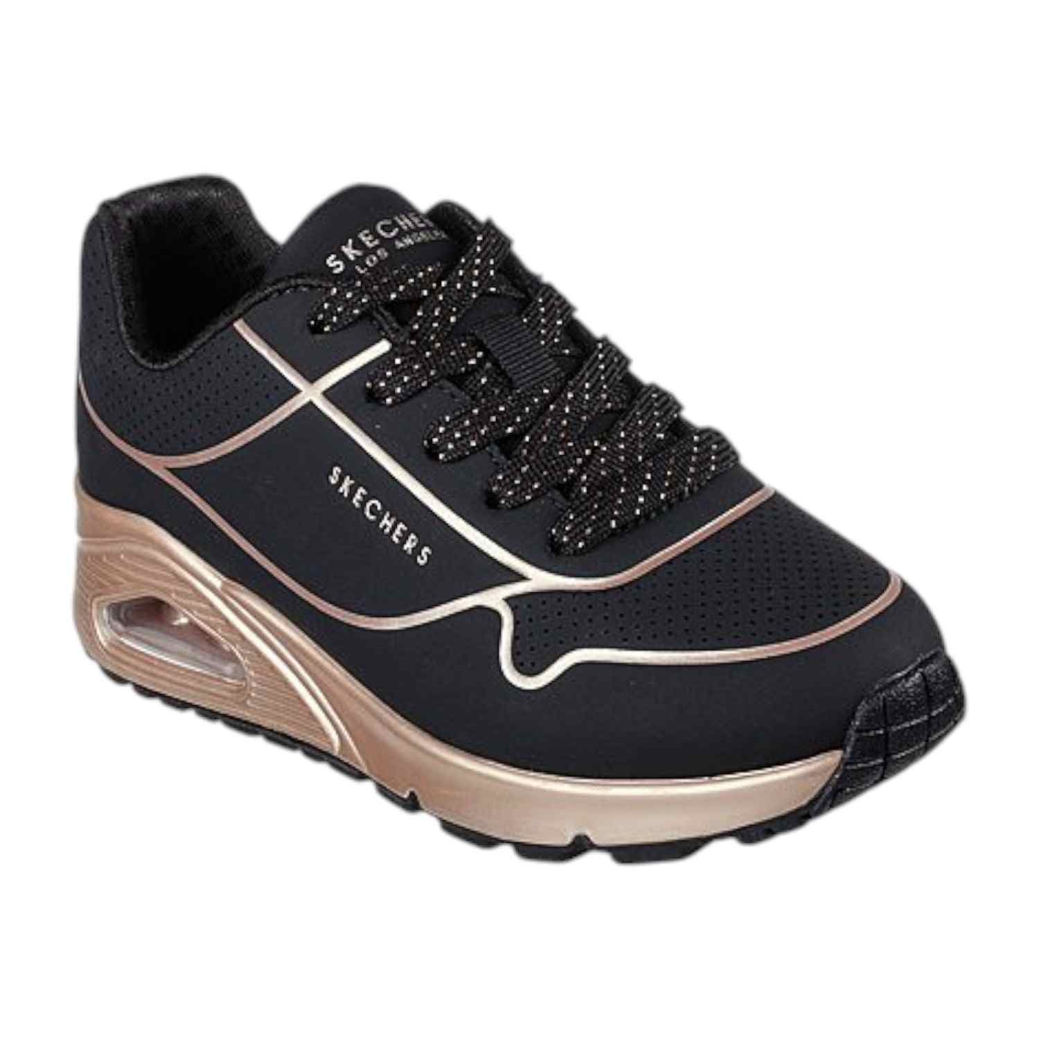 Classic air cushioned style meets updated comfort in the SKECHERS Uno Gen 1-Cool Heels. Smooth leather-textured synthetic upper with a metallicupper and perforation accents in a lace up classic jogger style sneaker. Air Cooled Memory Foam insole, visible air cushioned midsole.