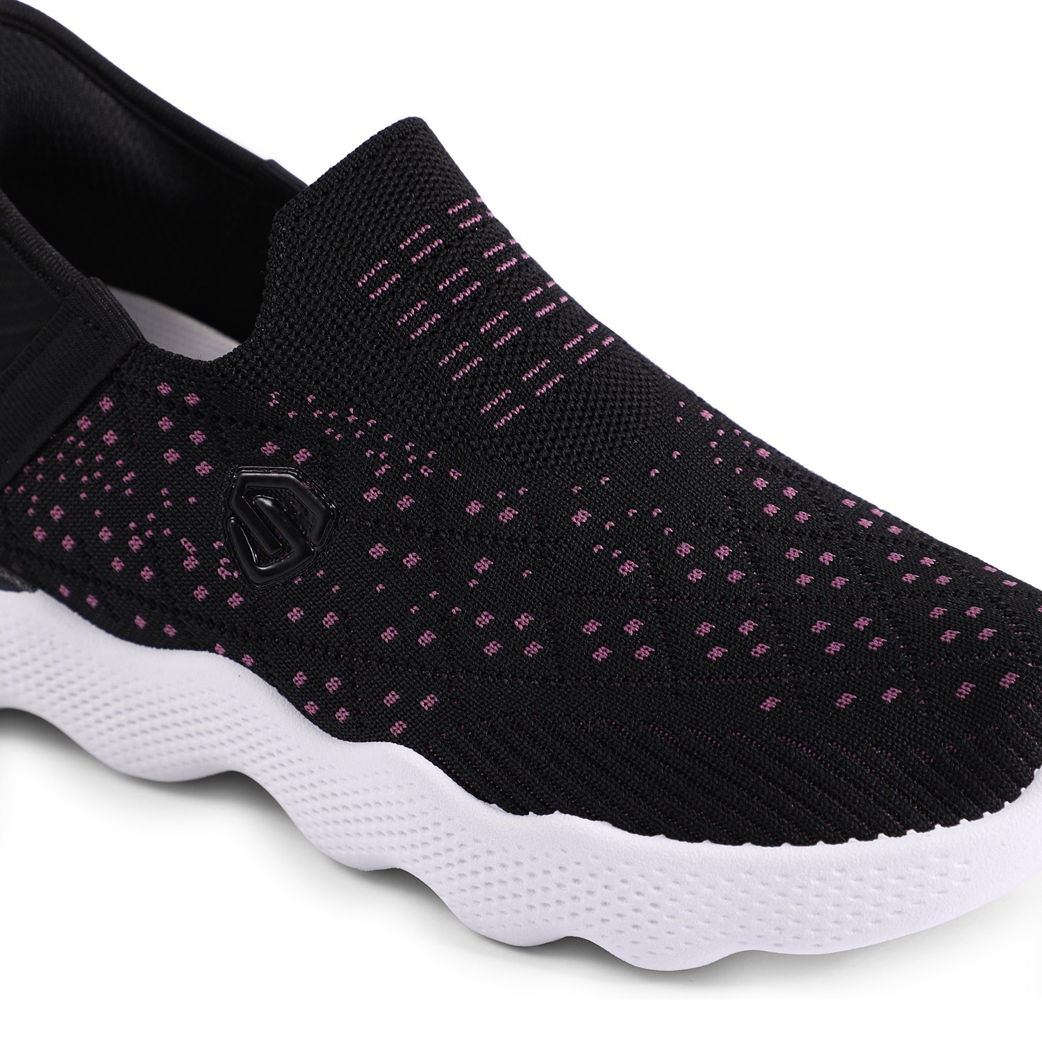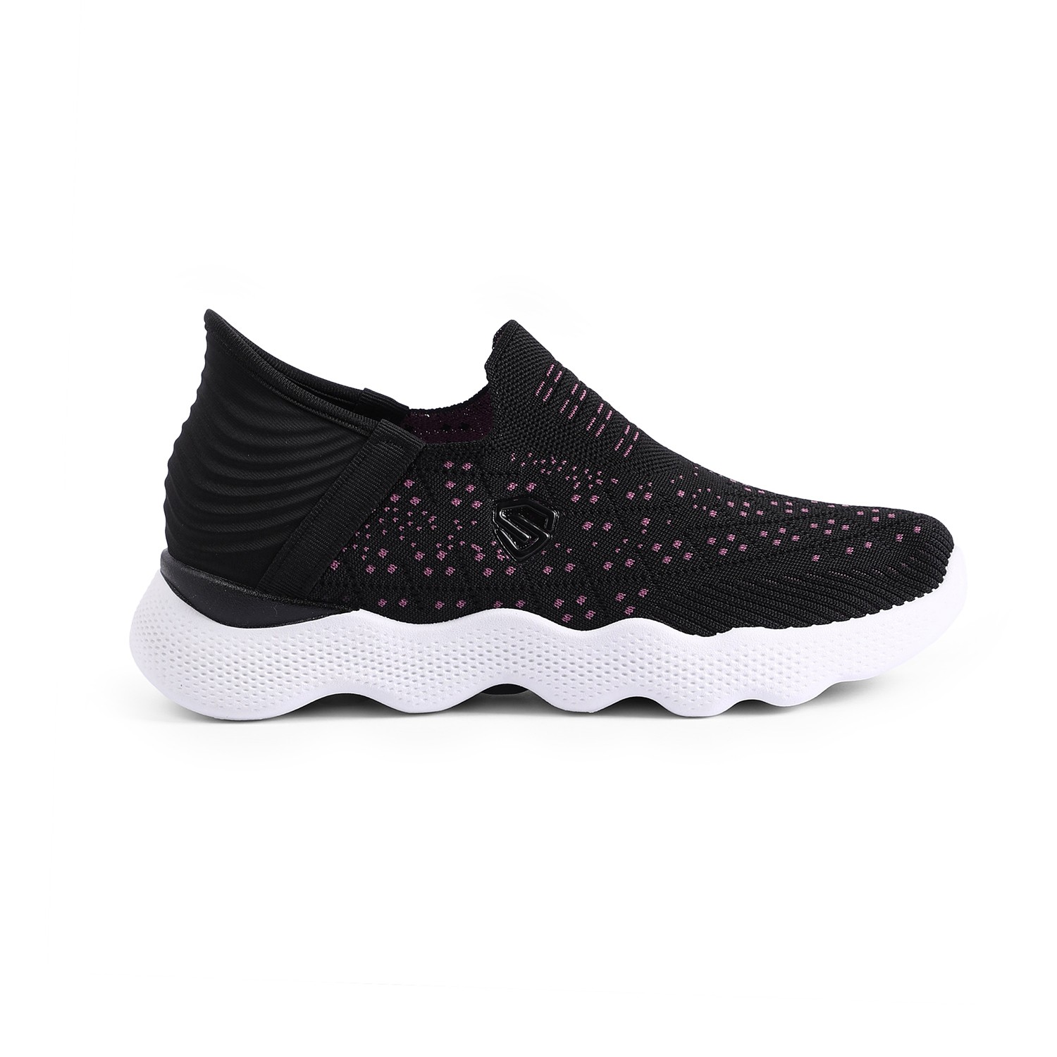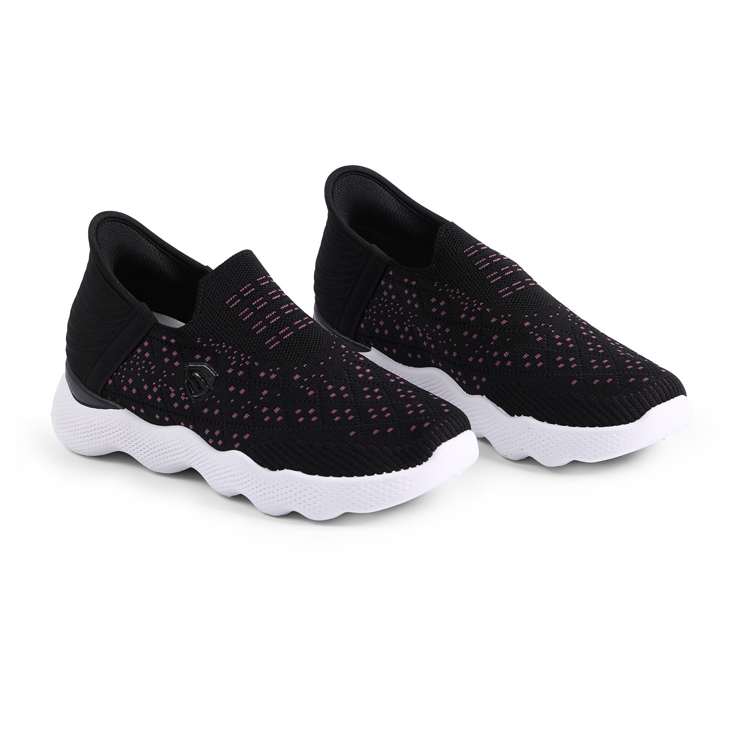 Step out in vibrant comfort with our Black Rose Knit Go-Walkers. These chic women's slip-on sneakers feature a breathable black knit upper, subtly infused with small, scattered pink square-shaped accents for a unique 'rose' effect. The thick, sculpted white sole boasts a distinctive wavy texture, providing exceptional cushioning and a dynamic athletic look. Perfect for daily strolls, light activities, or adding a stylish and supremely comfortable pop of color to your casual ensemble