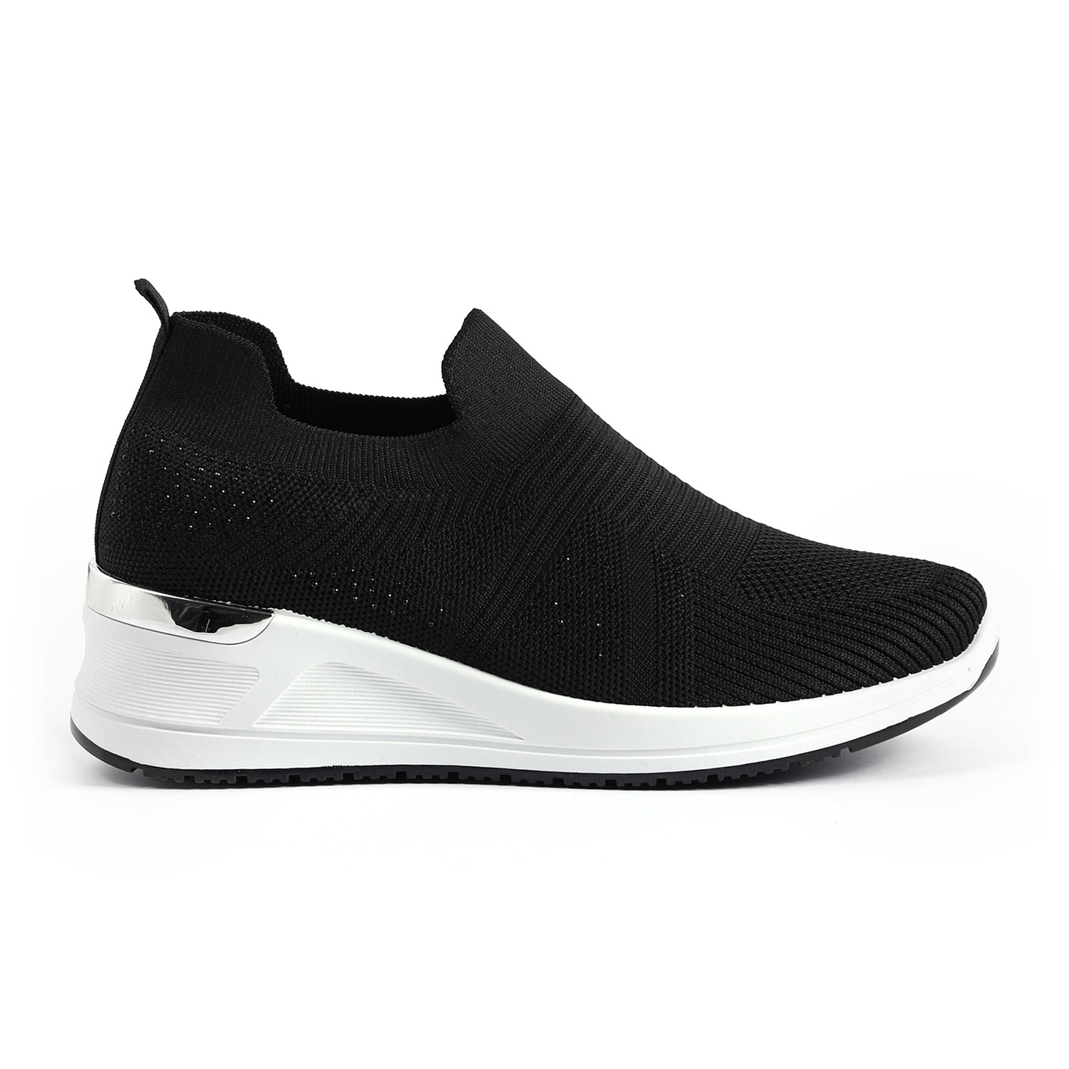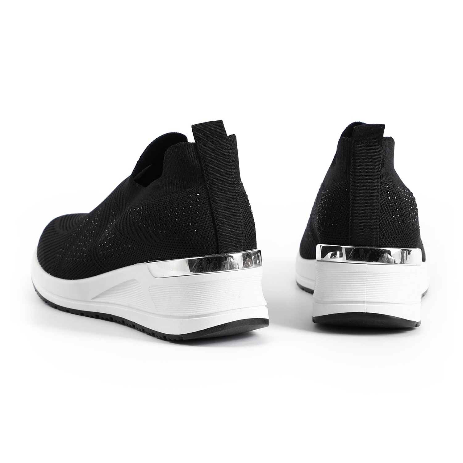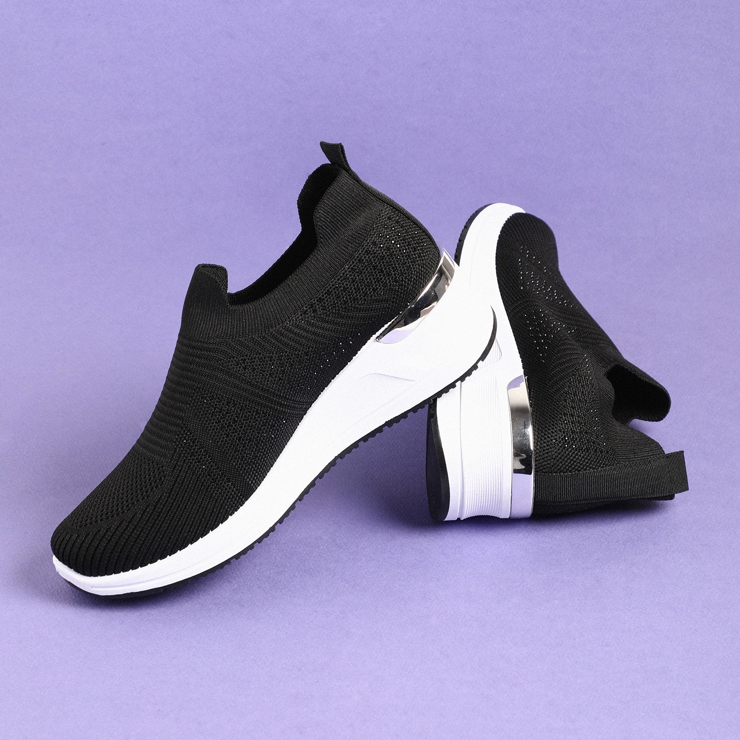 Stride in sophisticated comfort with our Midnight Glam Knit Walkers. These sleek women's slip-on sneakers feature a breathable black knit upper, perfectly complemented by a striking white chunky sole. A prominent metallic accent on the heel adds a touch of modern allure, ensuring you shine with every step. Ideal for dynamic daily wear, these walkers blend athletic design with glamorous detail for an effortlessly chic look
