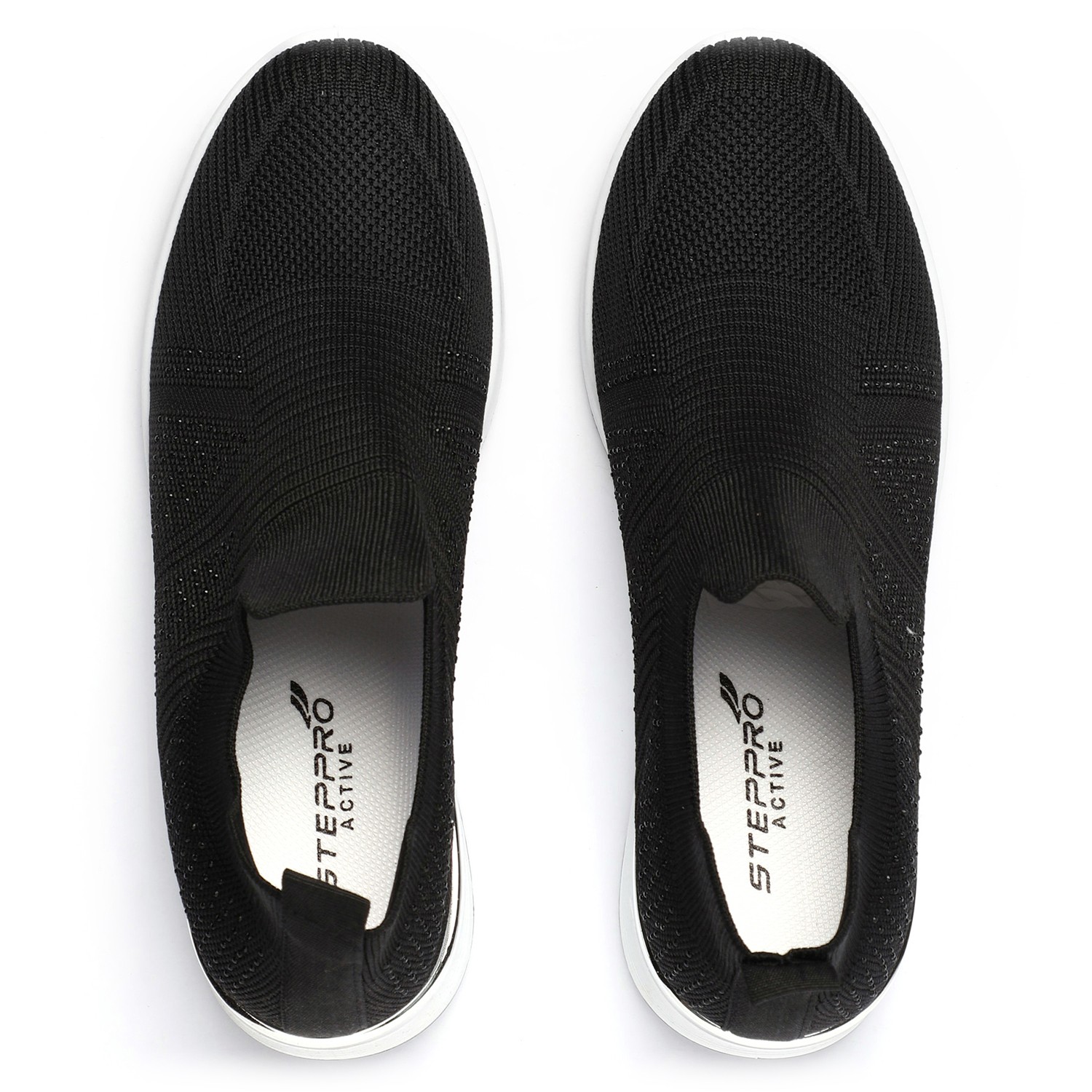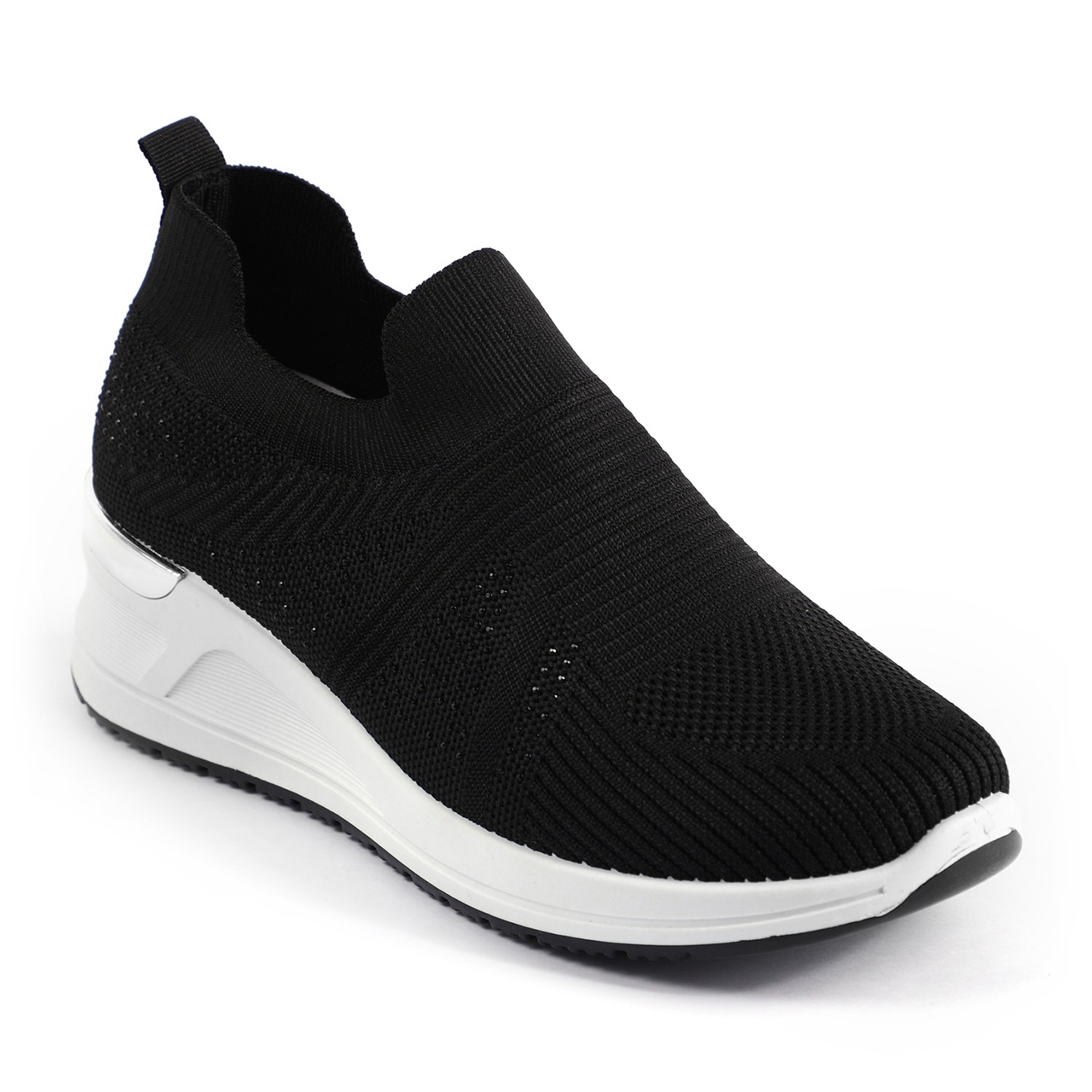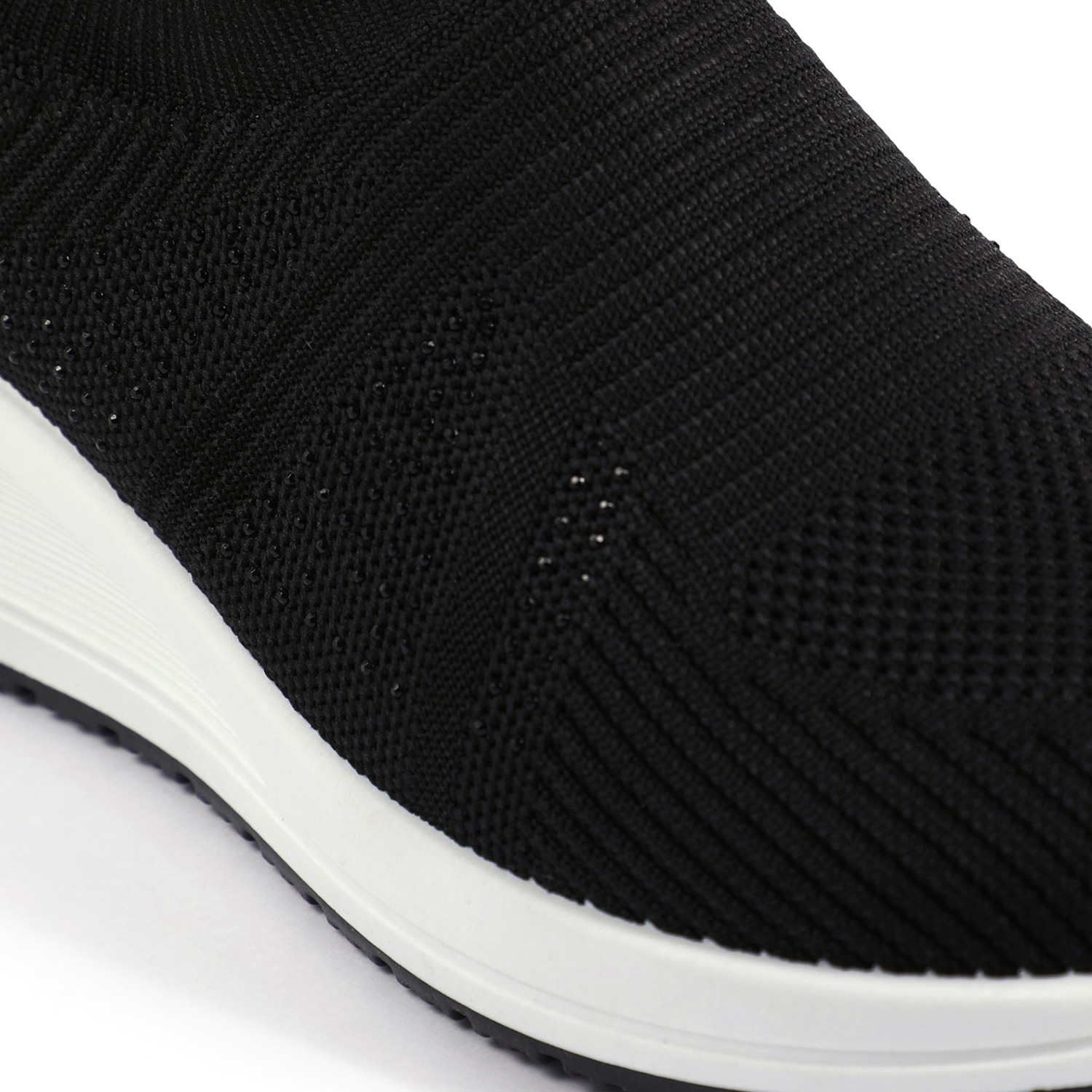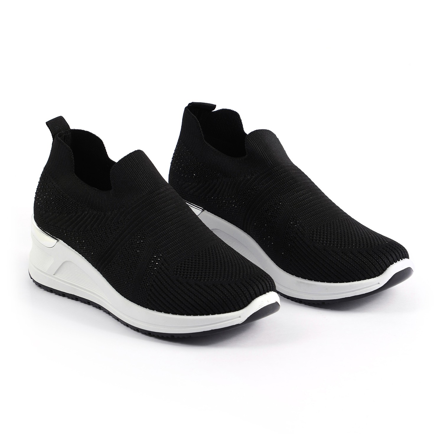 Stride in sophisticated comfort with our Midnight Glam Knit Walkers. These sleek women's slip-on sneakers feature a breathable black knit upper, perfectly complemented by a striking white chunky sole. A prominent metallic accent on the heel adds a touch of modern allure, ensuring you shine with every step. Ideal for dynamic daily wear, these walkers blend athletic design with glamorous detail for an effortlessly chic look