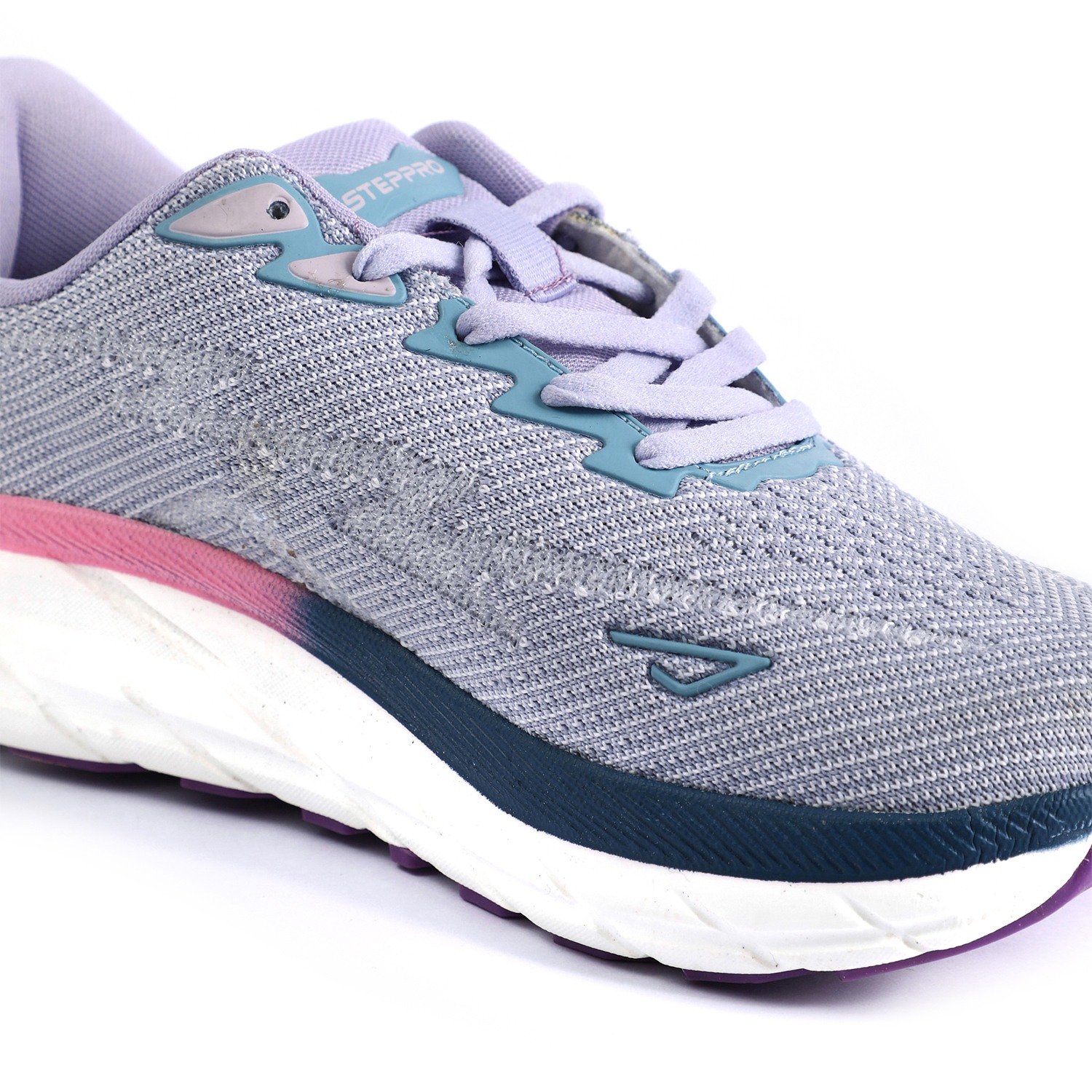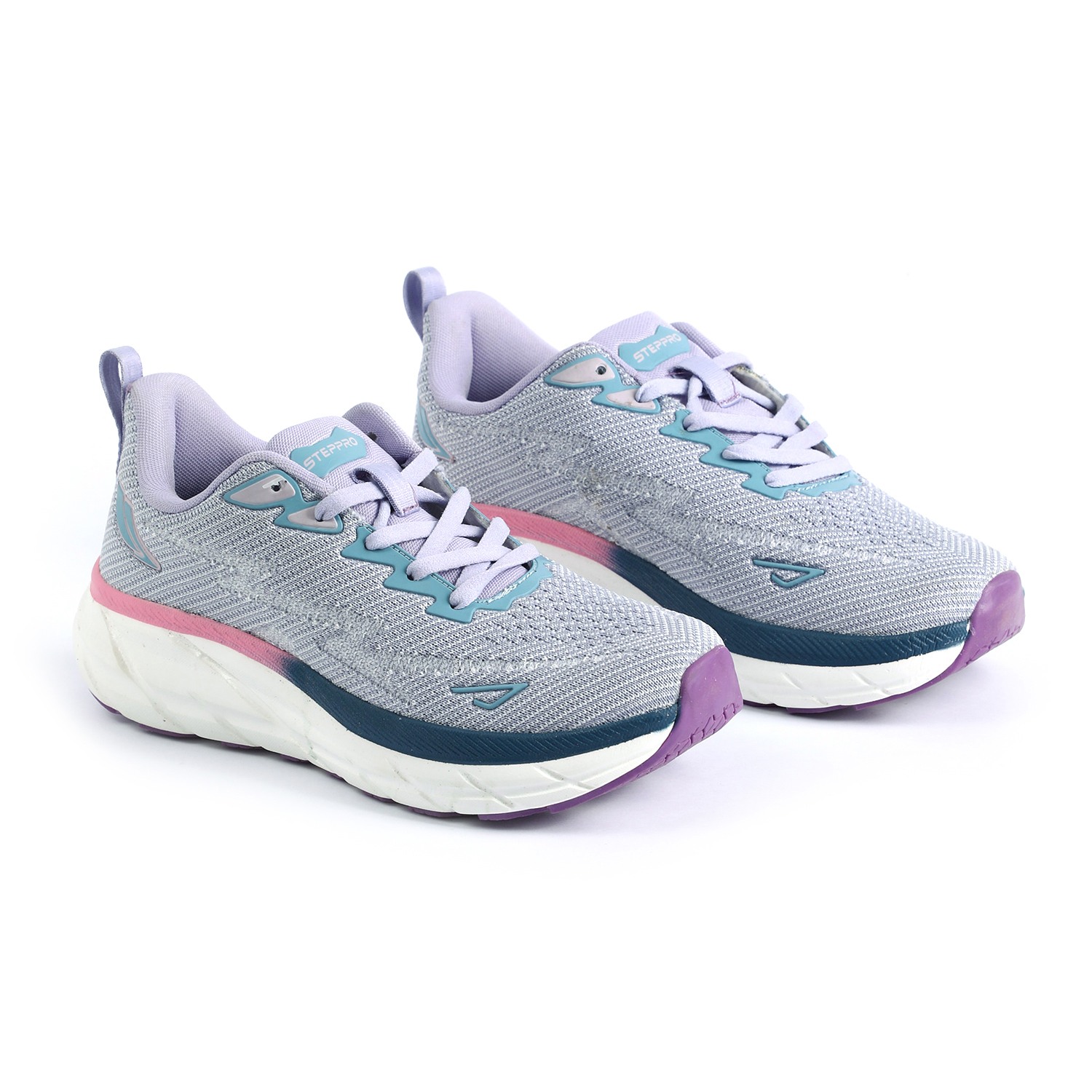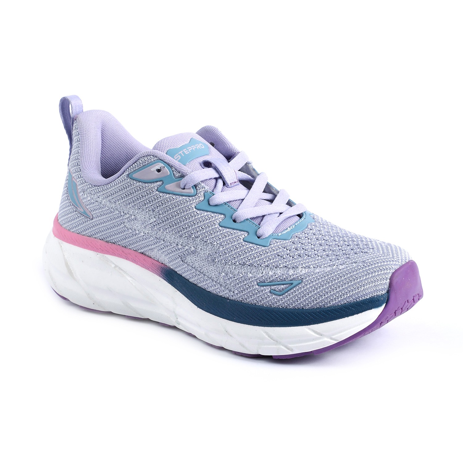 Step into vibrant comfort with our Lilac Fusion Walking Shoes. These women's lace-up sneakers feature a breathable knit upper in a soothing light purple or lavender hue, providing both structure and flexibility. The chunky, sculpted white sole showcases a dynamic 'fusion' of colors, with stylish pink and dark blue/teal accents, and a contrasting purple outsole for enhanced grip. With 'STEPPRO' branding on the tongue, these shoes are designed to offer exceptional cushioning and support, making them perfect for active lifestyles, workouts, or adding a modern athletic touch to your casual ensemble