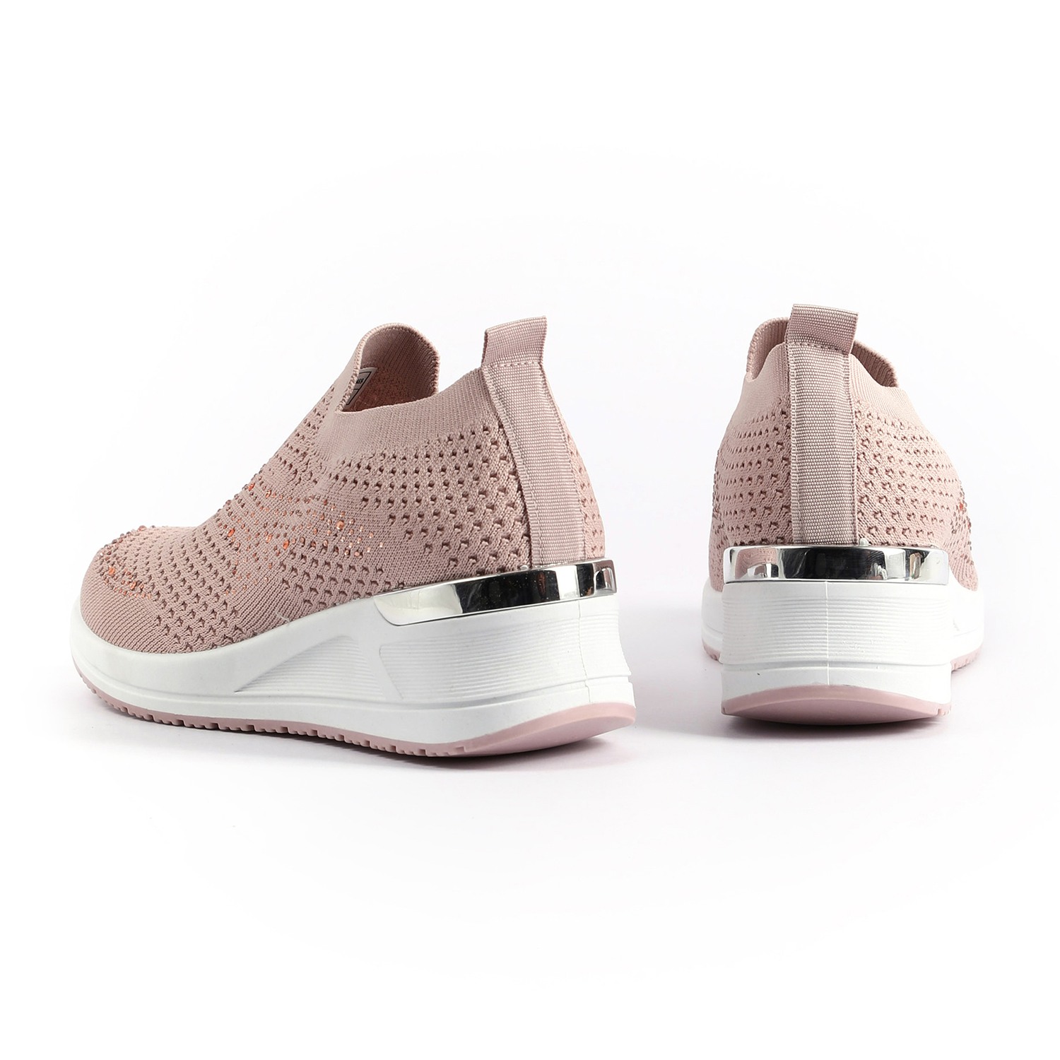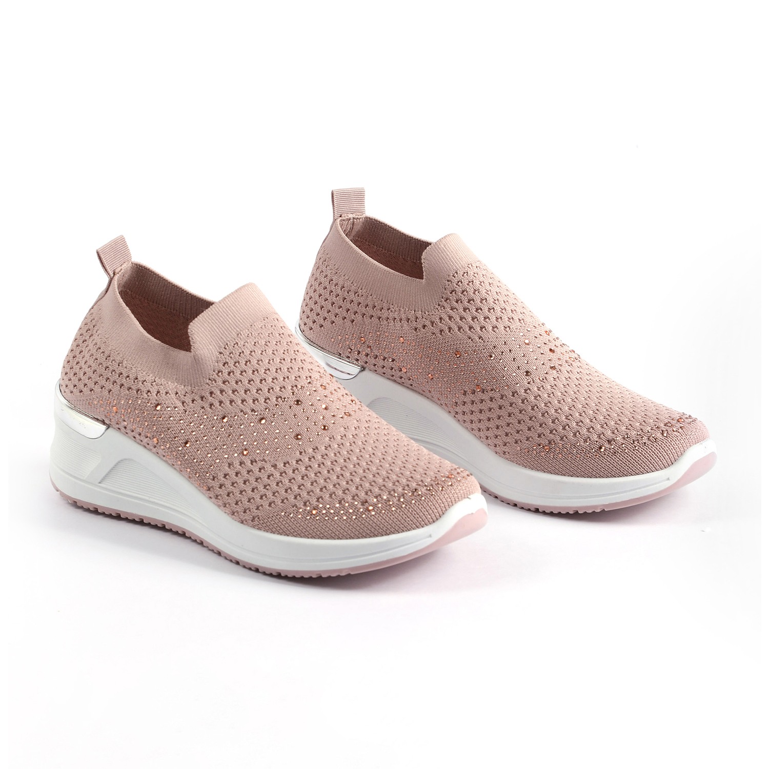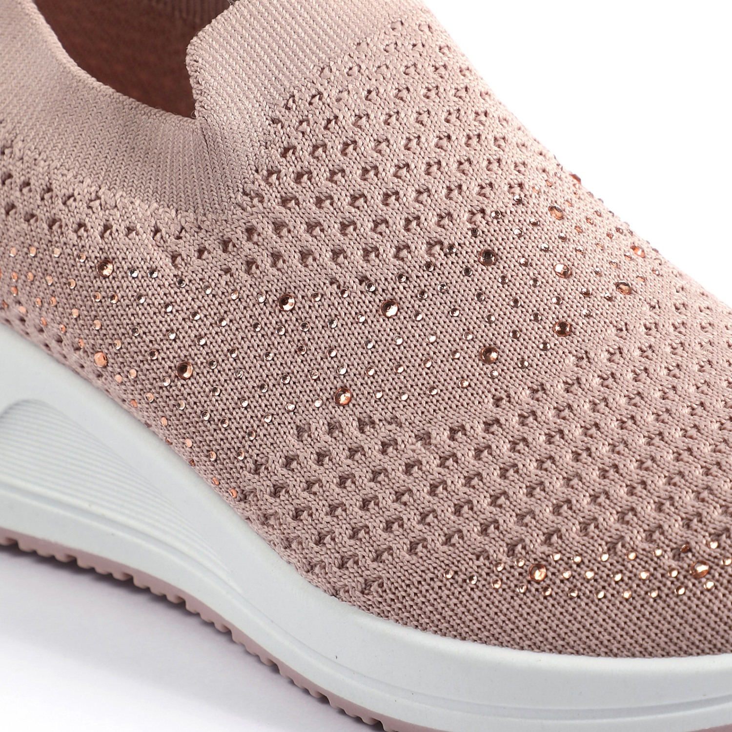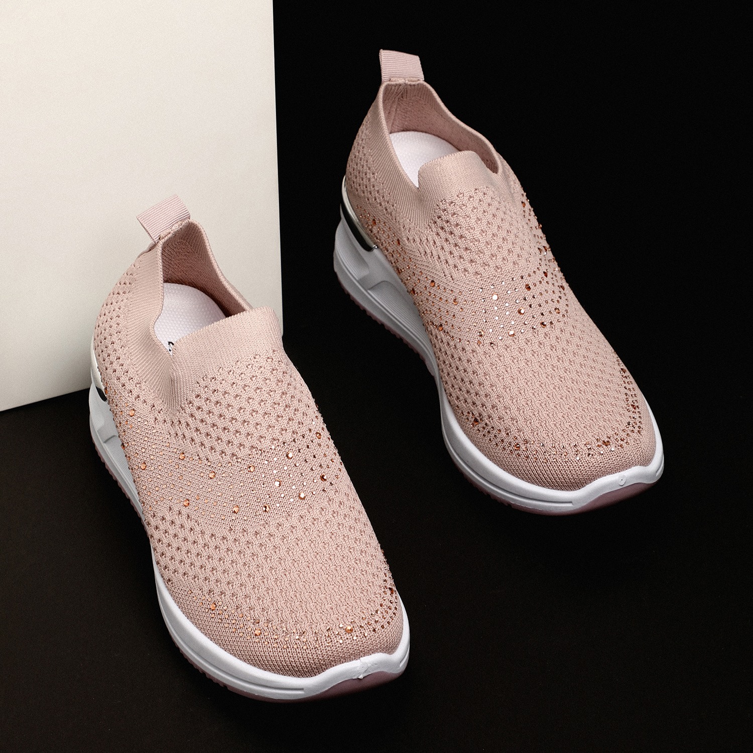 Step out in brilliant style and plush comfort with our Dazzling Pink Comfort Sneakers. These women's slip-on knit sneakers feature a charming light pink hue, exquisitely adorned with sparkling rhinestones or embellishments across the upper for a truly dazzling effect. Designed for effortless wear, they are set on a chunky white sole with subtle black detailing, providing exceptional cushioning and support with every step. Perfect for adding a glamorous touch to your casual wardrobe while ensuring all-day ease